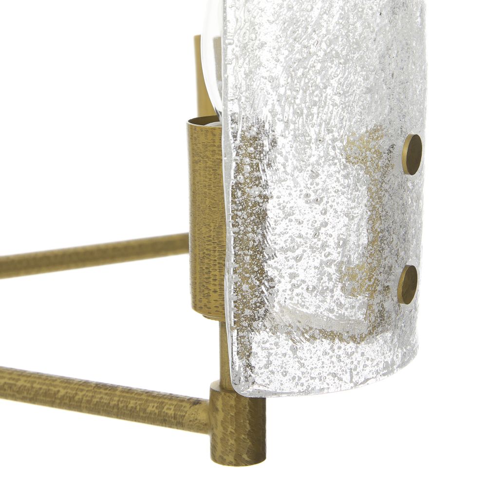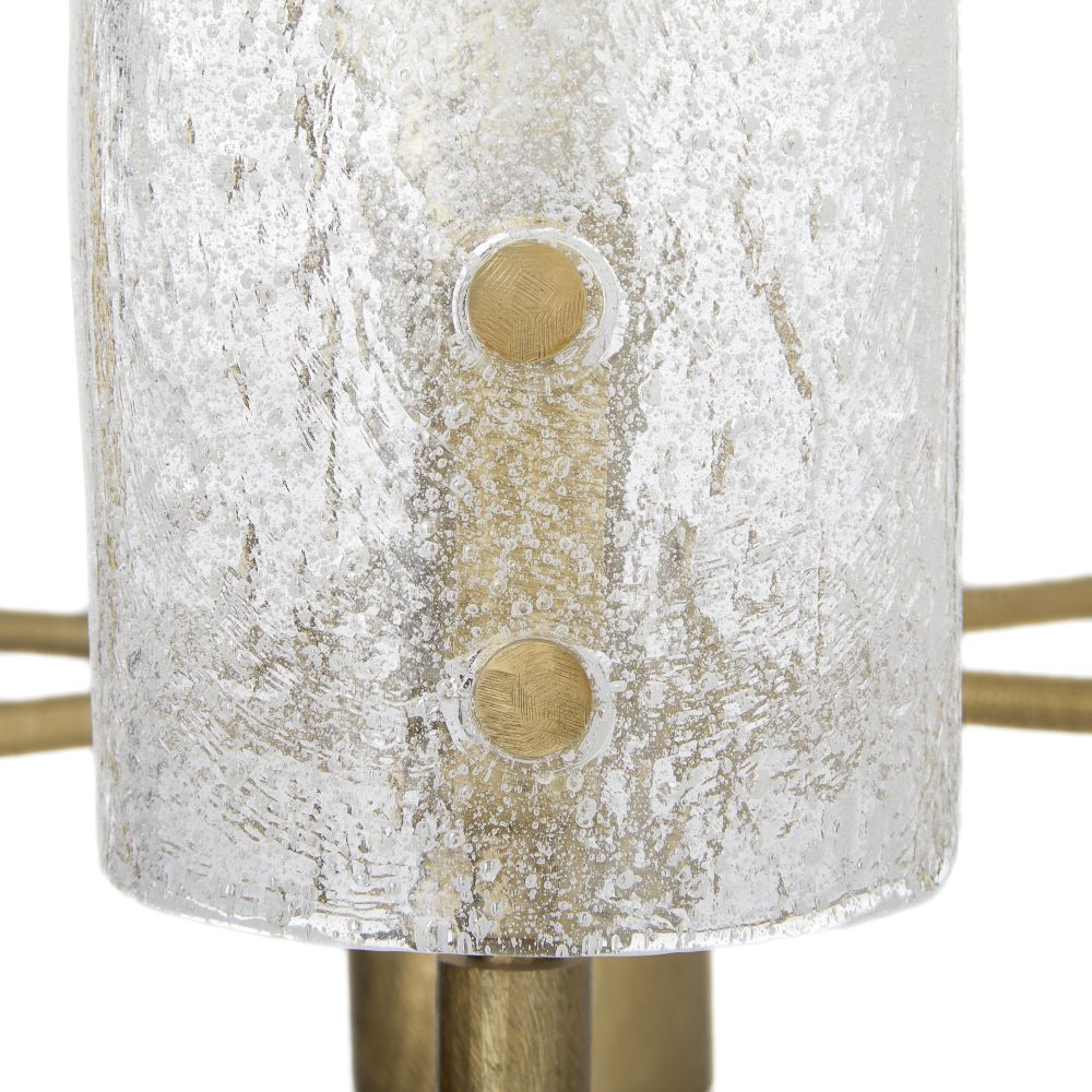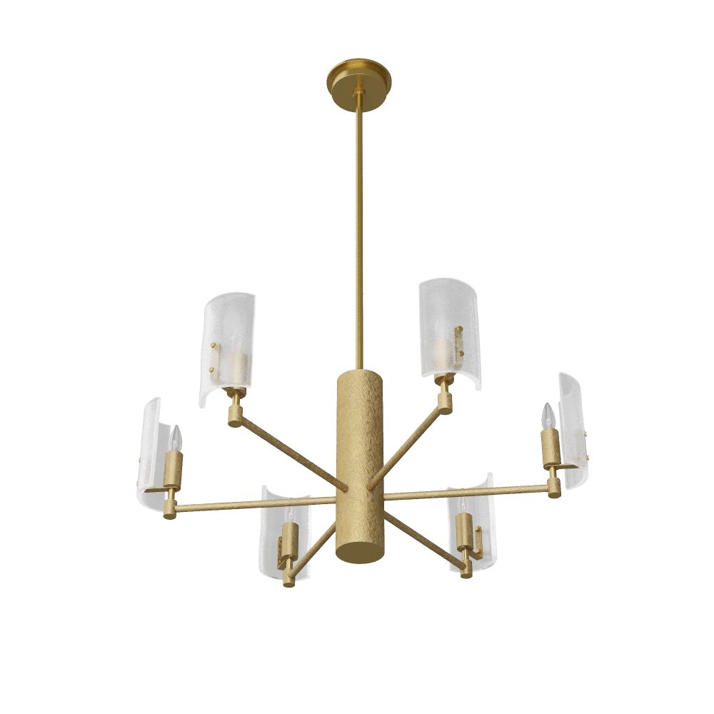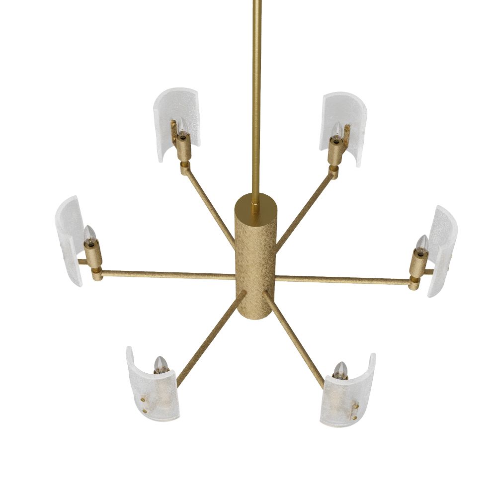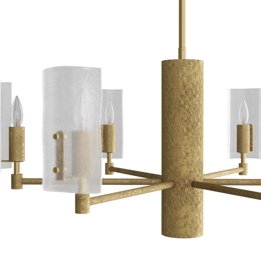 The Zeki Chandelier in Seedy Slump Glass from Arteriors Home features six half-cylinder shades adorned with antique brass decorative screws. Its antique brass body boasts a unique combination of smooth and chattered texture.