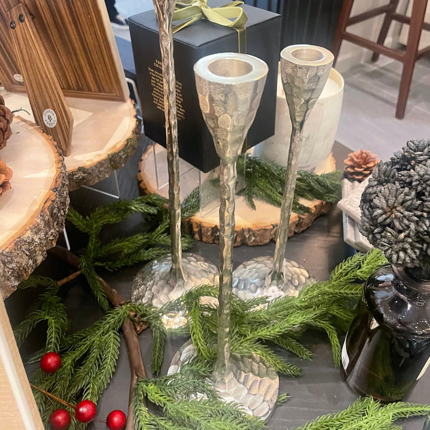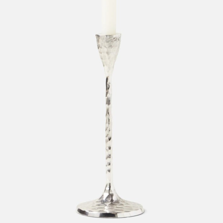 Illuminate dinners with the Alina Silver Candleholder Set from Blue Pheasant. Each piece has a hammered, slender silhouette and a textured, brilliant surface to enhance tabletops.