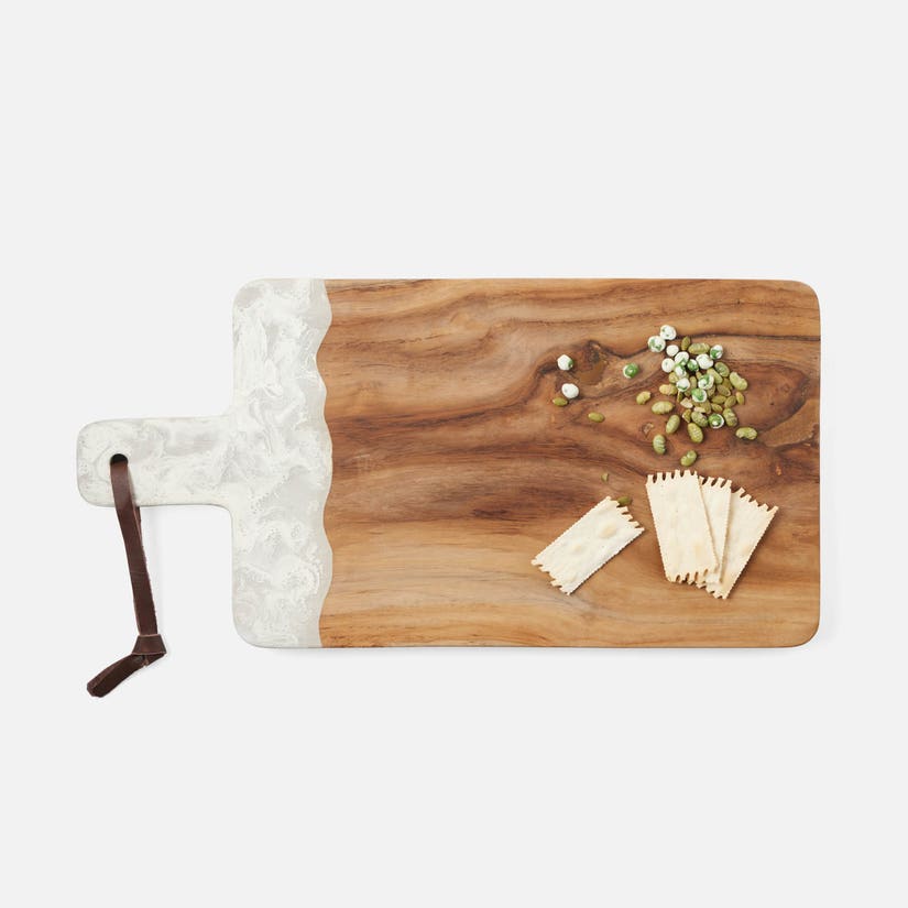 Teak and resin, two materials handcrafted together, bring a splash of color to any setting. The Austin White Swirl Large Serving Board from Blue Pheasant is available in unique two-tone, hand-dipped colors, no two cutting boards are exactly alike. Finished with a leather strap.
