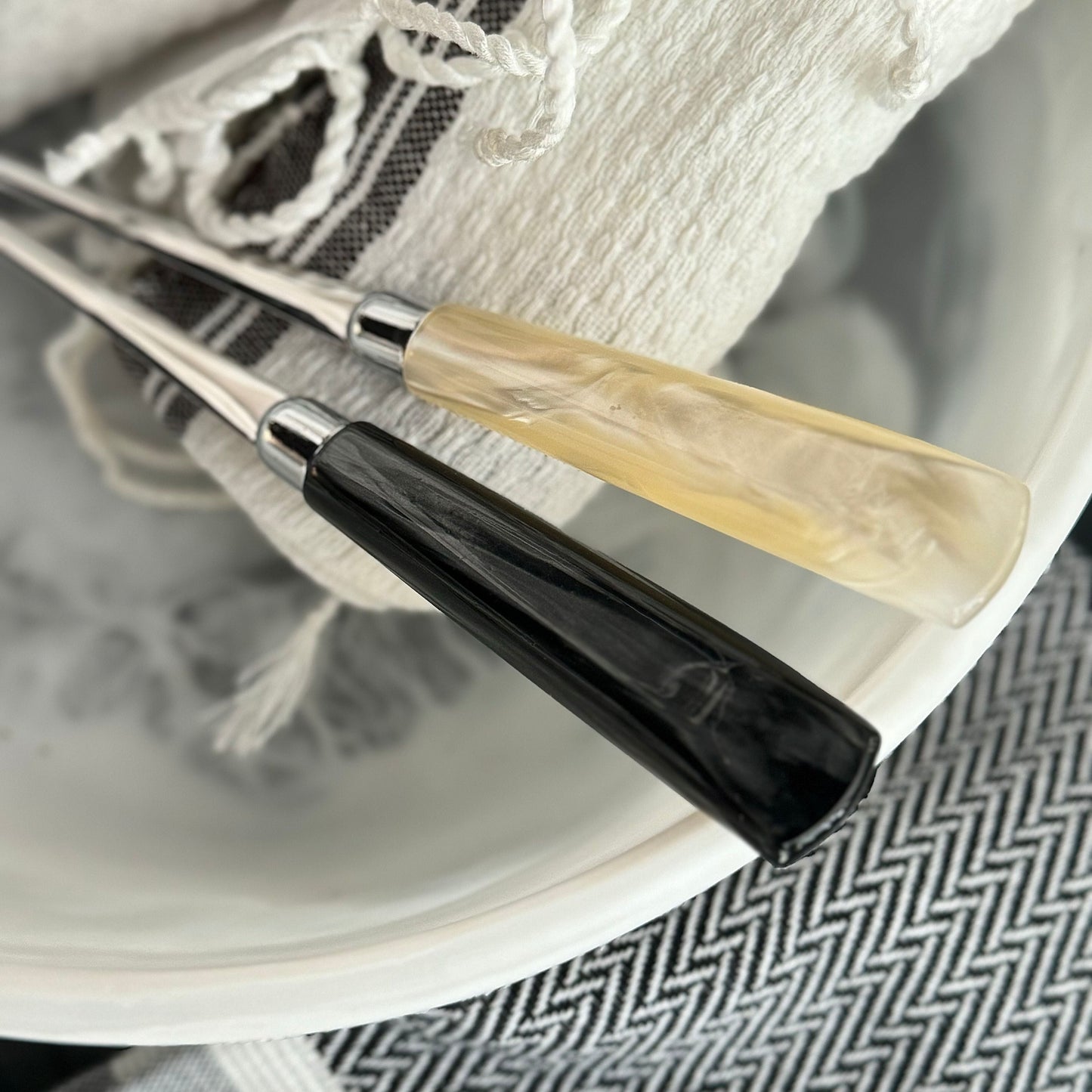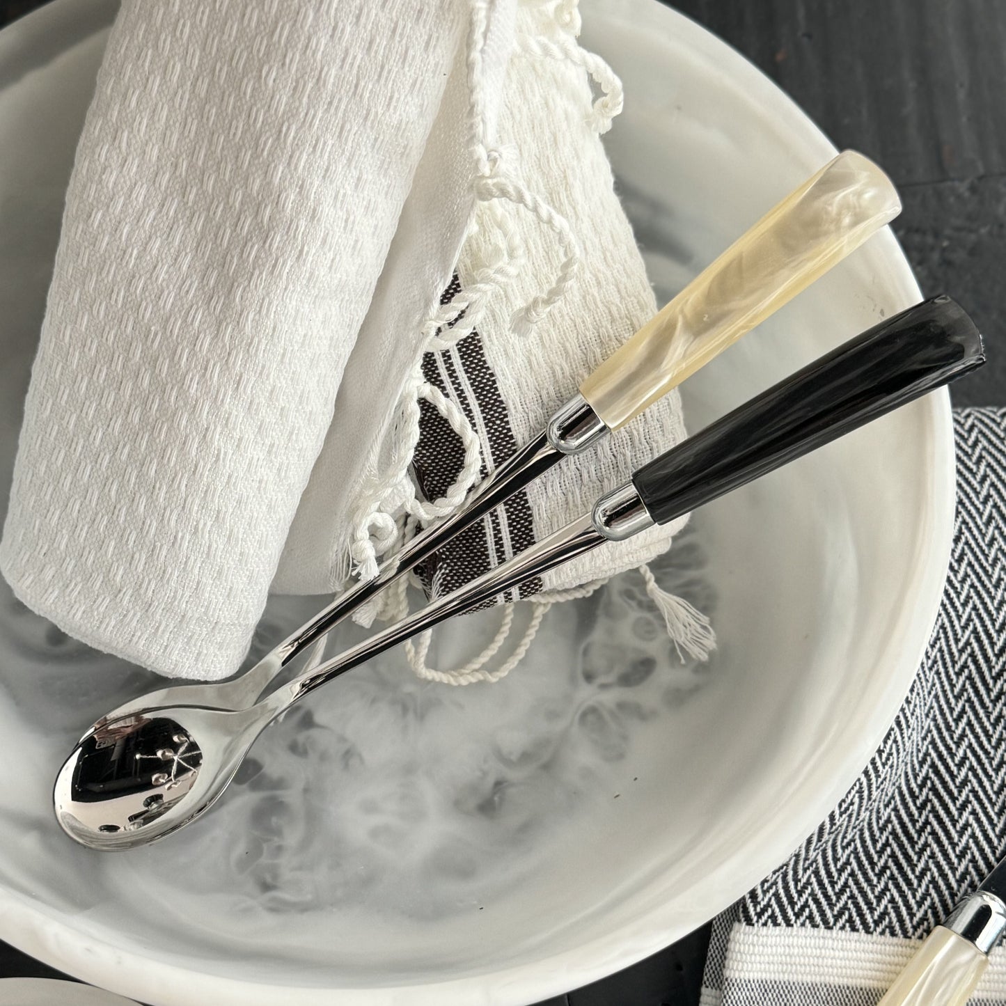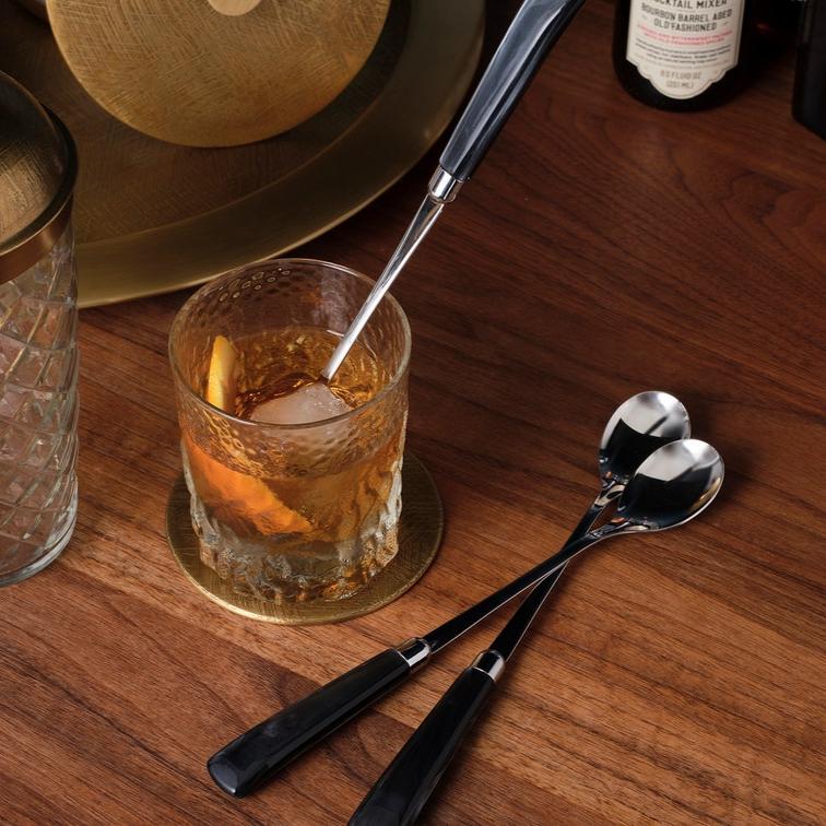 Crafted from versatile acrylic and sleek stainless steel, the Colson Cocktail Spoon Set in Black Acrylic from Blue Pheasant enhance a variety of tabletops with an iridescent shine.