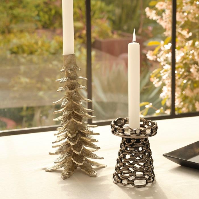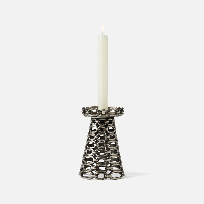 Bring in elements of texture and unique shapes with the Julius Nickel Candle Holder Set by Blue Pheasant. Each is crafted to hold both pillar and taper candles, forming a striking and functional piece. Wipe clean with soft, dry cloth.