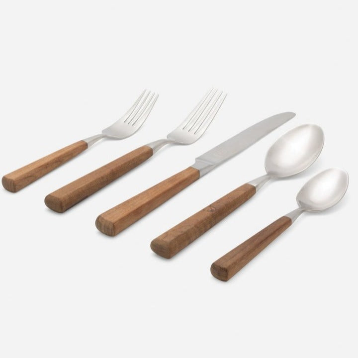 The genuine maple handle of Micah Maple Wood Flatware Set of 5 from Blue Pheasant feels warm in hand while contrasting with its sturdy stainless-steel construction.