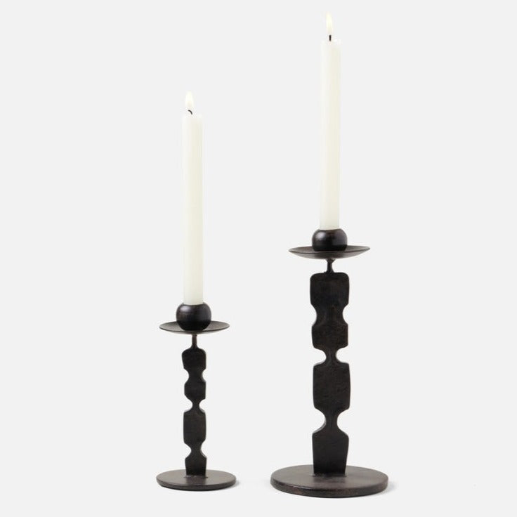 The Quentin Round Base Candle Holders Set in Antique Black from Blue Pheasant is blocky, spindly, and bold. The Quentin candlesticks are like modern sculptures. Sets of two iron pieces with antique black finish.