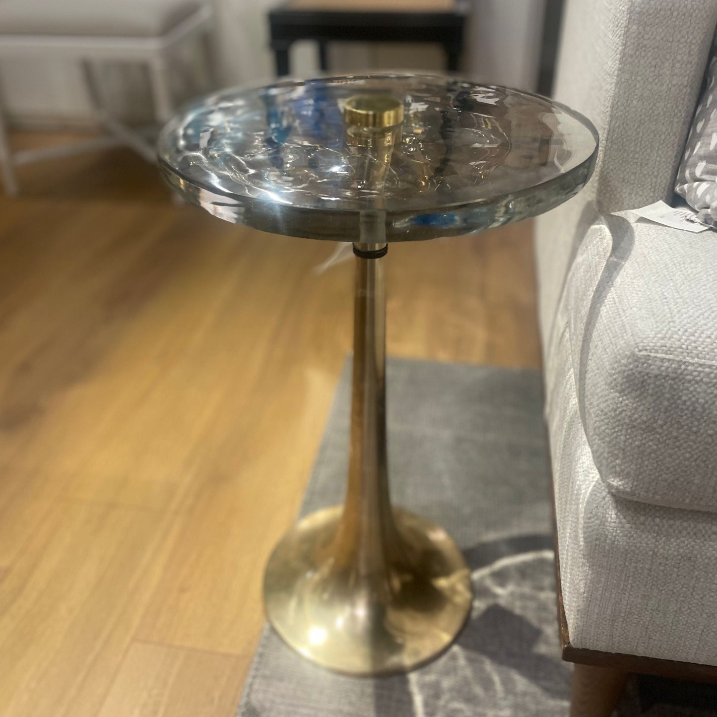 The Antonia Side Table by Villa & House features a hand-crafted sand-cast solid brass base and a thick, hand-polished glass top. Boasting exceptional craftsmanship, this sleek and stylish round accent table is the perfect addition to any home.