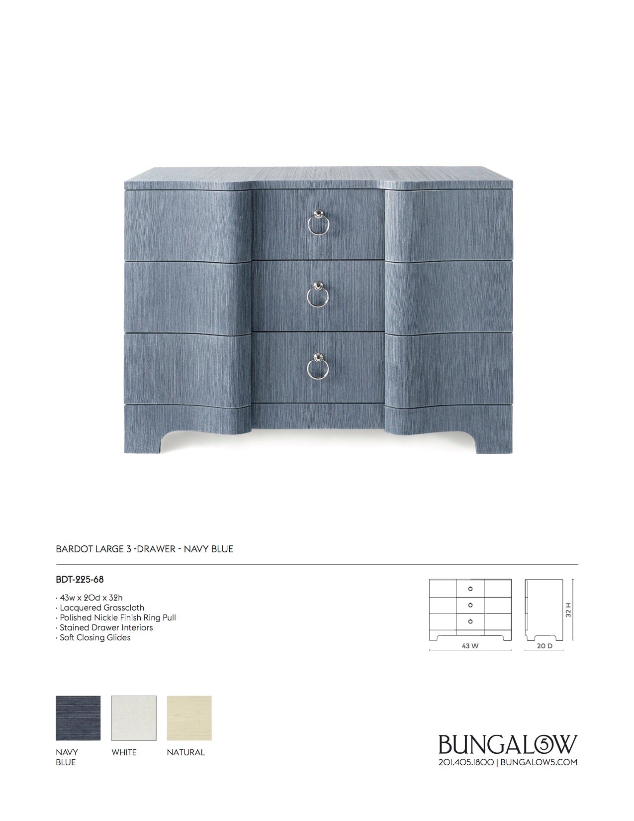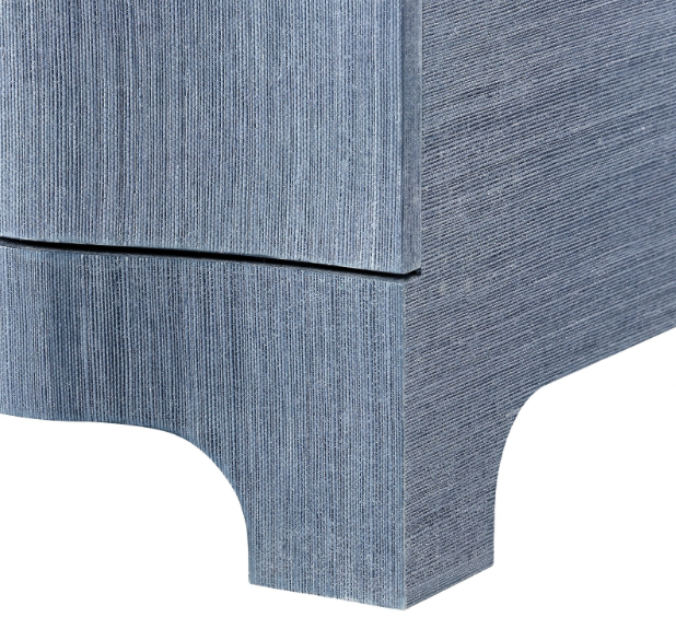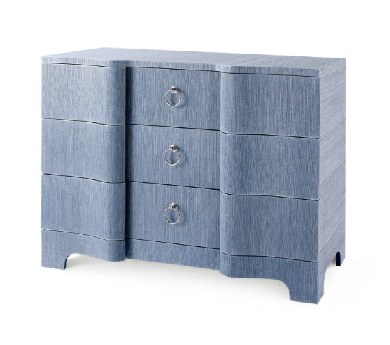 The Bardot Large 3 Drawer Dresser in Navy Blue from Villa & House boasts a beautiful deco-inspired design. With a serpentine front and inset ring pulls in polished nickel, this dresser has a lacquered grasscloth finish with a texture resembling a painted strie.