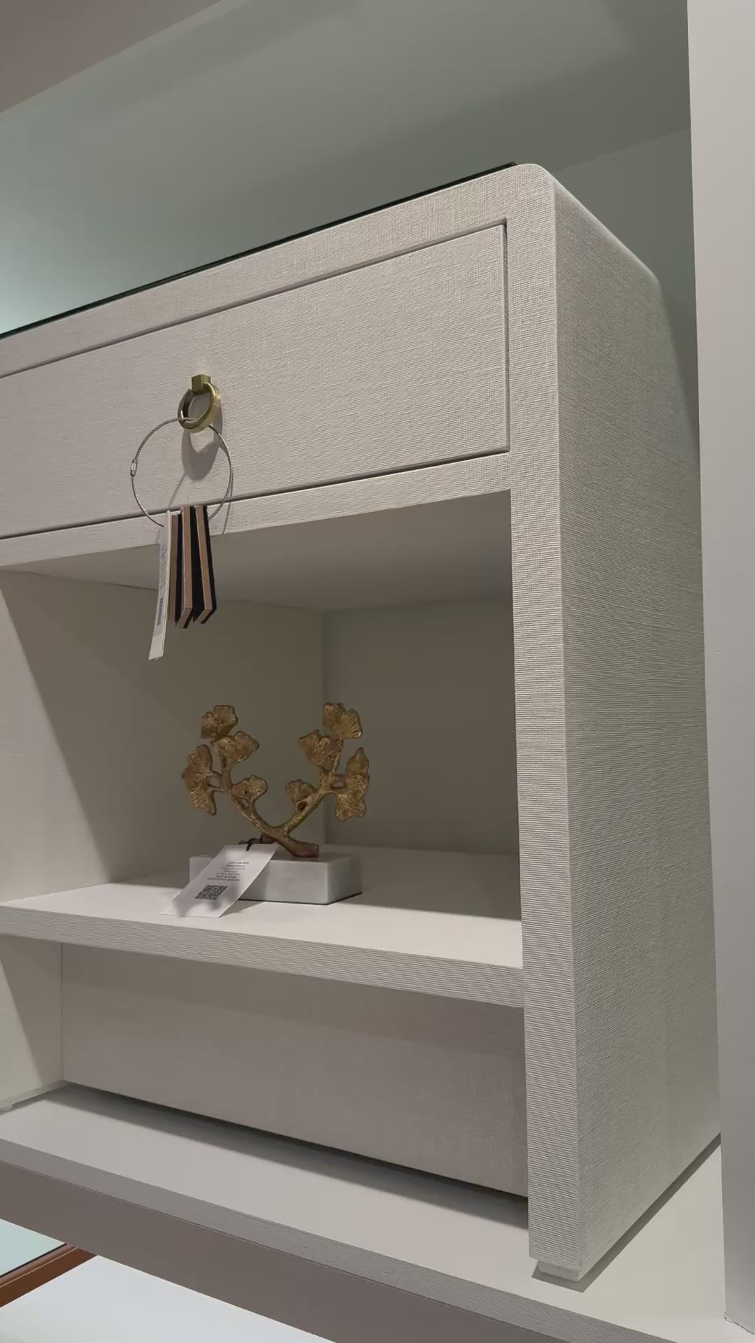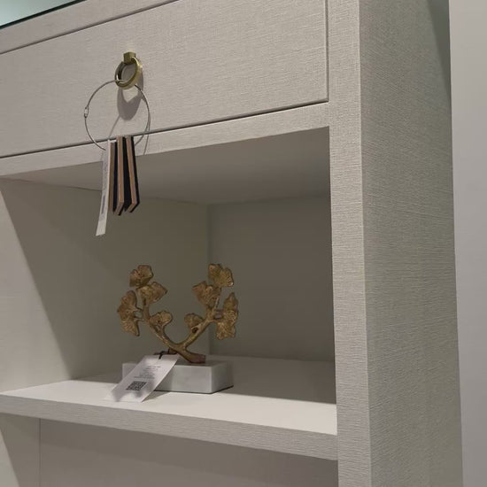 Pigmented Lacquered Linen; Antique Brass Finish Ring Pull; Stained Drawer Interior; Soft Closing Glides