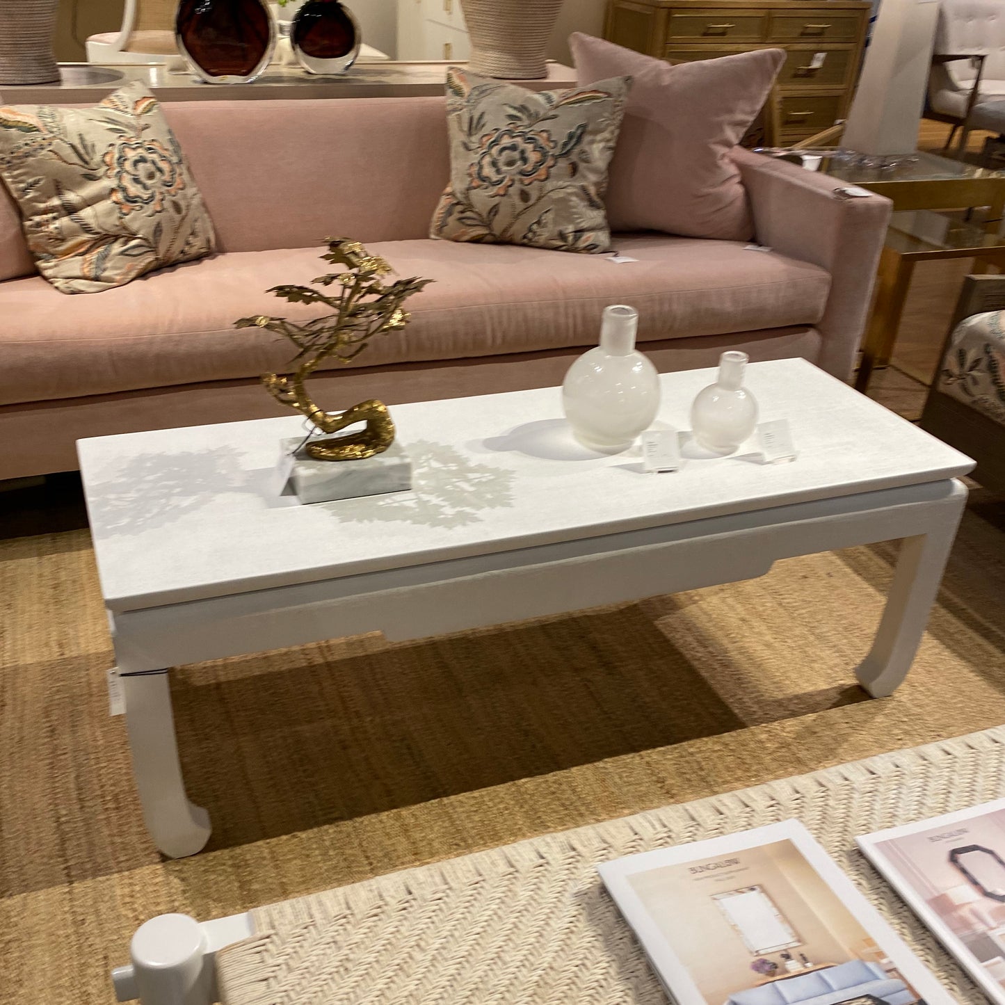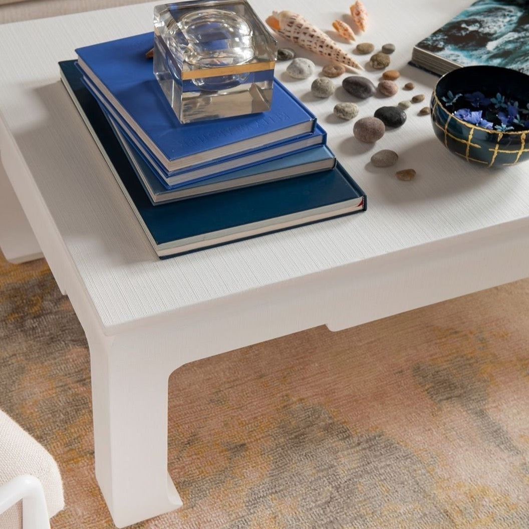 The Bethany Large Rectangular Coffee Table in Vanilla from Villa & House showcases elevated craftmanship with expertly applied lacquered linen that wraps around the corners, edges, and curves of this striking accent table.
