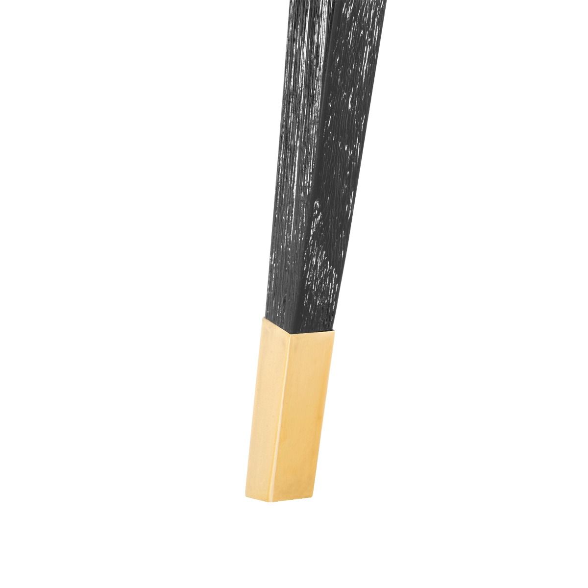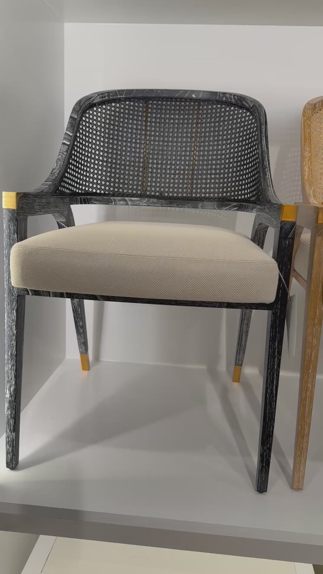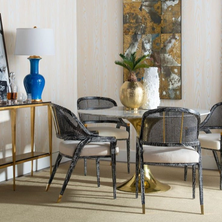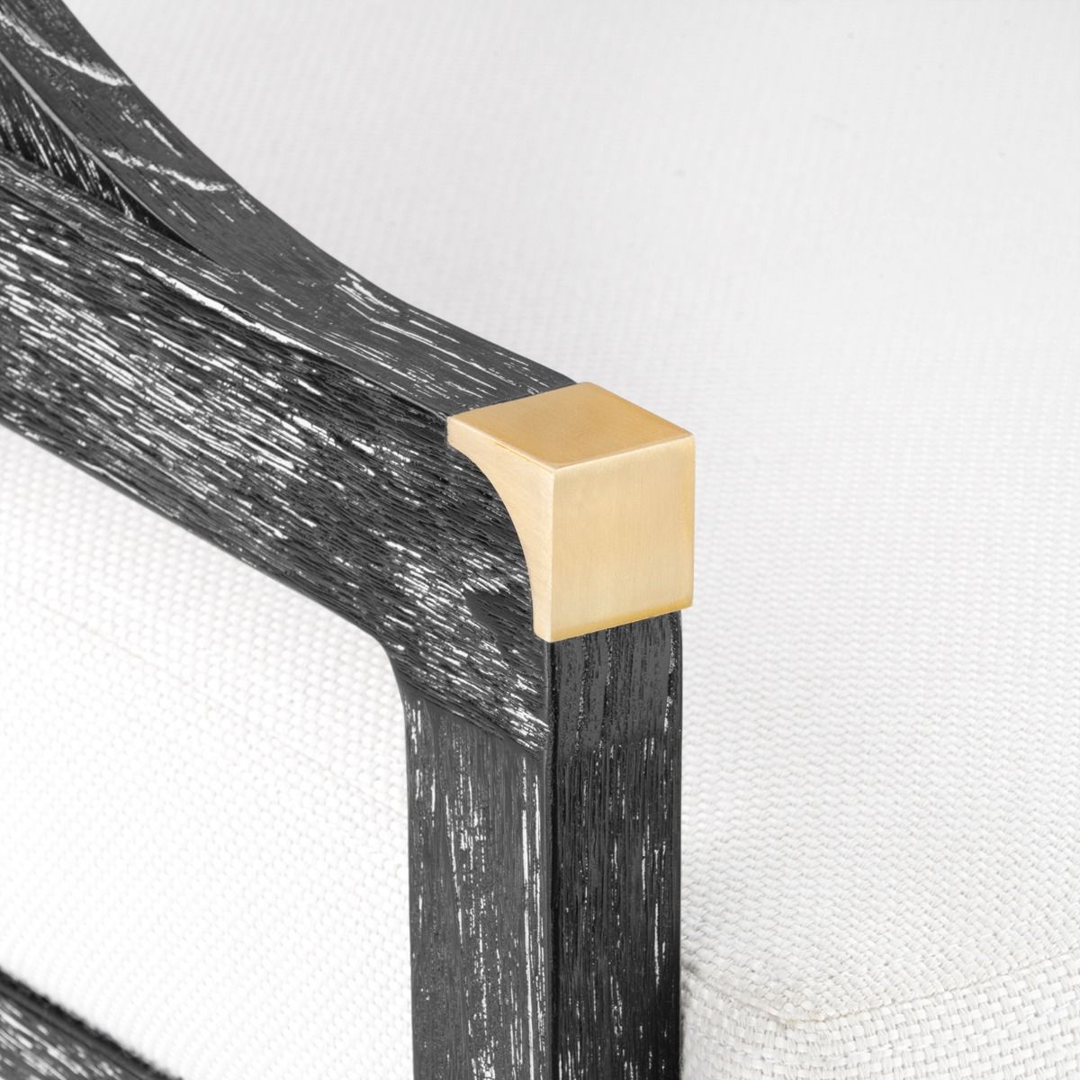 Crafted from sustainably harvested Cape Lilac Mahogany, the Edward Chair in Jet Black fuses classical design elements with a modern twist. A hand-woven rattan back and hand-cast bronze sabots and arm caps add a touch of elegance.