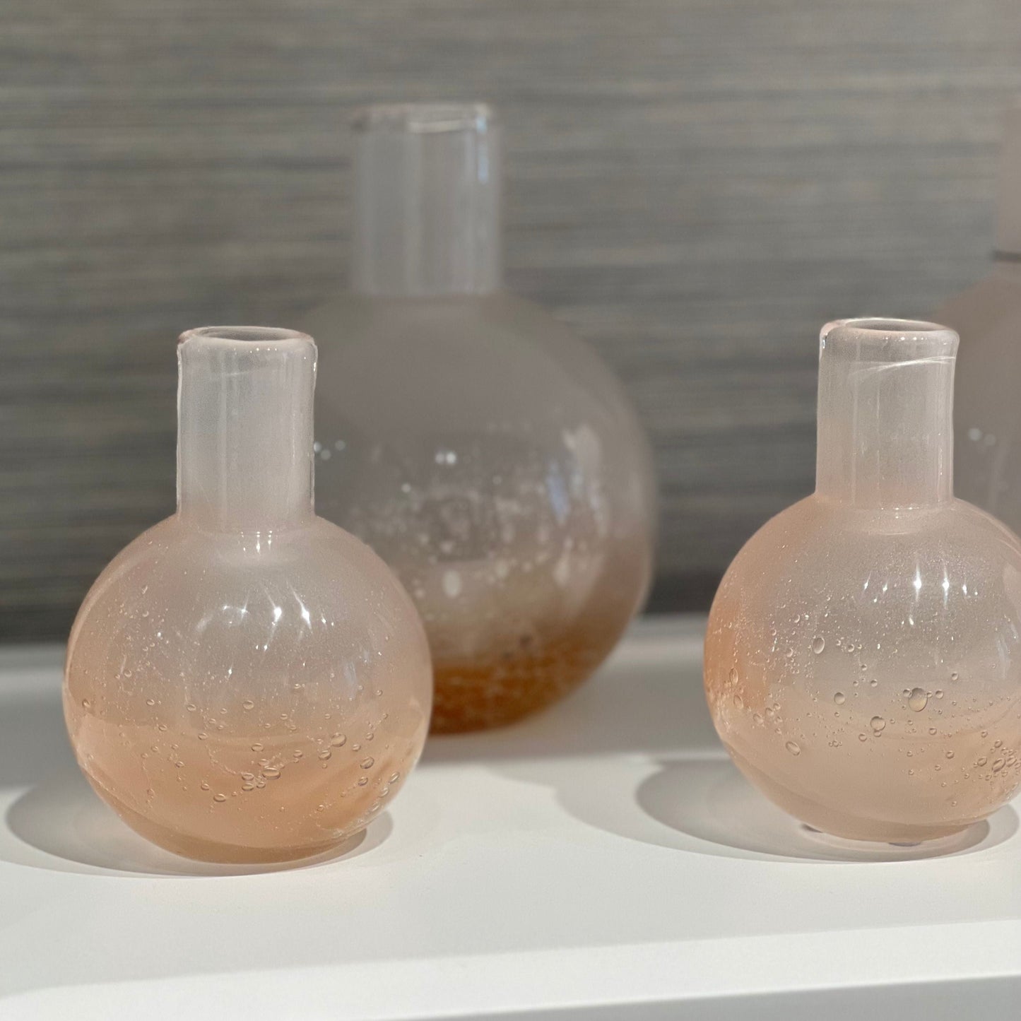 The Giorgio Vase Peach from Villa & House features sparkling patterns of tiny bubbles within the hand-crafted glass, creating a mesmerizing effect reminiscent of constellations.