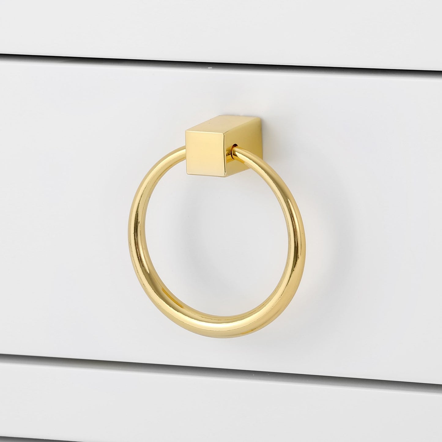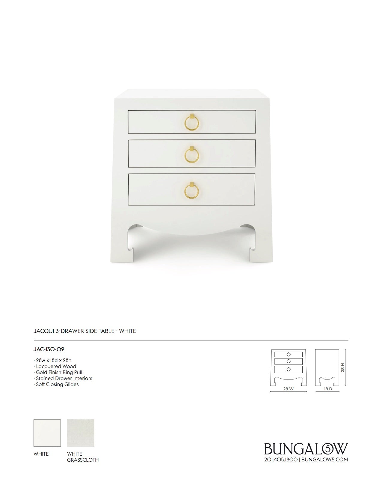 The Jacqui 3-Drawer Side Table from Villa & House boasts a Chiffon White lacquer finish, graduated drawers, stained interior, steel glides, Chow style feet, and gold finish ring pulls. Its modern, Hollywood Regency design provides functional storage and tabletop space for lighting.