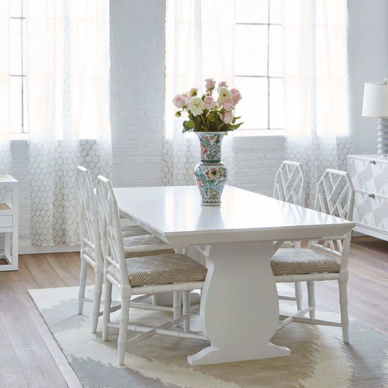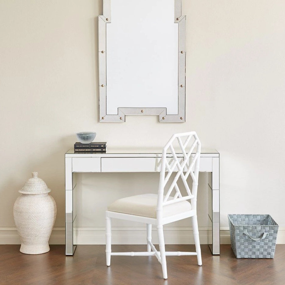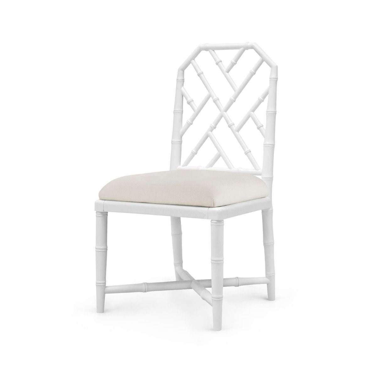 The Jardin Side Chair in Eggshell White from Villa & House is handcrafted of solid mahogany in the Chinoiserie style and finished in a white lacquer. Stylish design details include an elegant faux bamboo frame, lattice frets, and tapered legs, giving the piece a sophisticated and graceful line. Simple drop-in linen upholstery recovers easily when it comes time for a change. *Sold in a set of two.