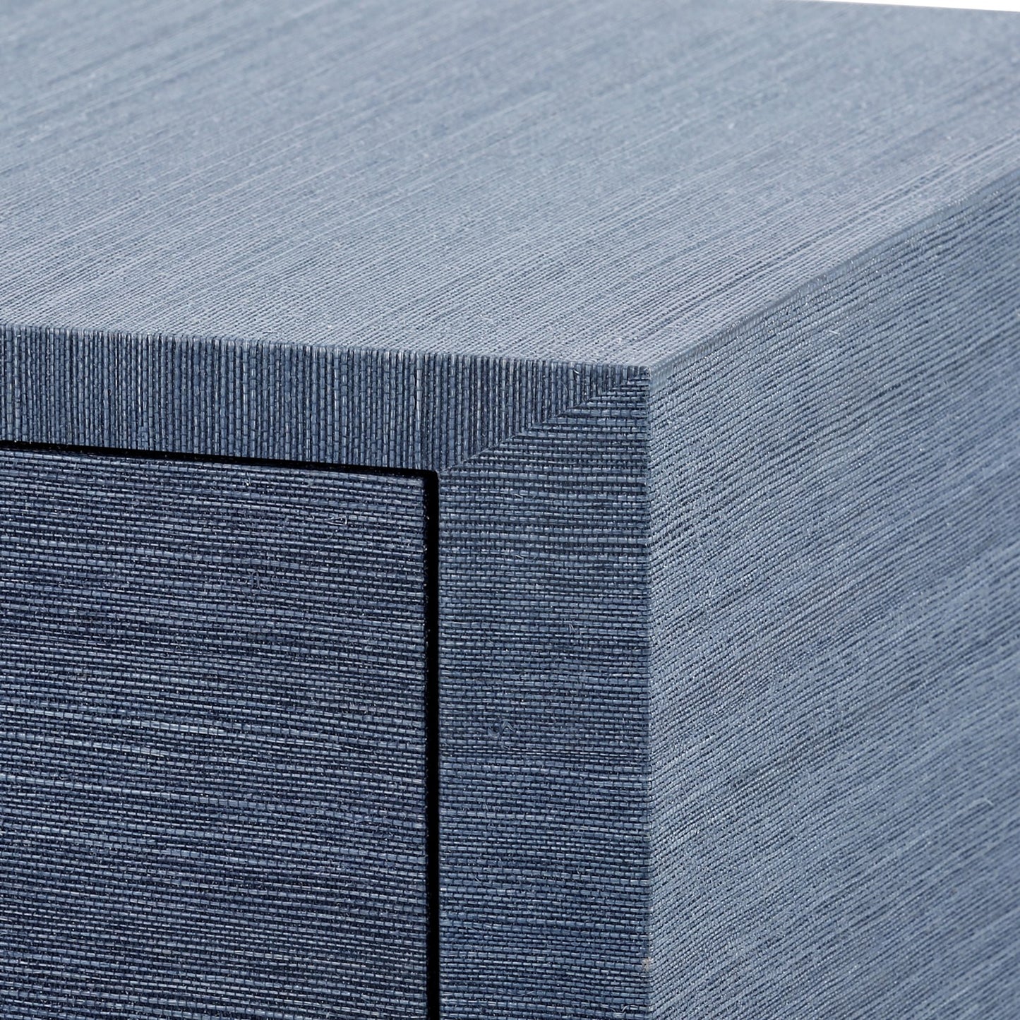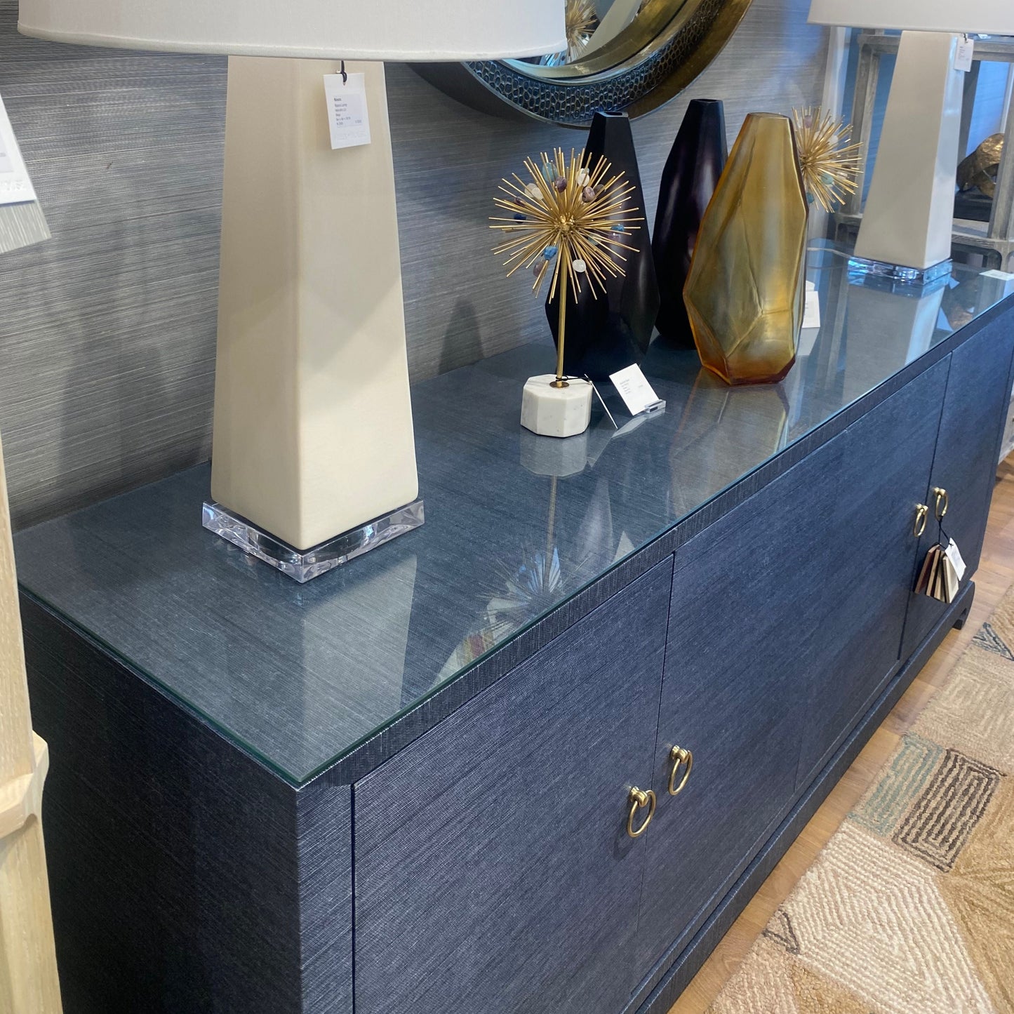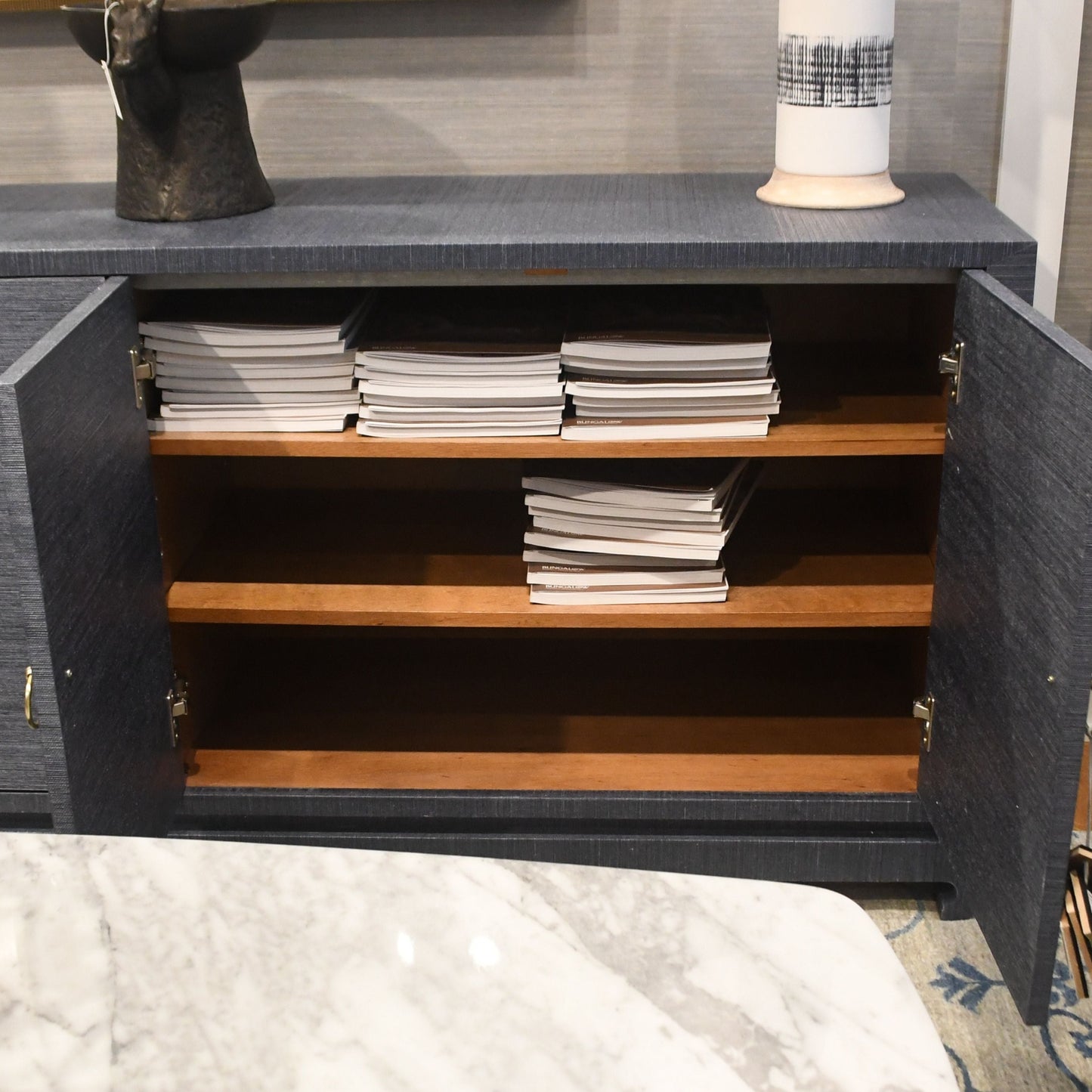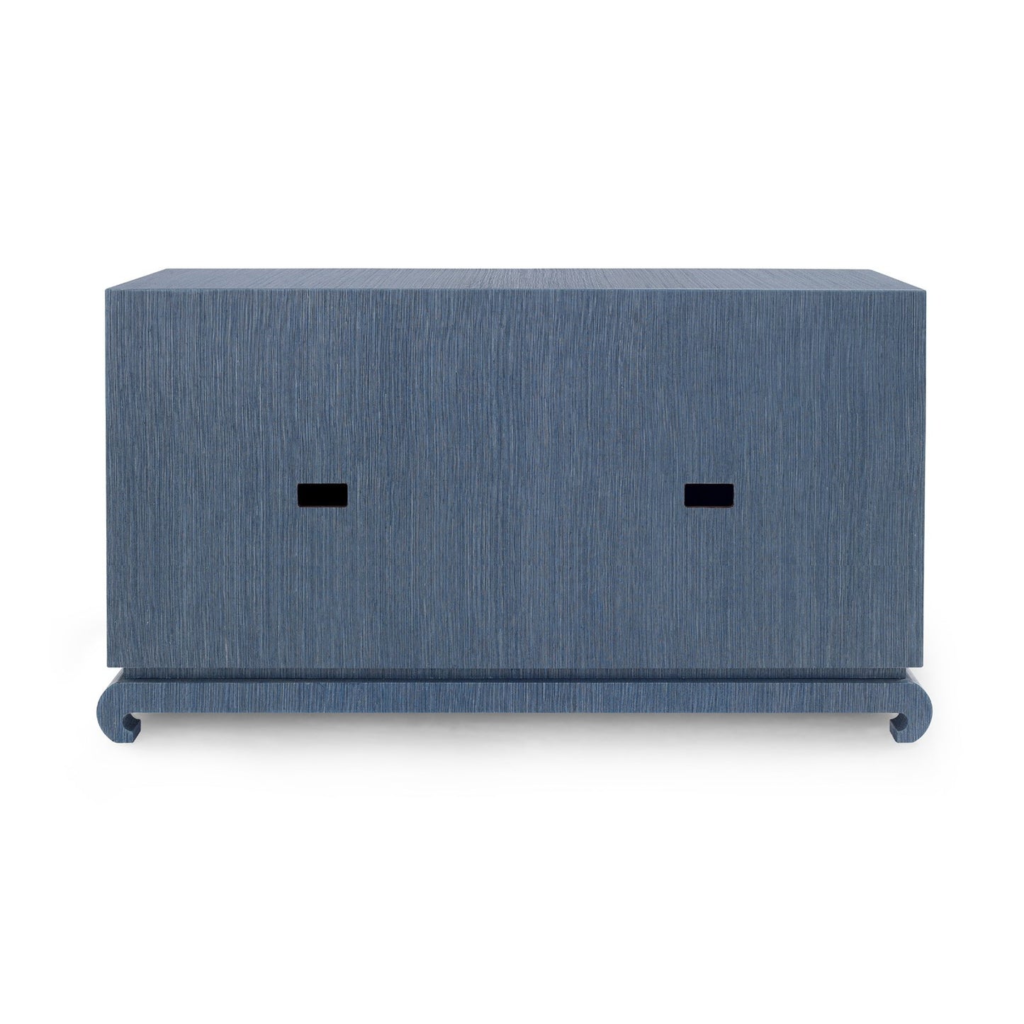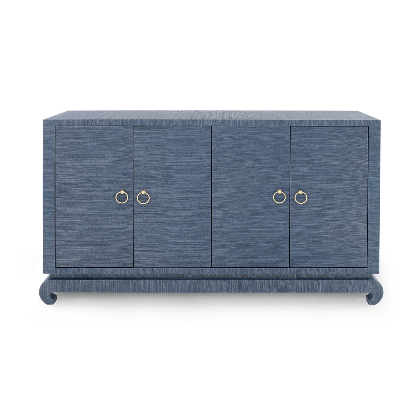 The Meredith 4-Door Cabinet by Villa and House in Navy Blue boasts luxe lacquered grasscloth, gold ring pulls, and concealed cable organization. Its versatile design and curving Chow feet make it suitable for any room in the house.