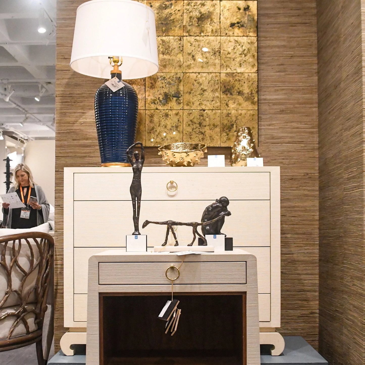 Gold Pull; Lacquered Grasscloth; Natural Finish; Stained Interior With Full Extension Glides; One Fixed Shelf