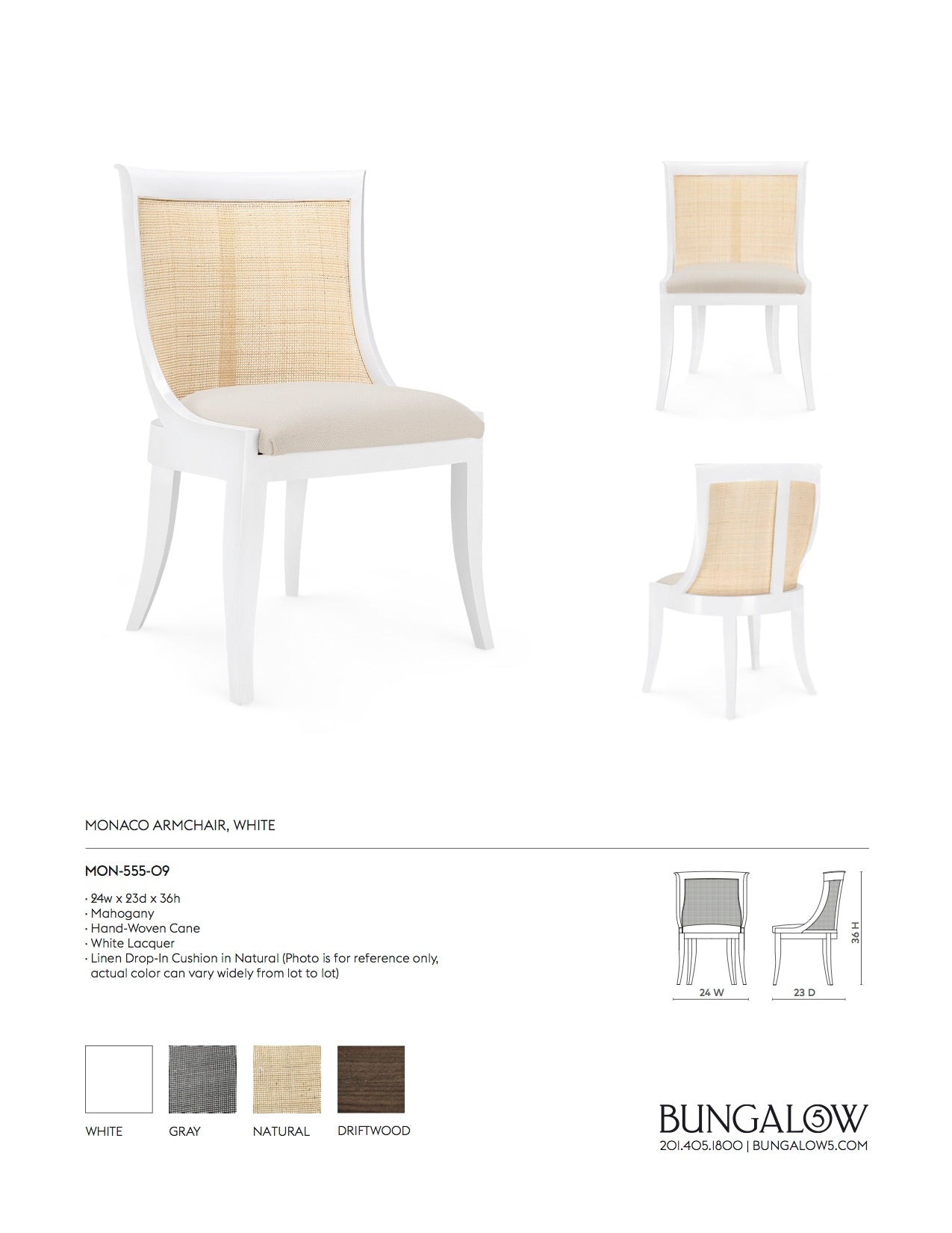 The Monaco Armchair in Eggshell White Set boasts a handwoven cane back, hand-carved legs, and a Cape Lilac Mahogany frame. Its seat cushion, made of natural linen, can be easily removed. Drawing inspiration from Greek and Art Deco designs, this armchair adds a touch of elegance to any room, whether modern or classic. *Sold in a set of two.