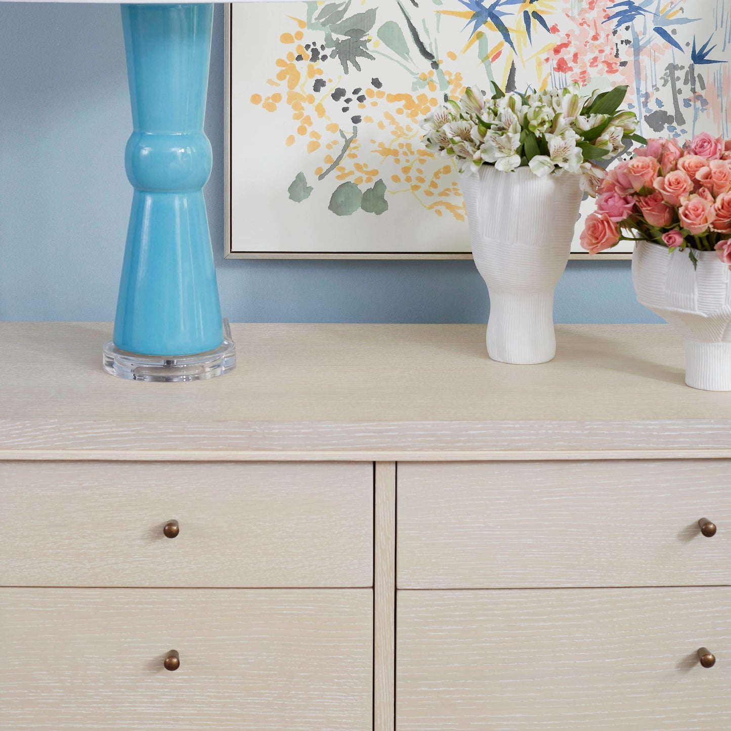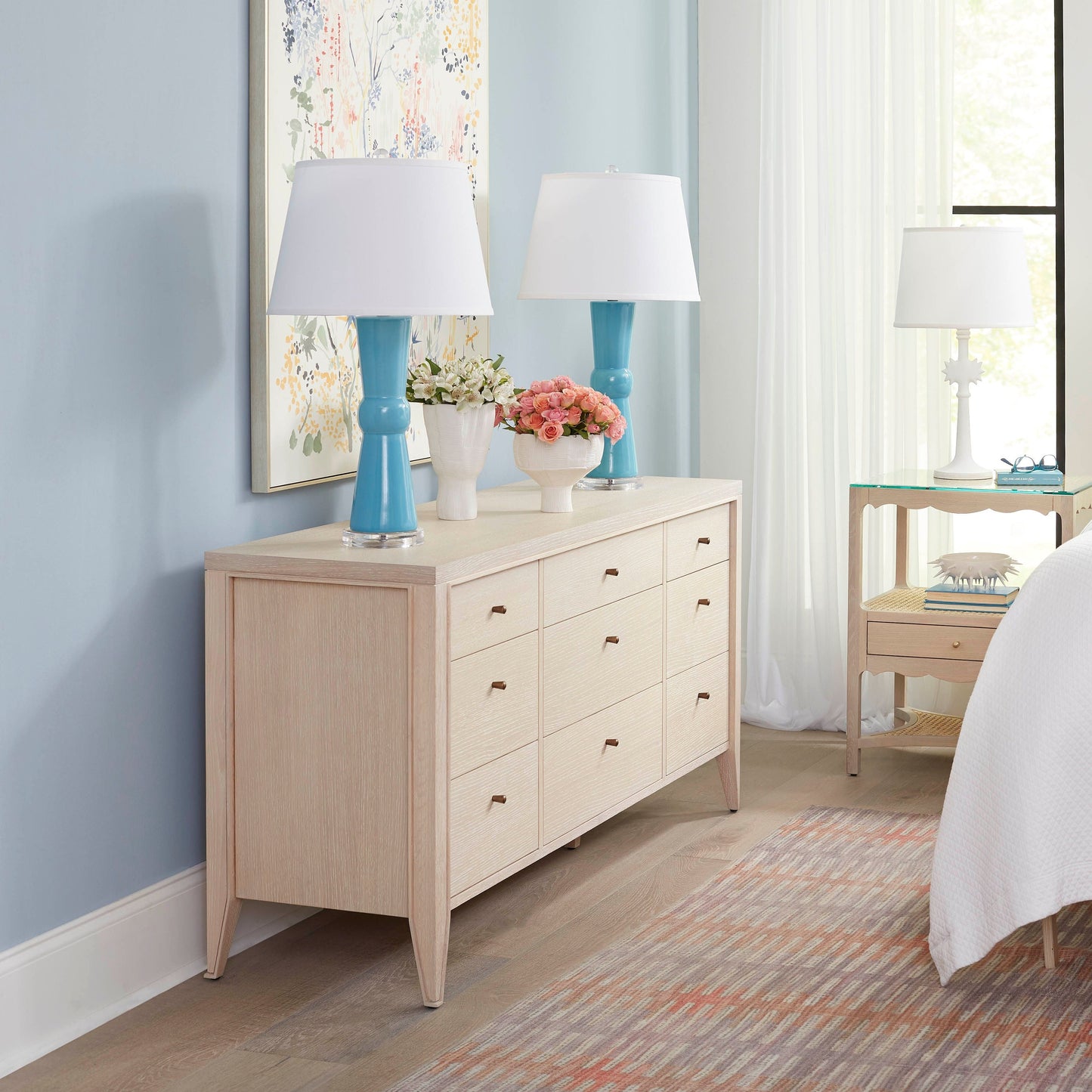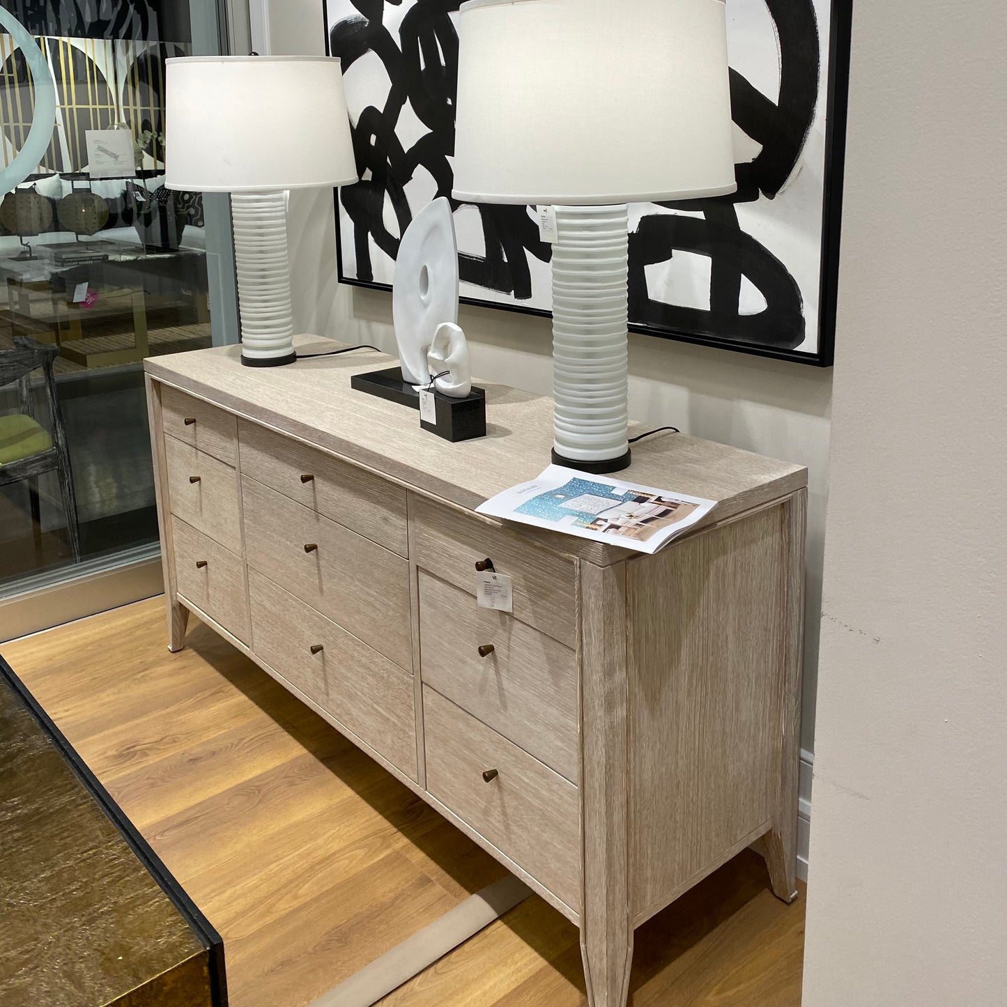 The Paola 9-Drawer Extra Large Dresser in Sand from Villa & House features an oak veneer interior, soft closing glides and bronze pulls. The straight parallel lines use shadow to affect the appearance and amplify the furniture's reveals.