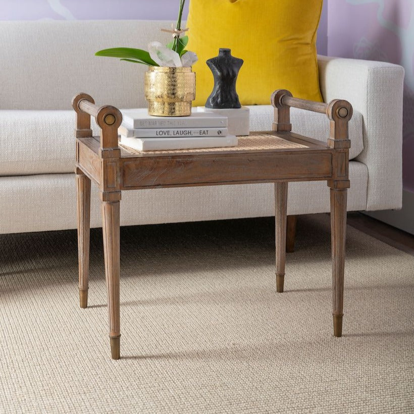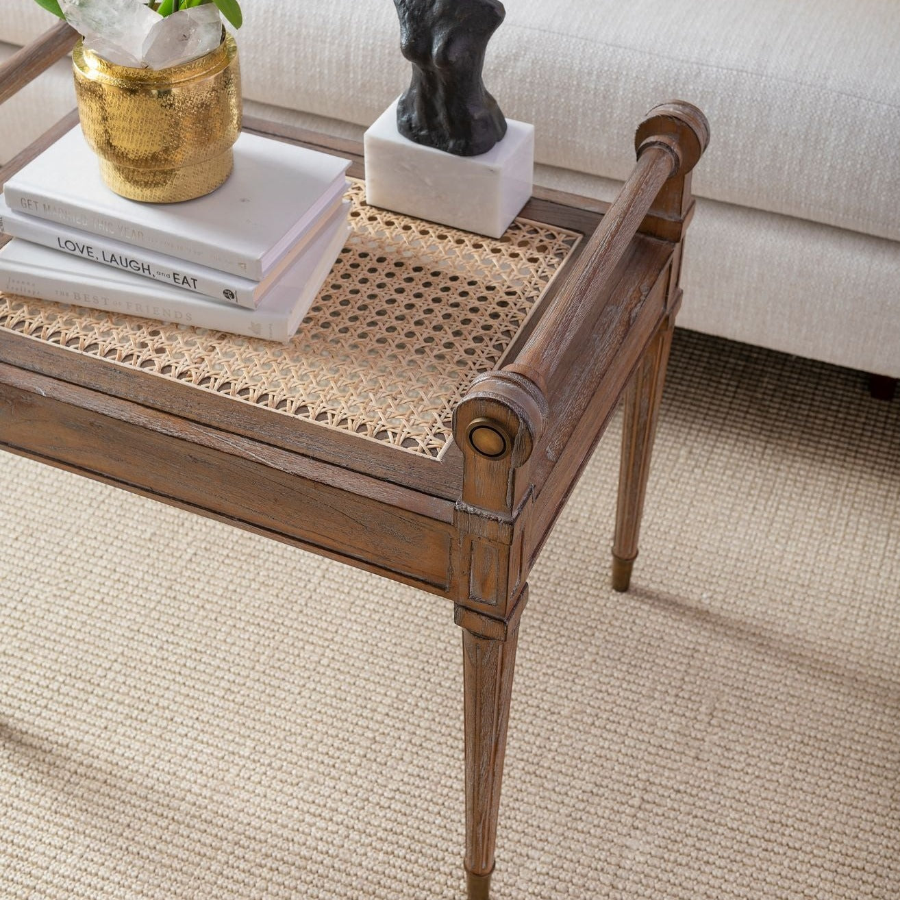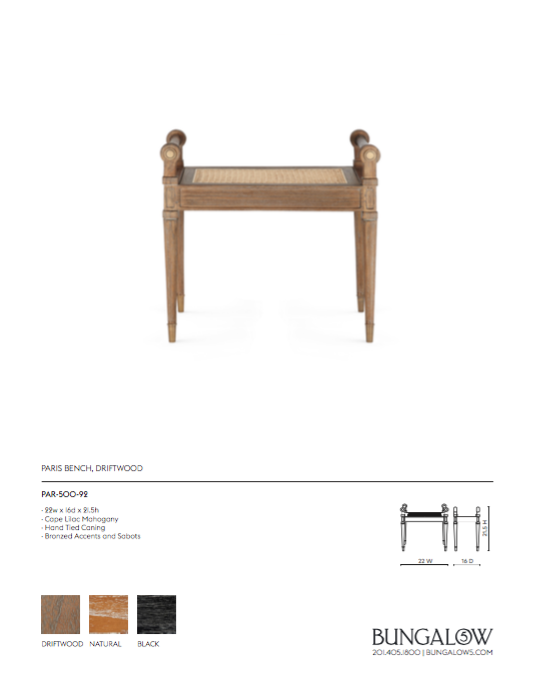 With hand-tied double-layered caning, intricate hand-carved features, and metal accents reminiscent of French antiques, the Paris Bench in Driftwood from Villa & House is ultimately timeless and classic. Villa & House's signature cerused oak process adds a white contrast to the fine details of a wood's grain, enhancing the beauty and delicate natural patterns of lumber.
