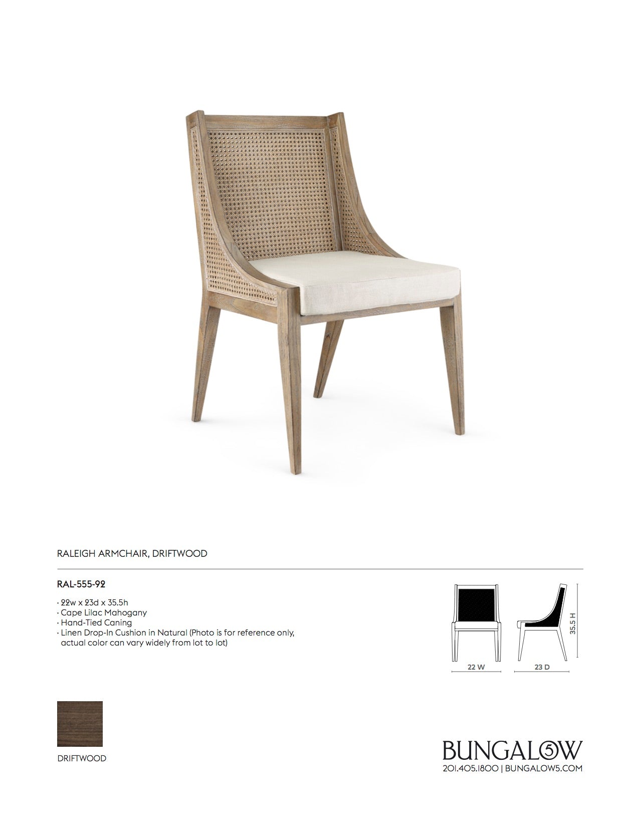 Villa & House presents the Raleigh Armchair in Driftwood, offering equal parts style and casual comfort. Expert craftsmanship creates a contemporary look based on old world techniques. Utilizing sustainably harvested Cape Lilac Mahogany, artisans hand weave and tie the caning into a modern wingback silhouette.
