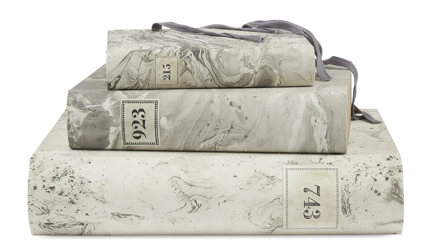 The Hand Painted Gray Marble Box Set of Three from E Lawrence features a unique and stylish storage option for shelving and desktops alike. This three-piece set of hand-painted marble book boxes are treated to a swirly grey finish with ribbon ties.