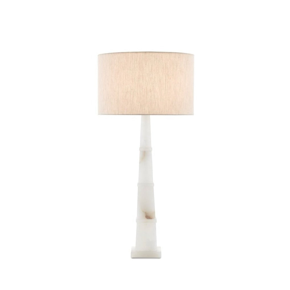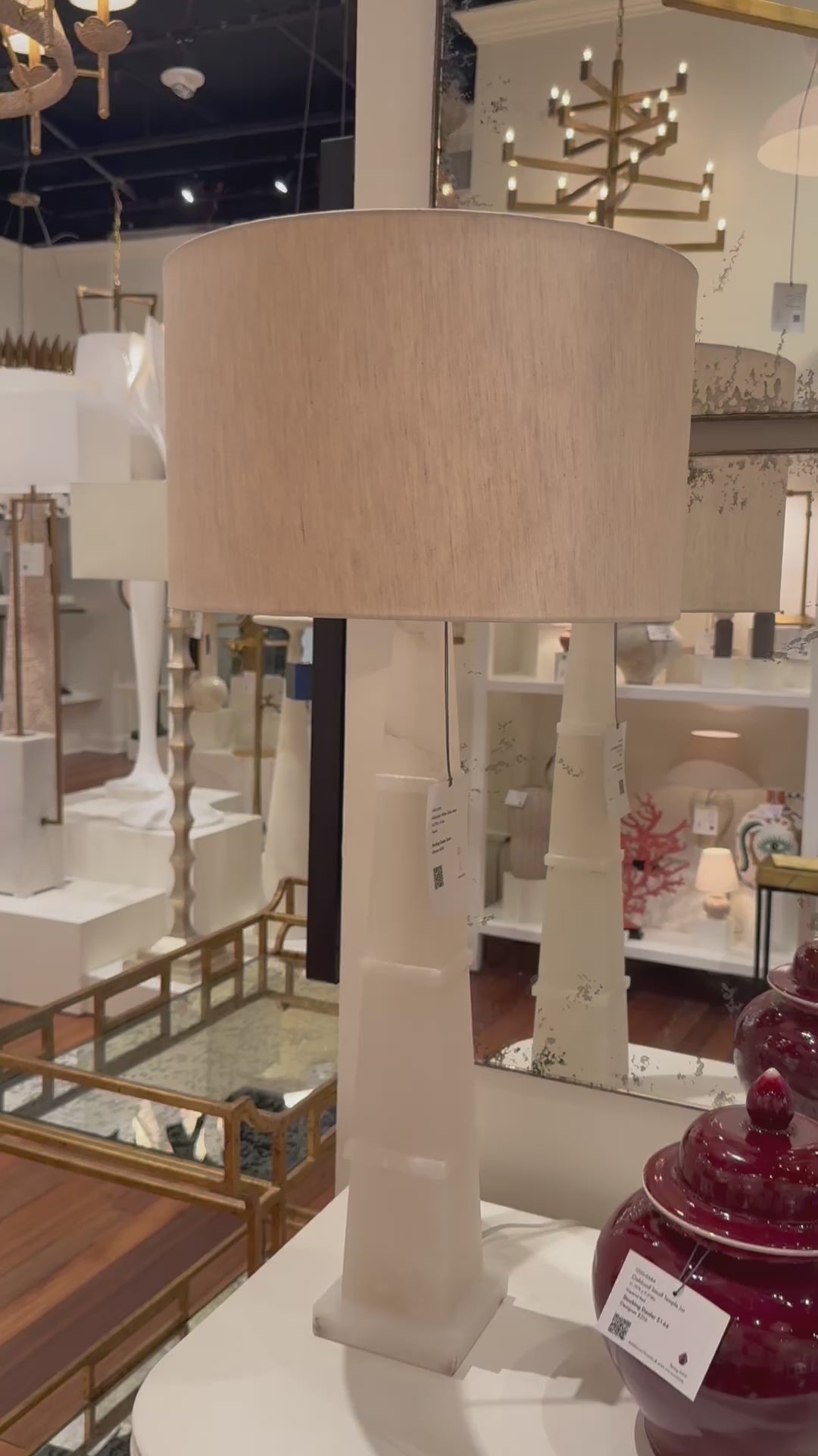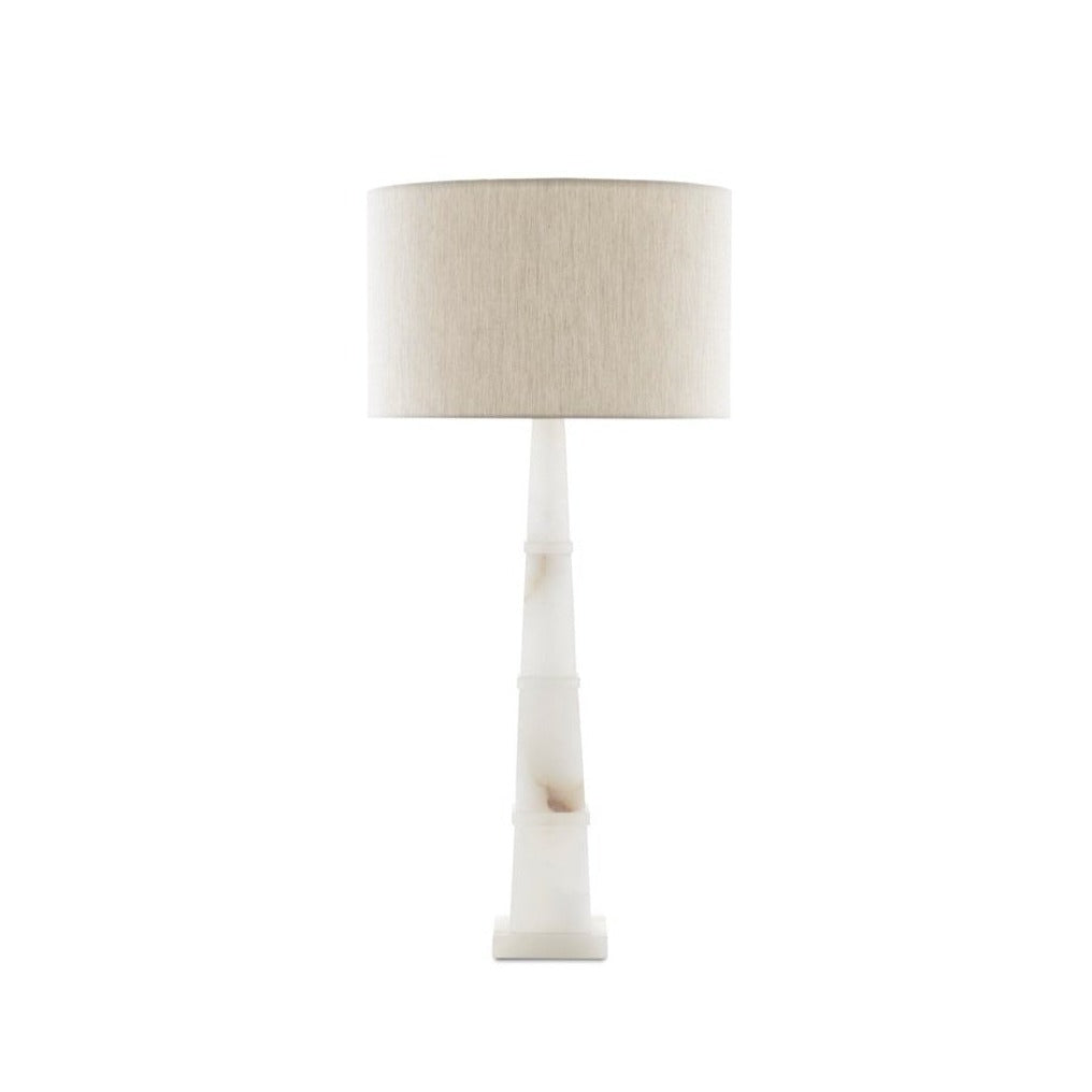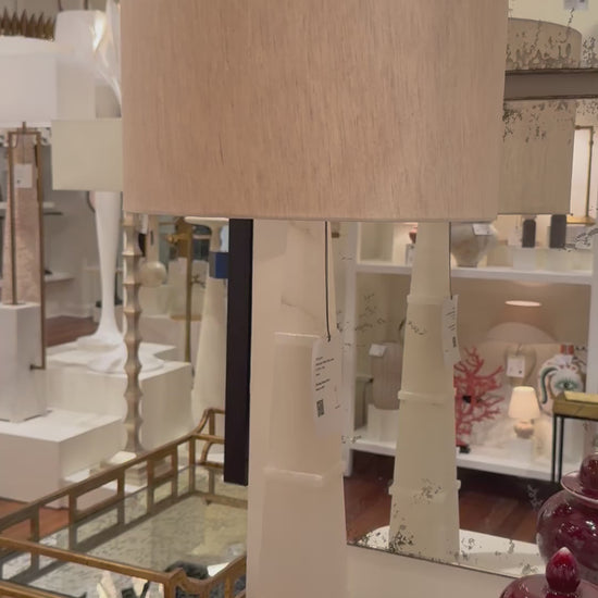 Crafted from stacked alabaster, the Alabastro White Table Lamp from Currey and Company exudes luxury with its obelisk shape. Creator Tom Caldwell describes the translucent stone as simply elegant, showcasing stunning veins.