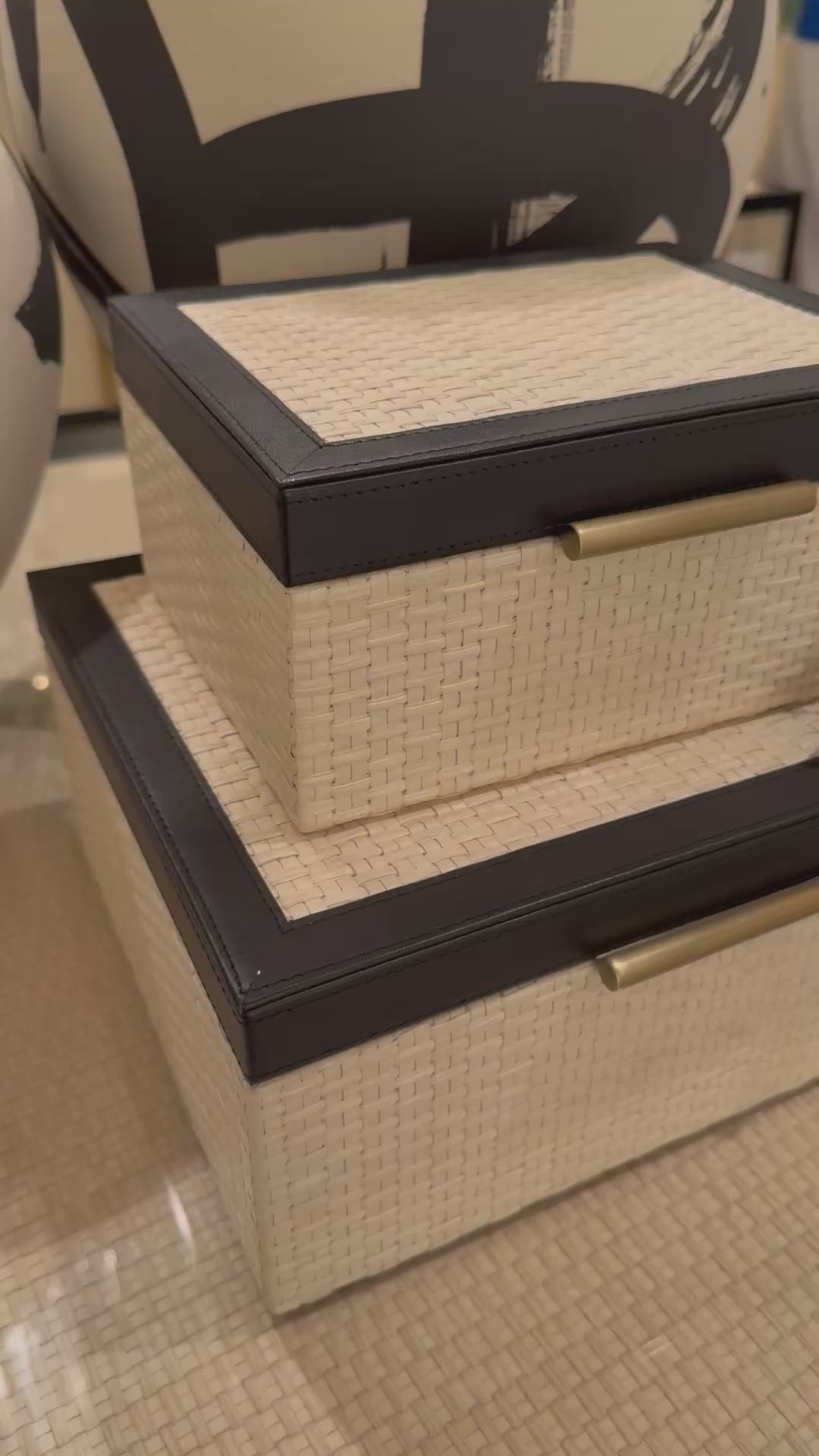 Made of intricately woven ivory raffia, the Deanna Box Set in Raffia and Leather from Currey and Company includes two decorative boxes with black leather tops, and light antique brass handles and hinges. The interiors of these black and ivory boxes are lined with beige micro suede.