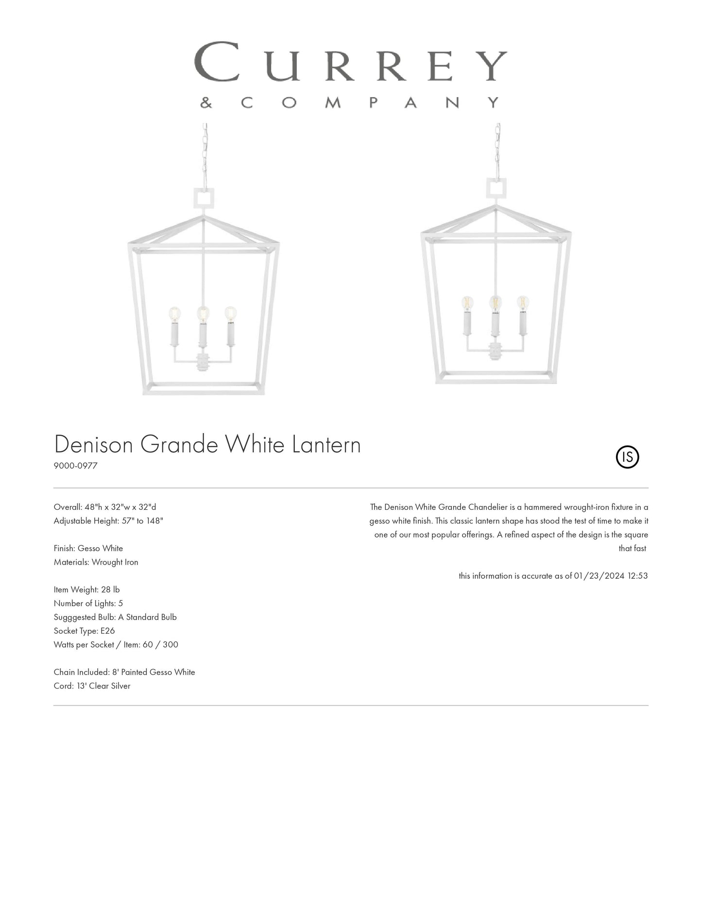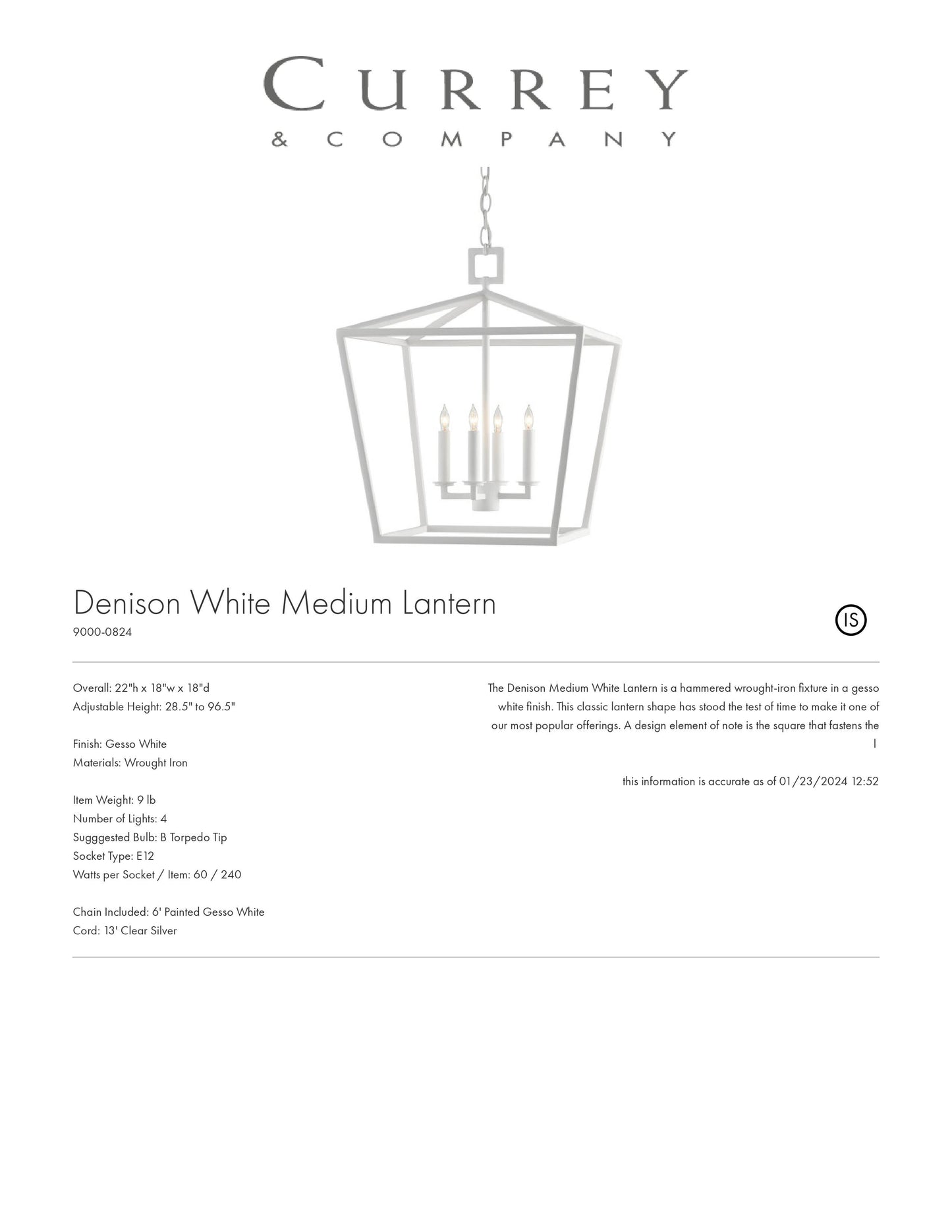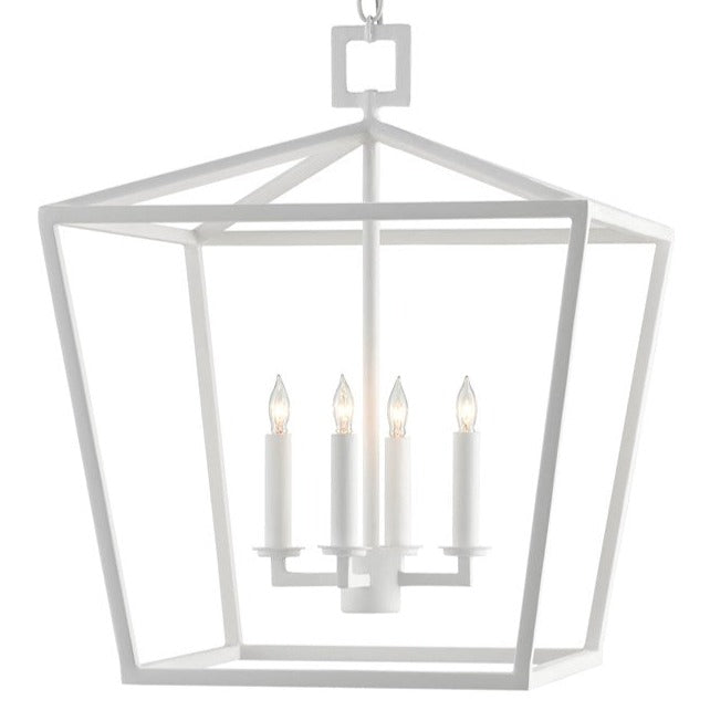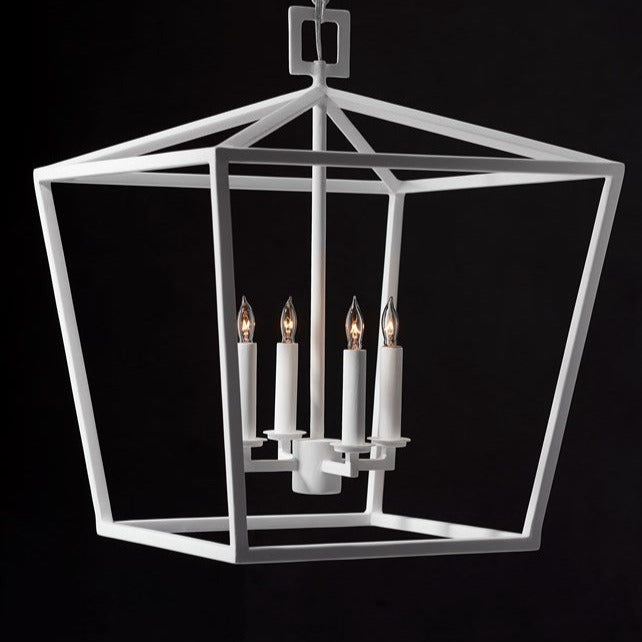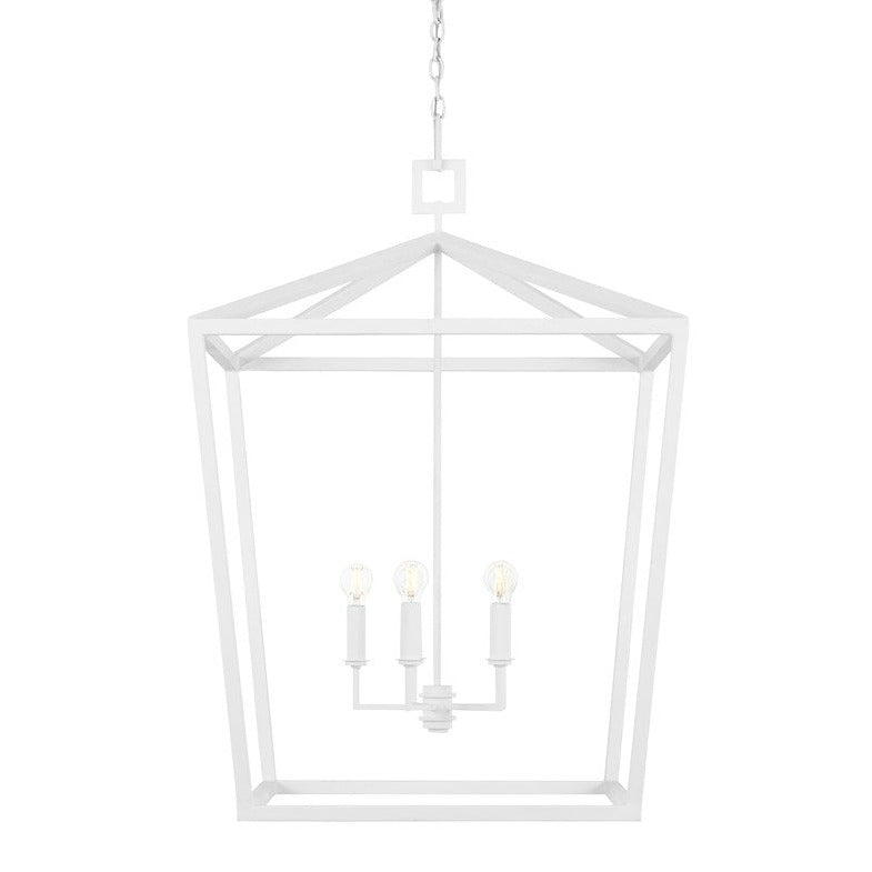The Denison Chandelier in White Gesso from Currey and Company is a hammered wrought-iron fixture in a gesso white finish. This classic lantern shape has stood the test of time to make it one of our most popular offerings. A design element of note is the square that fastens the lantern to the chain.