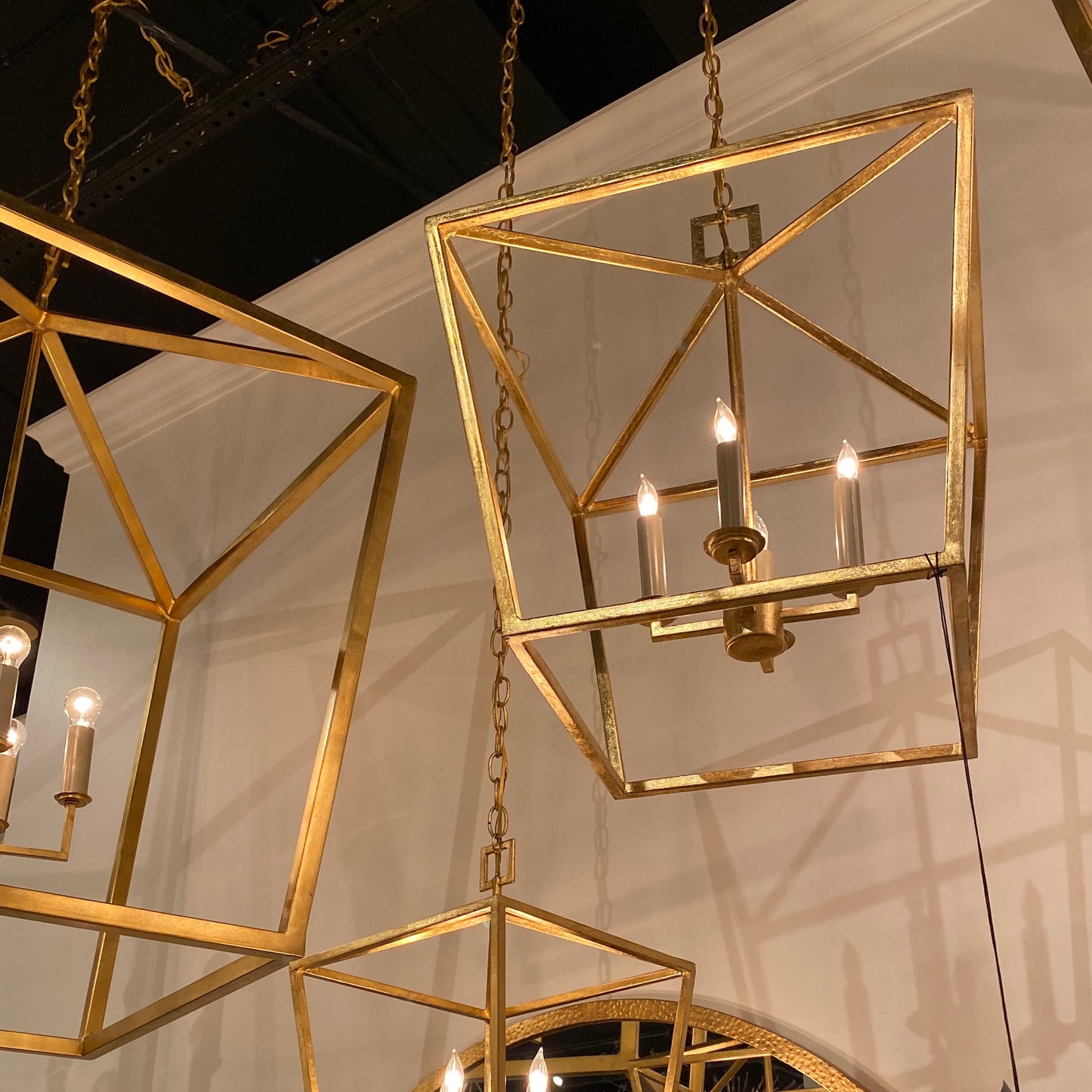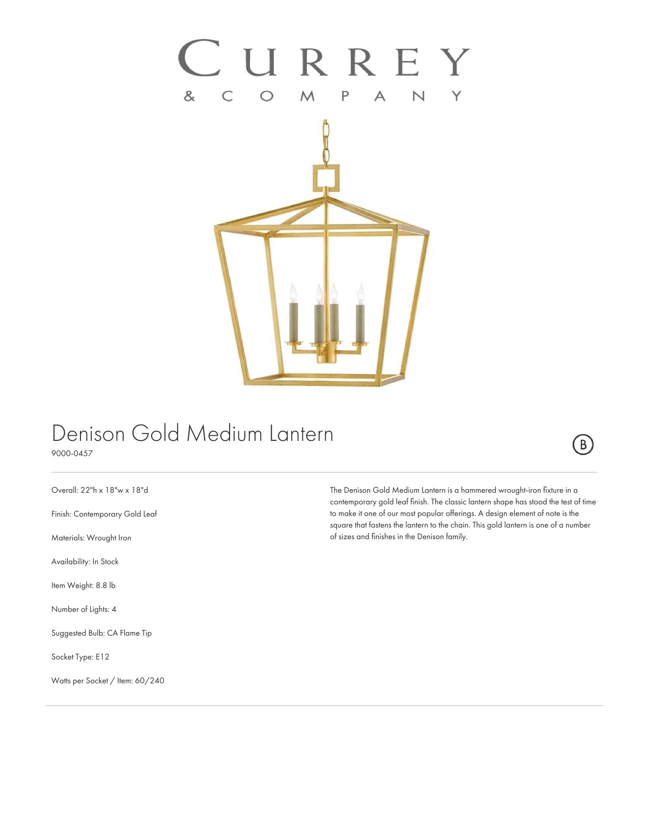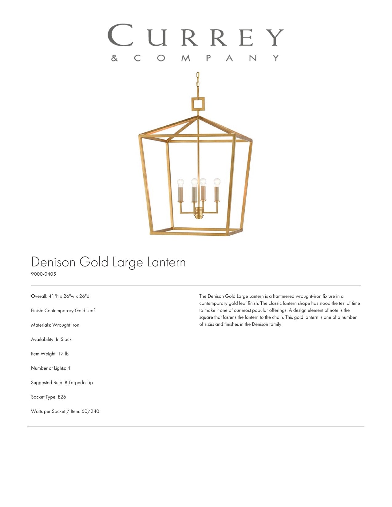 The Denison Lantern in Gold by Currey and Company showcases wrought iron in a cage-like design. This pendant light with an exposed frame illuminates your space. Its timeless shape makes it a popular choice for entryways, kitchens, and hallways.