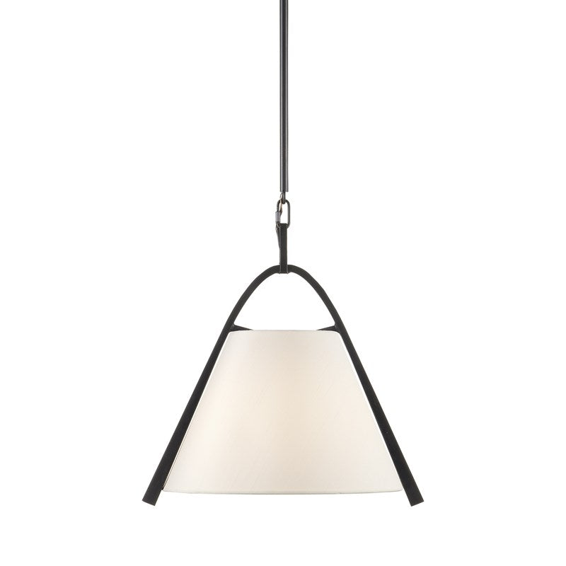 The Frey Pendant, designed by Ian Thornton for Currey and Company, features a sleek, stylish profile and simple yet elegant materials. The black frame elegantly surrounds the white fabric shade, creating a stunning centerpiece for any space.