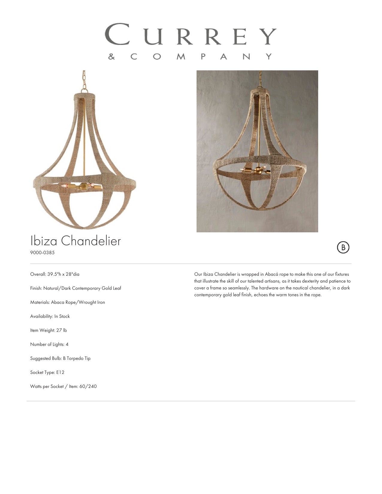Wrought Iron; Abaca Rope; Gold Leaf Finish; Number of Lights: 4; Wattage Per Light: 60; Total Wattage 240; Bulb Type B Torpeso Tip, E12; Extra Chain SKU: 0559