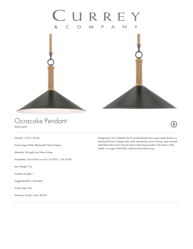 Crafted by renowned designer Tom Caldwell, the Ocracoke Pendant by Currey and Company features a spun metal shade finished in blacksmith black. The addition of rope-covered metal links adds a touch of natural elegance to the pendant. Inside the shade, a sugar-white finish ensures clear and crisp illumination.