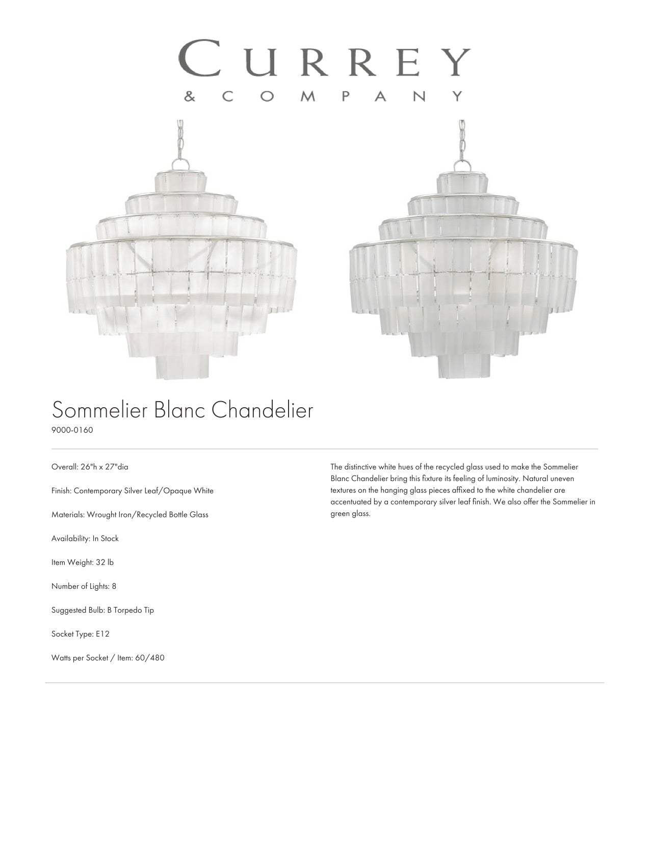 Currey and Company presents the stunning Sommelier Blanc Chandelier, showcasing multiple layers of individually cut pieces of frosted glass sourced from recycled bottles. Each piece, textured and unique in its own way, is enhanced by the frame's bright silver leaf finish.