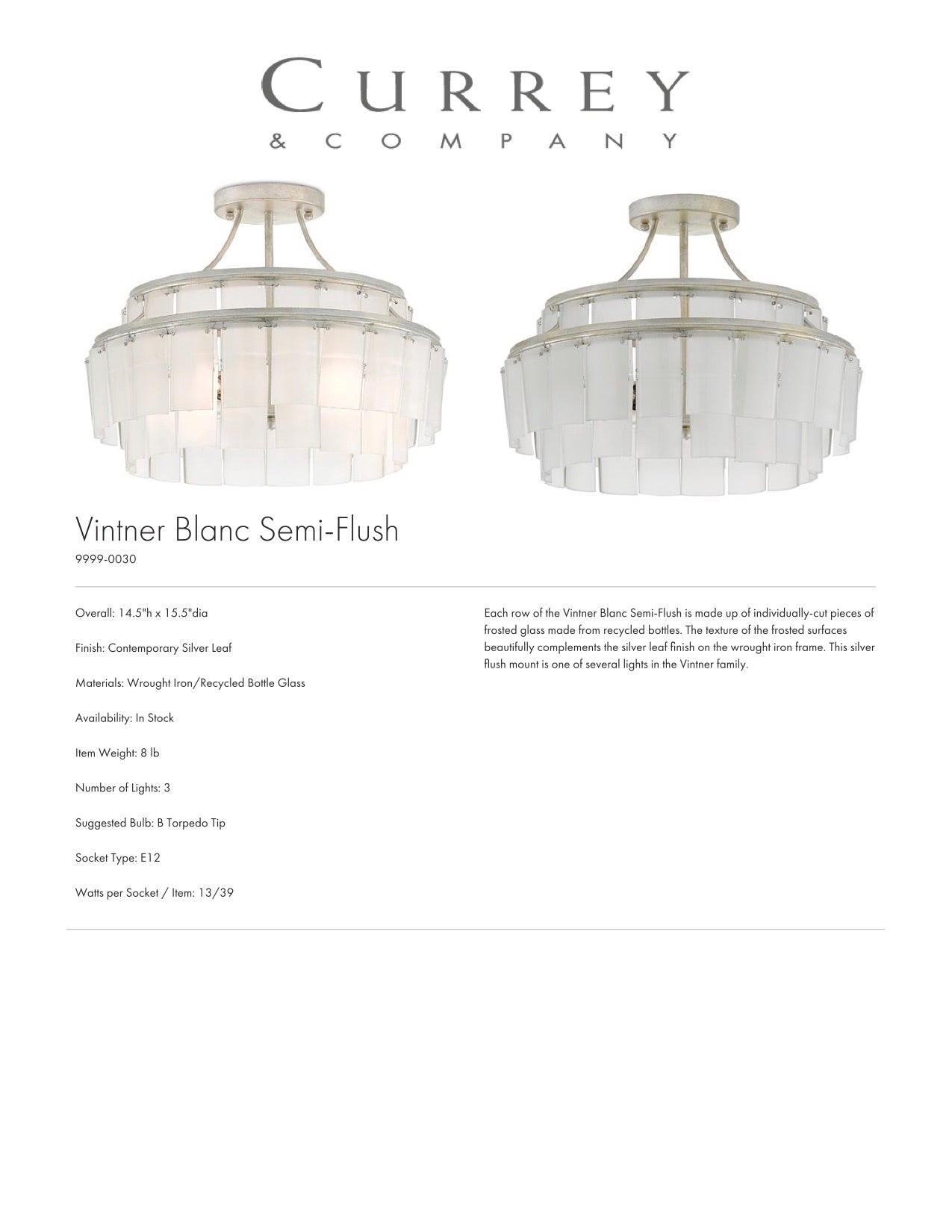 The Vintner Blanc Chandelier by Currey and Company features a stunning concentric design with 3 candelabra lights, crafted from individually selected white recycled bottle glass for a unique artisanal touch. The frosted glass segments flow seamlessly into each other, creating an elegant and stylish look. Made with wrought iron and a hand-applied silver leaf finish.