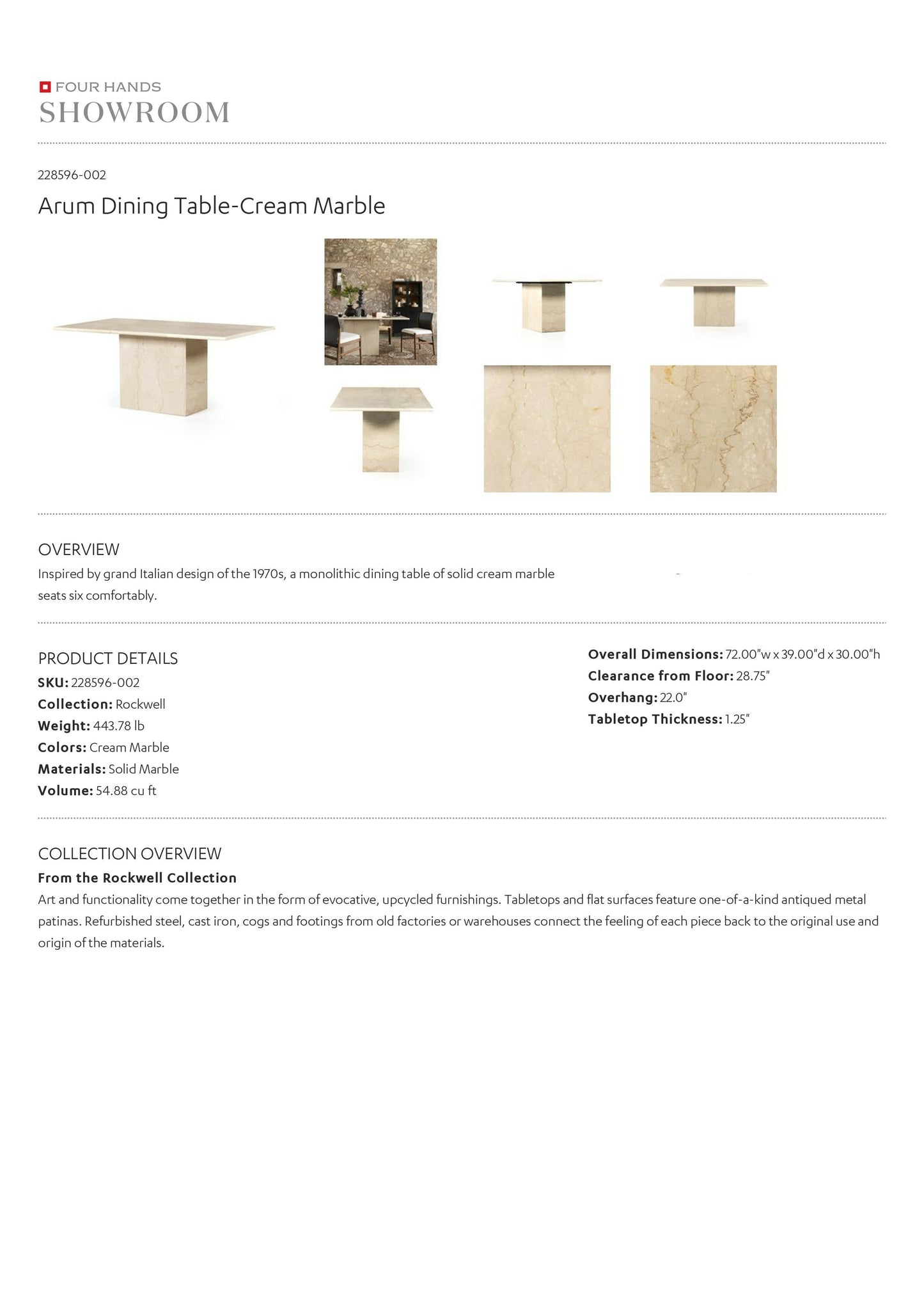 Inspired by the grand Italian design of the 1970s, the monolithic Arum Dining Table in Cream Marble from Four Hands delivers the ultimate in modern style to your dining spaces. This stunning table of modern cream marble comfortable seats 6.