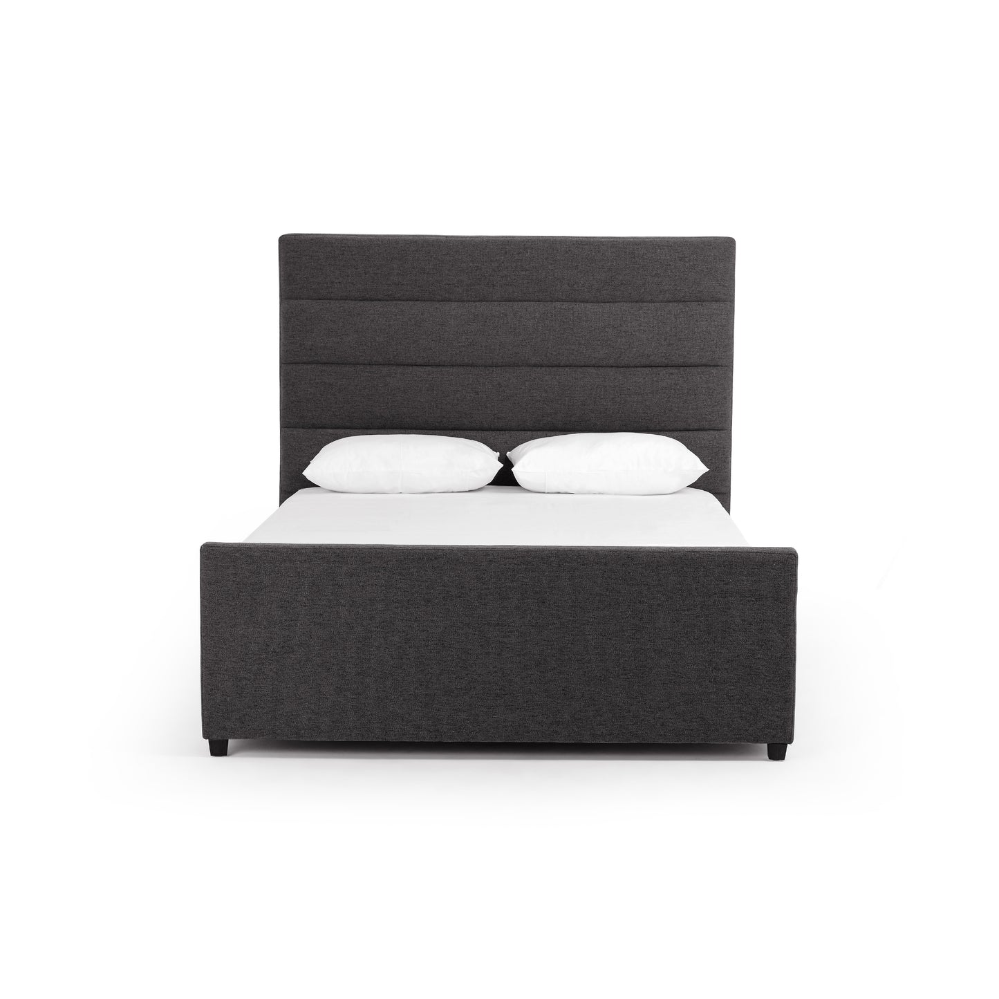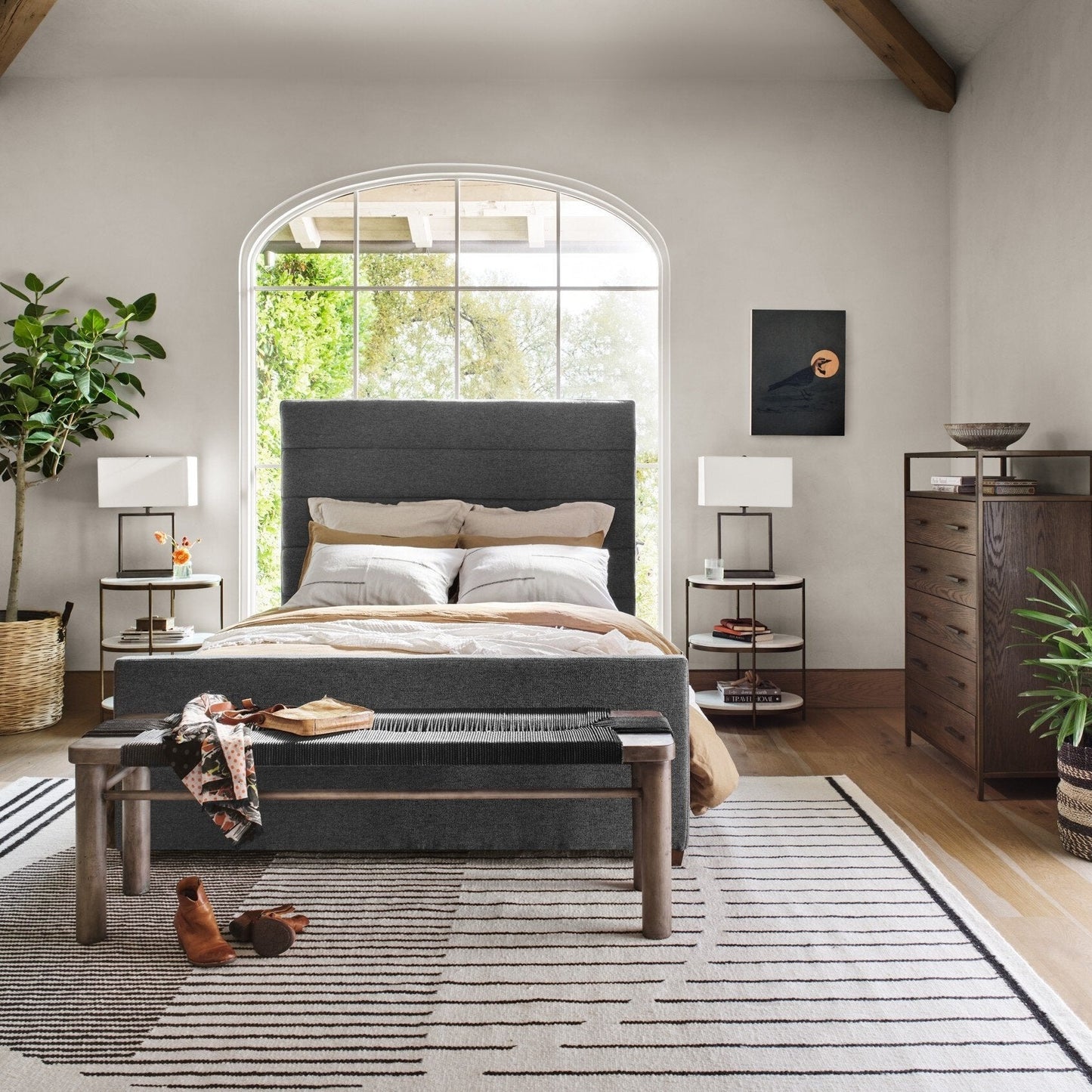 Horizontal channeling lends a linear, textured look to the luxurious upholstery in a deep grey. The Daphne Bed in San Remo Ash from Four Hands features high-style, boucle-like headboard that crafts an elegant air. This bed is not compatible with an adjustable mattress. *Available in King and Queen sizes.