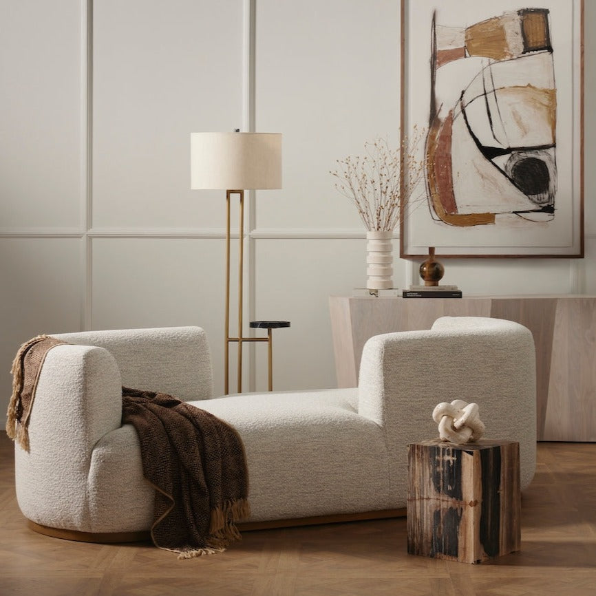 Modern European inspiration and plush curves come head to head in this stylish chaise. The Deandra Tete a Tete Chaise in Merino Cotton from Four Hands has a soft liquid-repellent performance fabric that feels both casual and elevated. A rich base of Rosa Morada wood below frames the entire piece.