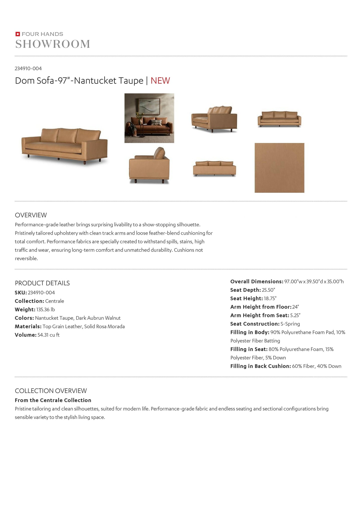 The Dom Sofa in Nantucket Taupe from Four Hands features performance-grade leather that brings surprising livability to a show-stopping silhouette. Pristinely tailored upholstery with clean track arms and loose feather-blend cushioning for total comfort.