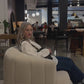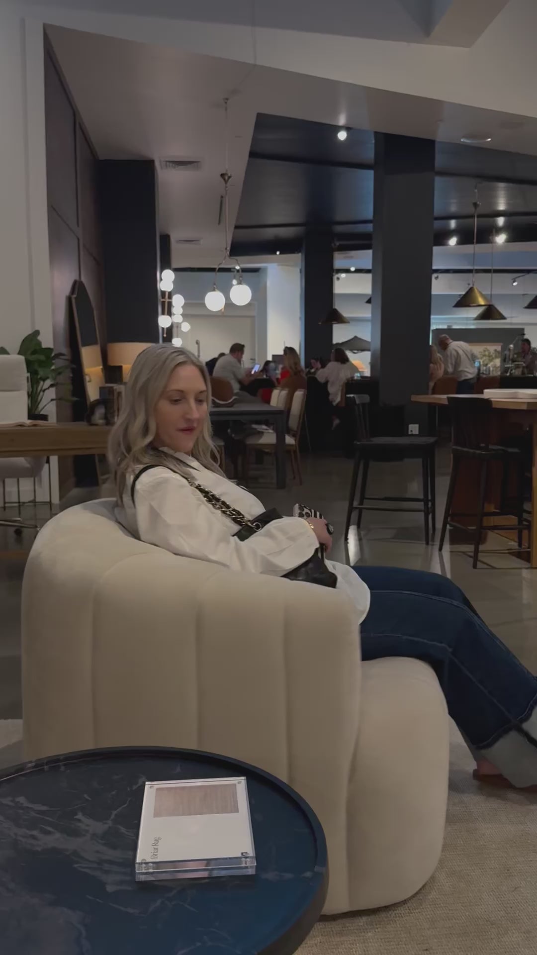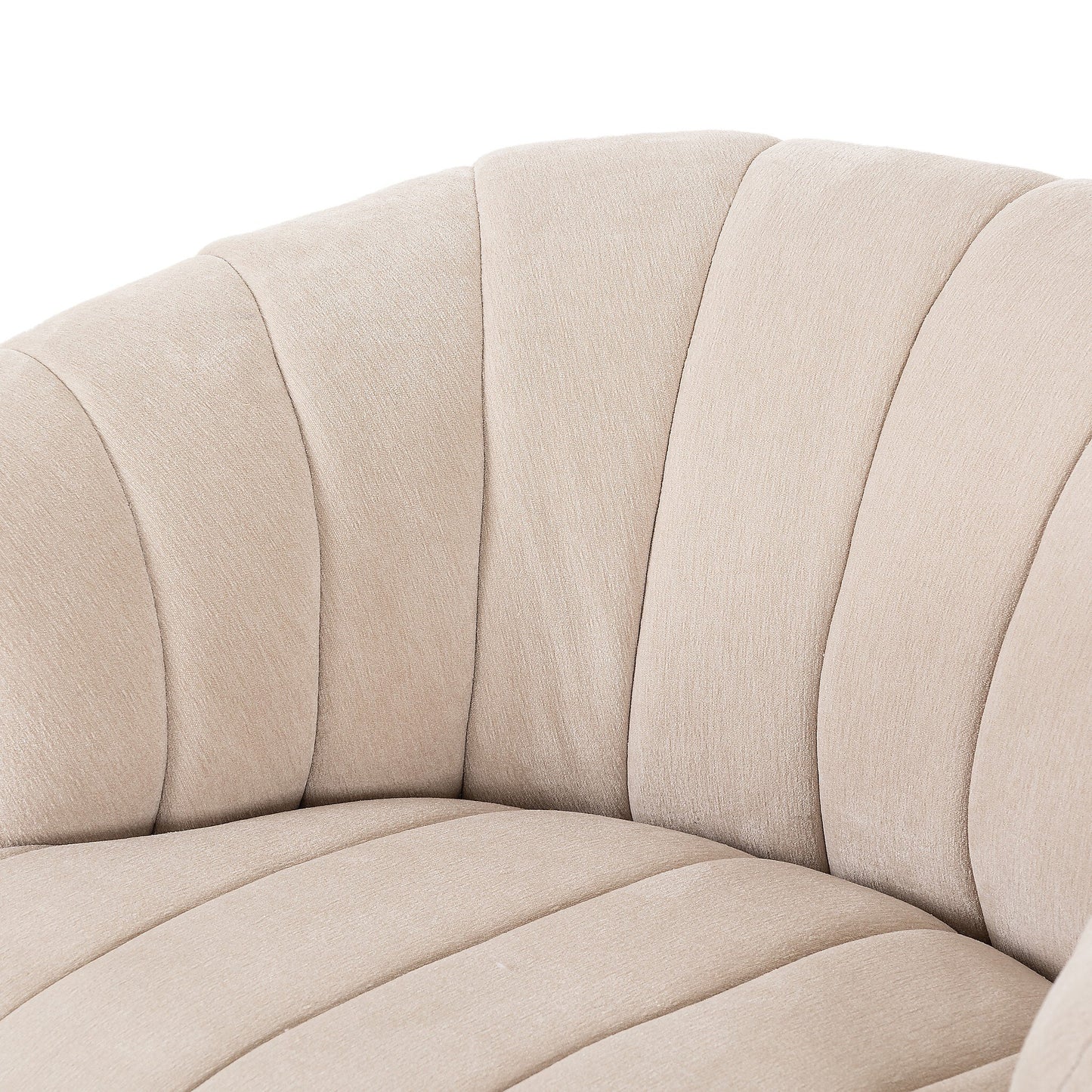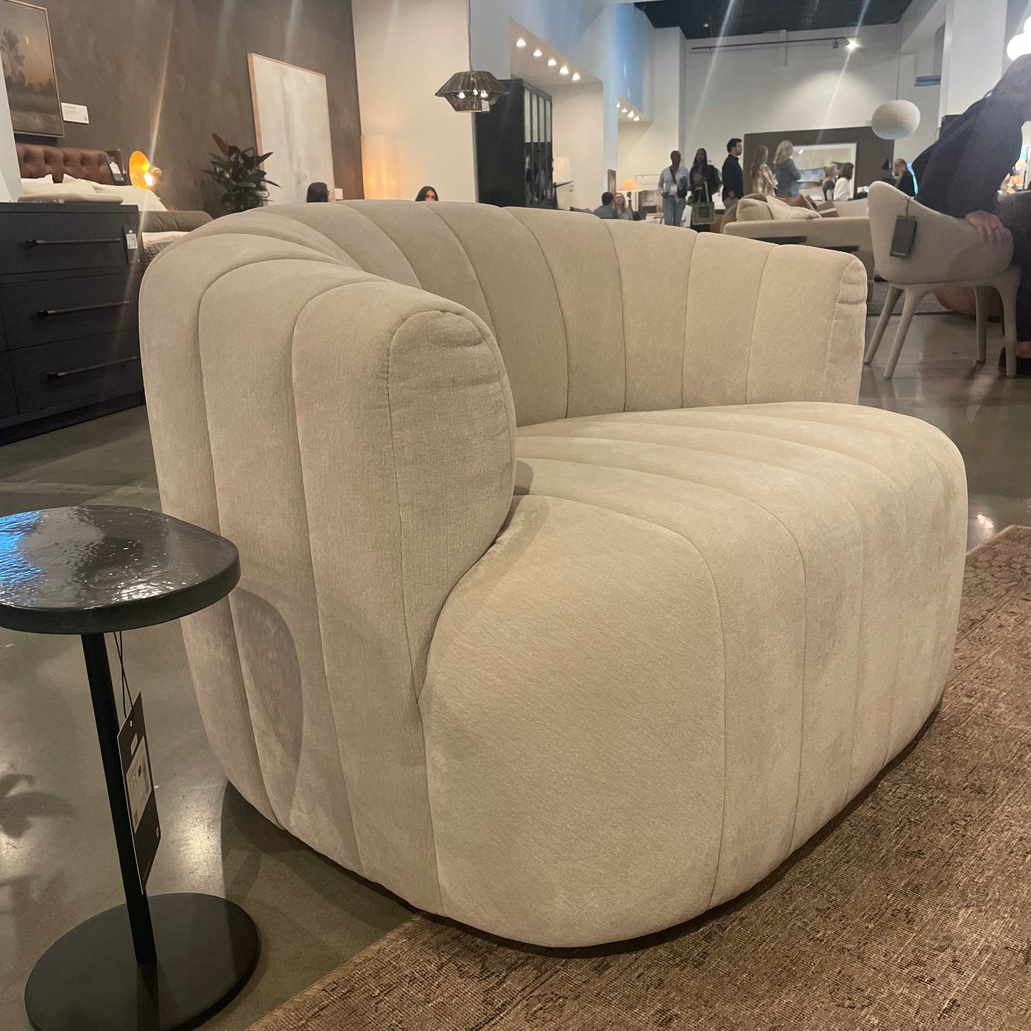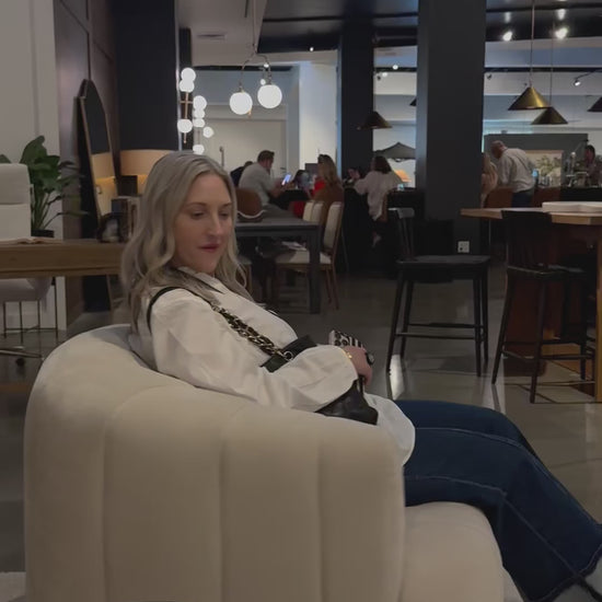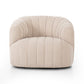 The Elliana Swivel Chair in Blamont Cream by Four Hands combines elegant curves, rich texture, and lasting durability with eco-conscious design. This chair features a contemporary 360-degree swivel, making it a versatile and stylish addition to any space.