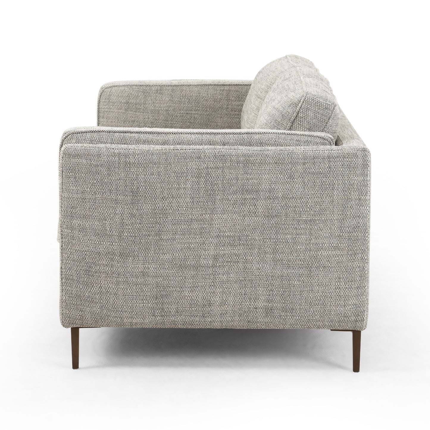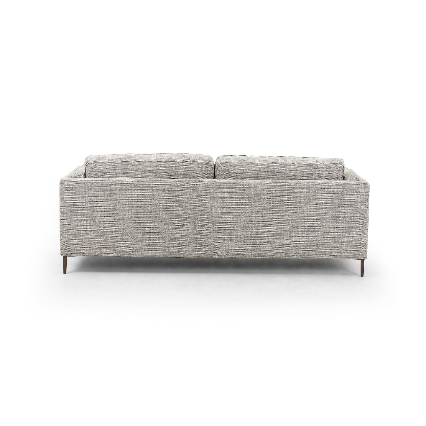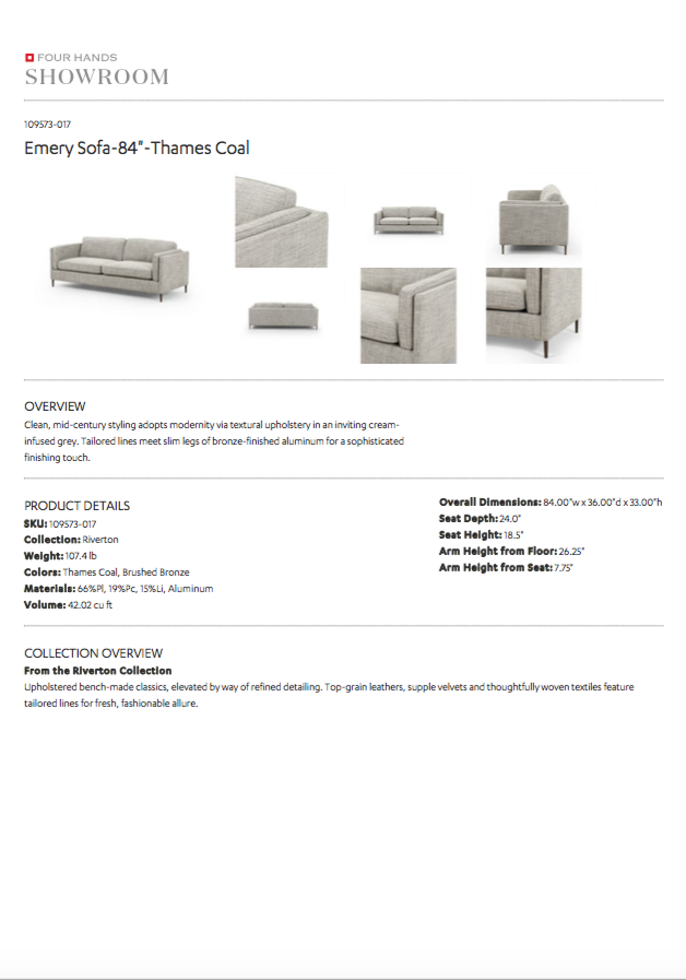 Four Hands showcases the lovely lines of the Emery Sofa in Thames Coal. Clean, mid-century styling adopts modernity via textural upholstery in an inviting cream-infused grey. Tailored lines meet slim legs of bronze-finished aluminum for a sophisticated finishing touch.