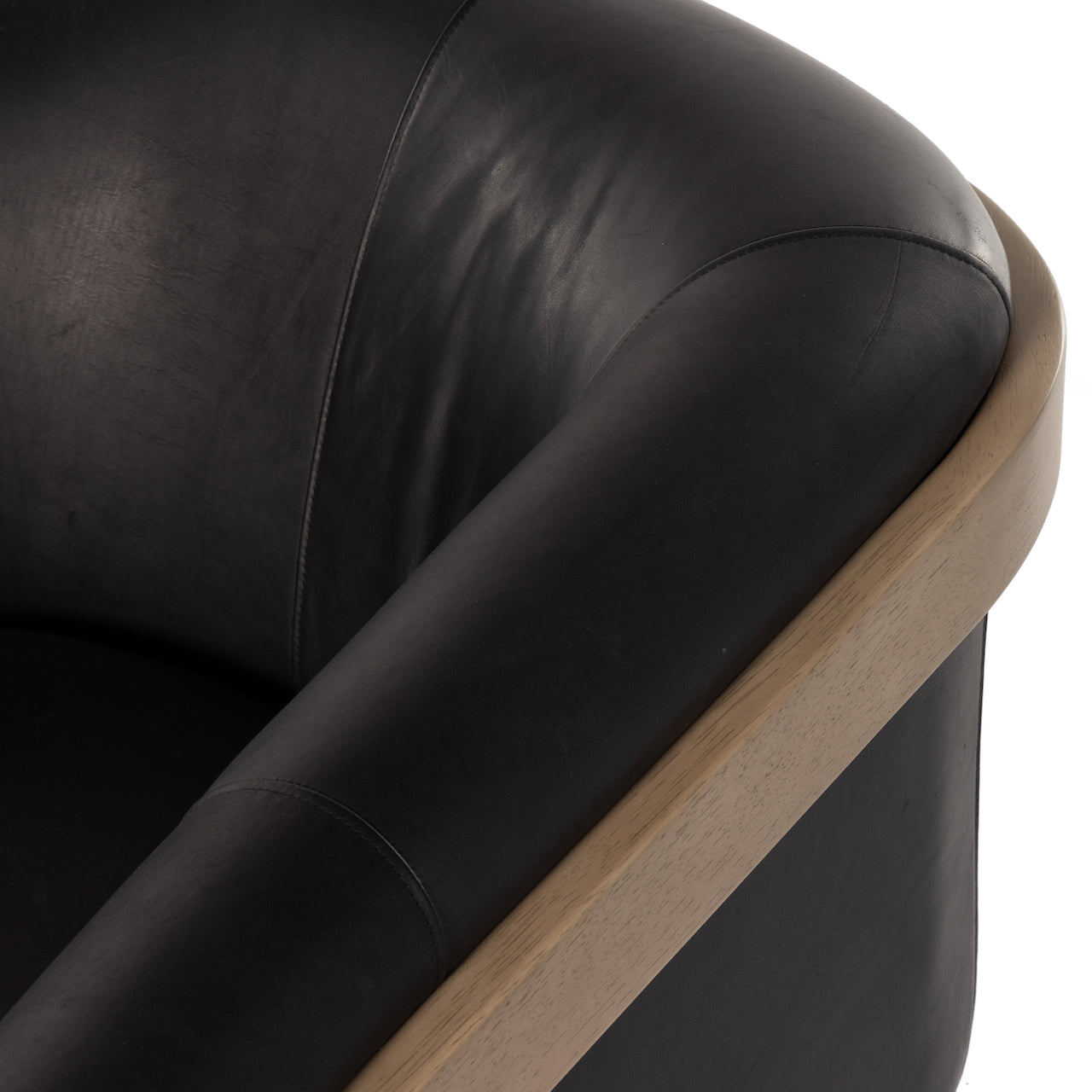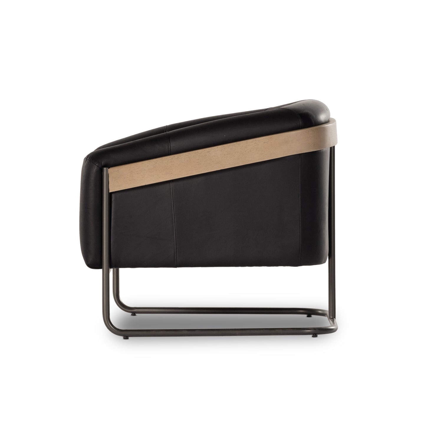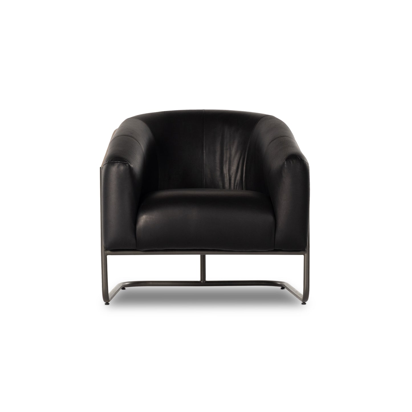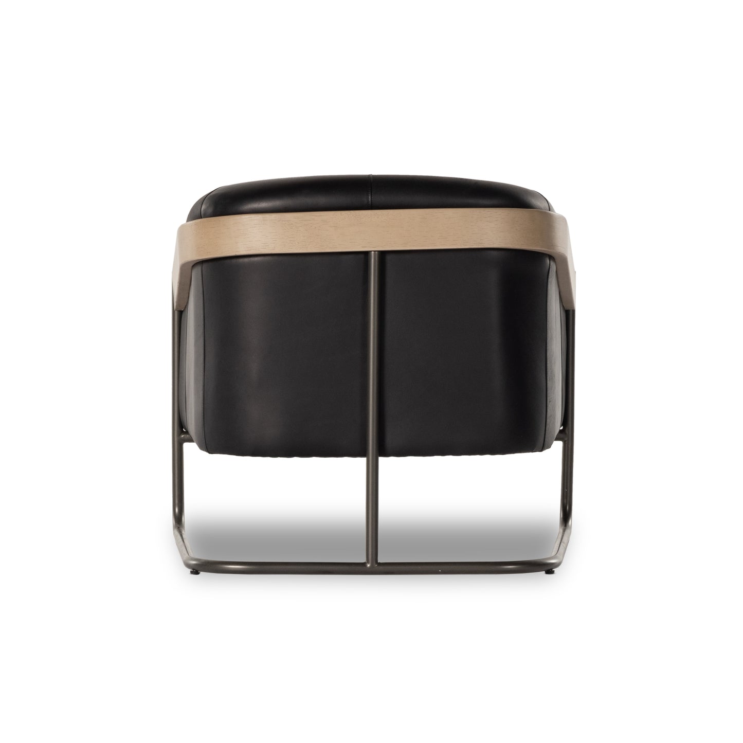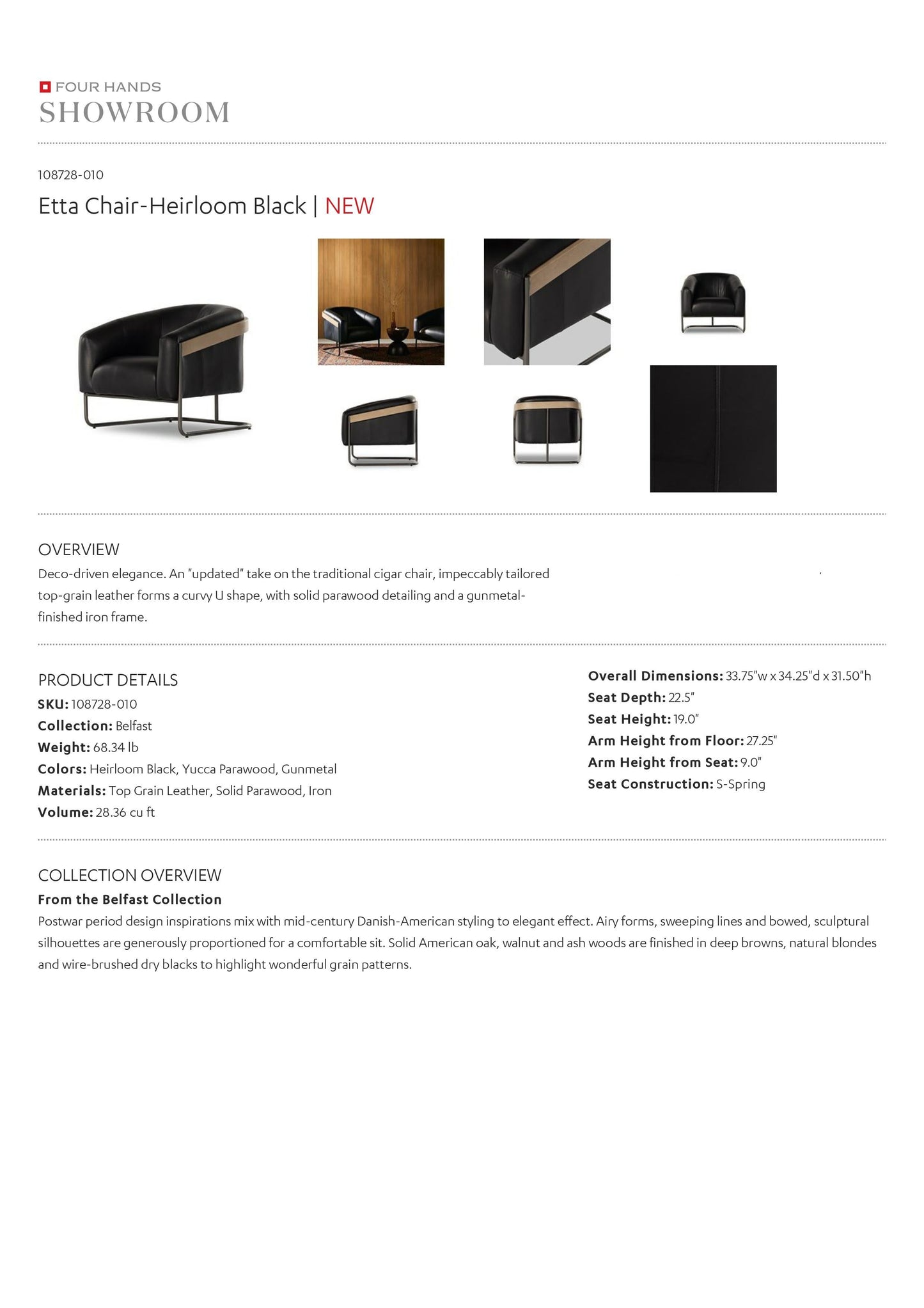 The Etta Chair in Heirloom Black from Four Hands features deco-driven elegance. A fresh take on the traditional cigar chair, impeccably tailored black top-grain leather forms a curvy U shape, with solid parawood detailing adding interest to gunmetal-finished iron framing.