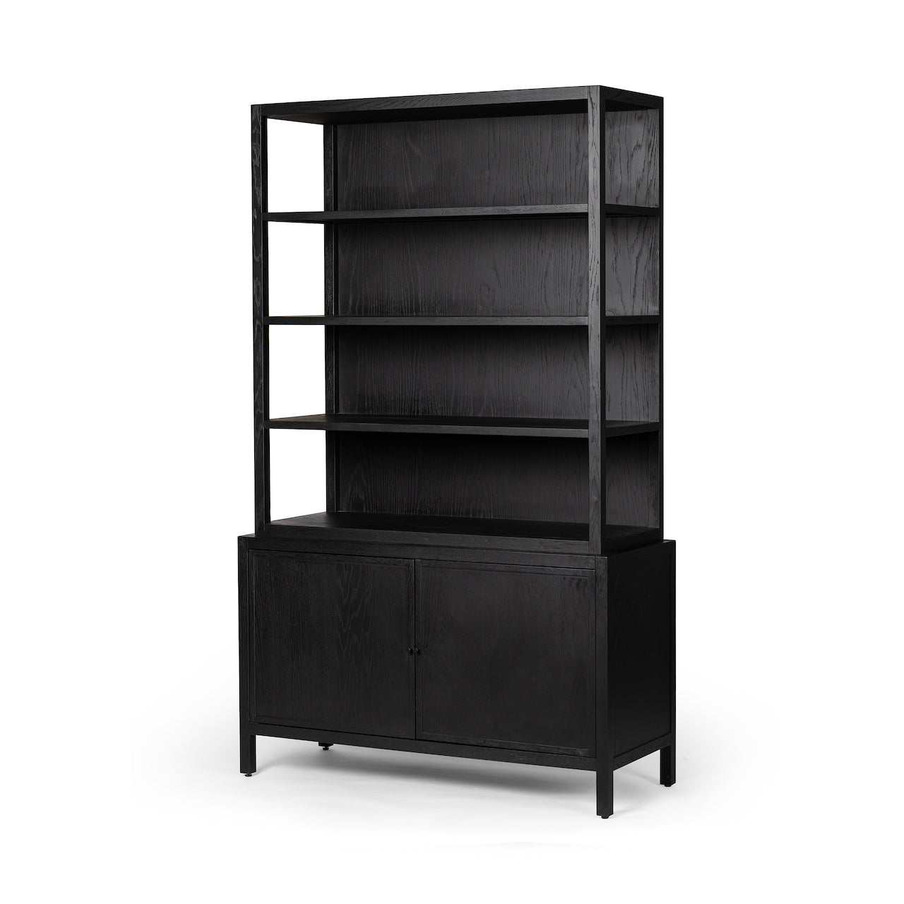 Classic and versatile, the Hopkins Bookcase from Four Hands features ebony-finished oak veneer and four spacious open shelving plus lower cabinetry for plenty of storage and display options. The Hopkins Bookcase is the perfect addition for living spaces or a home office.