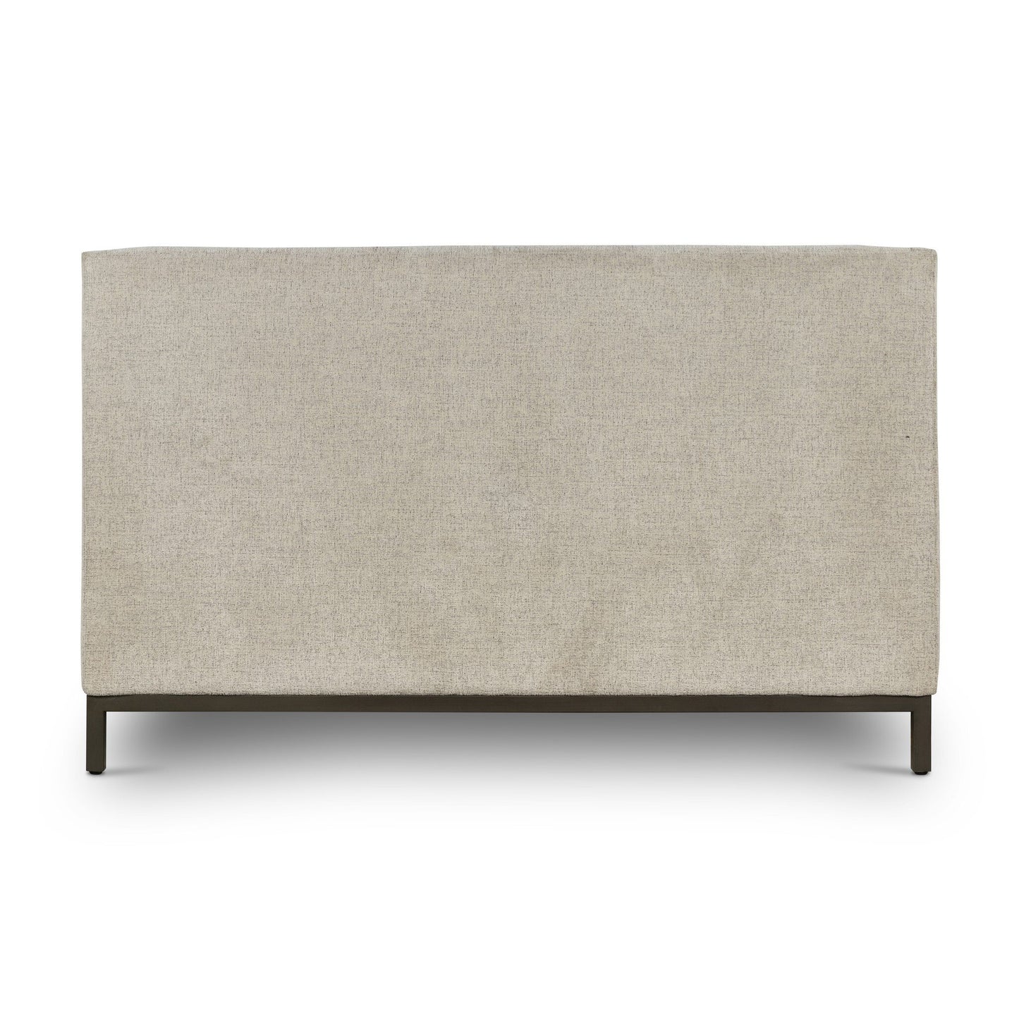 Bring subtle, modern elegance to any bedroom with the Newhall Bed in Plushtown Linen from Four Hands. A low, tufted headboard in a neutral, chenille-like covering pairs with a simple gunmetal iron base.