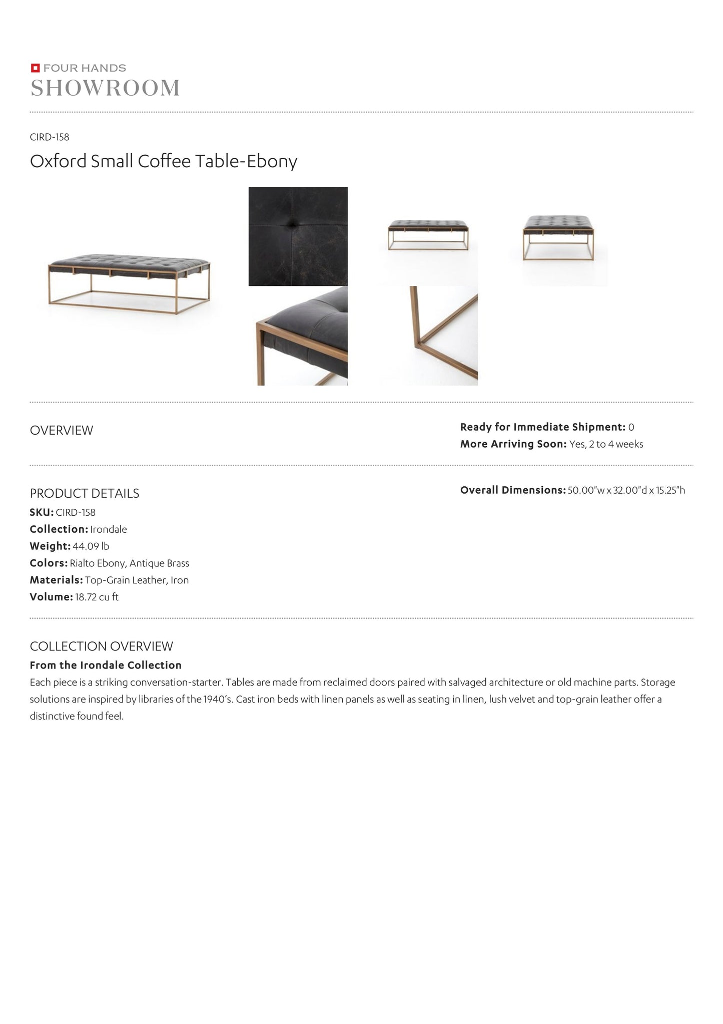 Balancing dramatic scale, the square Oxford Coffee Table from Four Hands features a sturdy open metal base. The comfortable cushion top is covered in an ebony top grain leather for easy to clean great looking design.