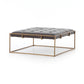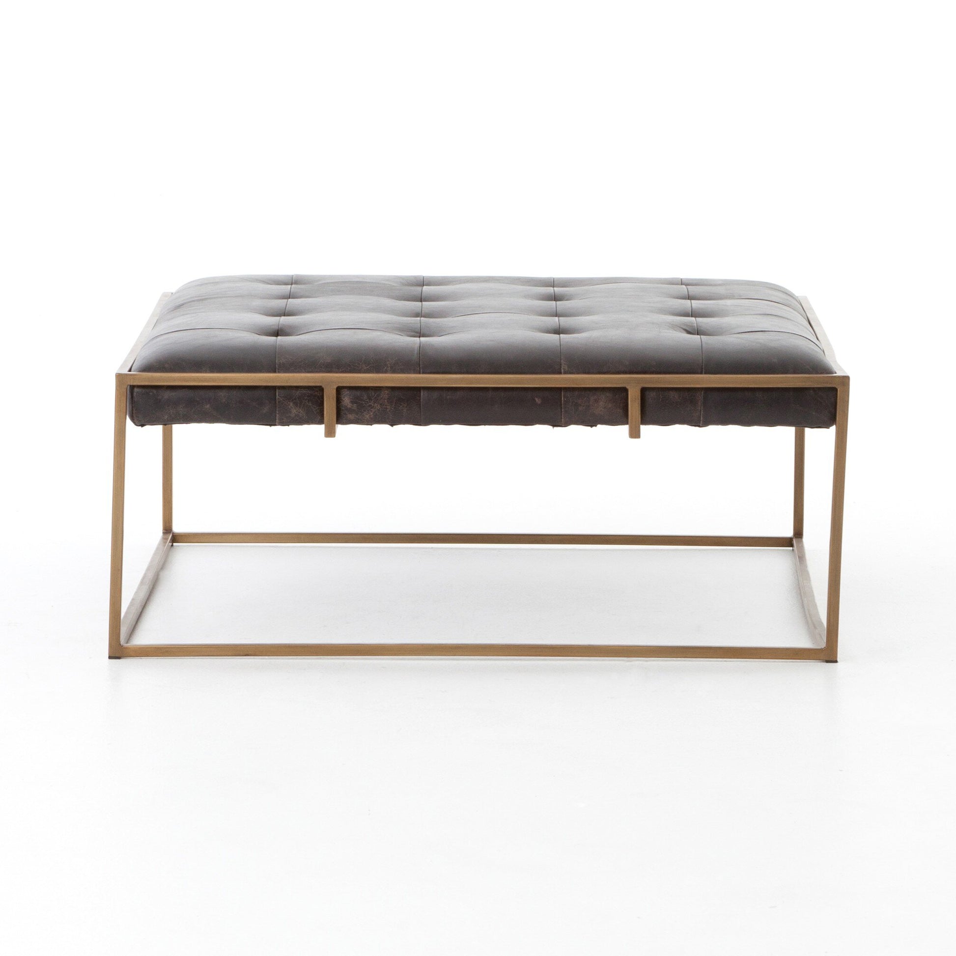 Balancing dramatic scale, the square Oxford Coffee Table from Four Hands features a sturdy open metal base.  The comfortable cushion top is covered in an ebony top grain leather for easy to clean great looking design.