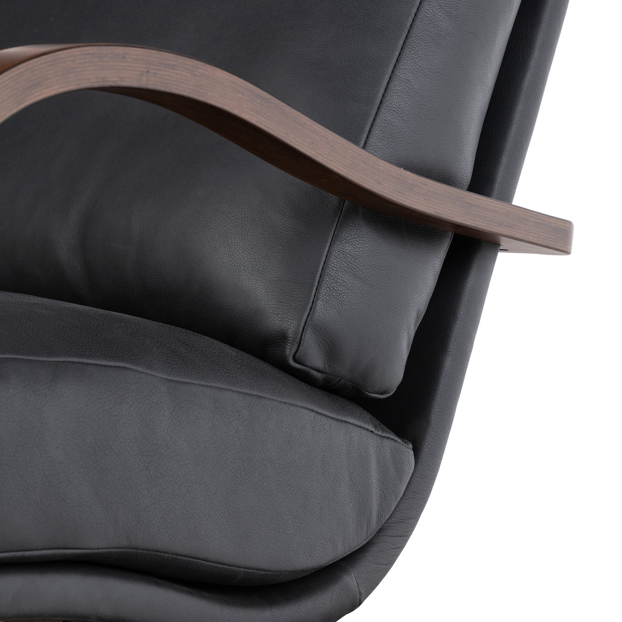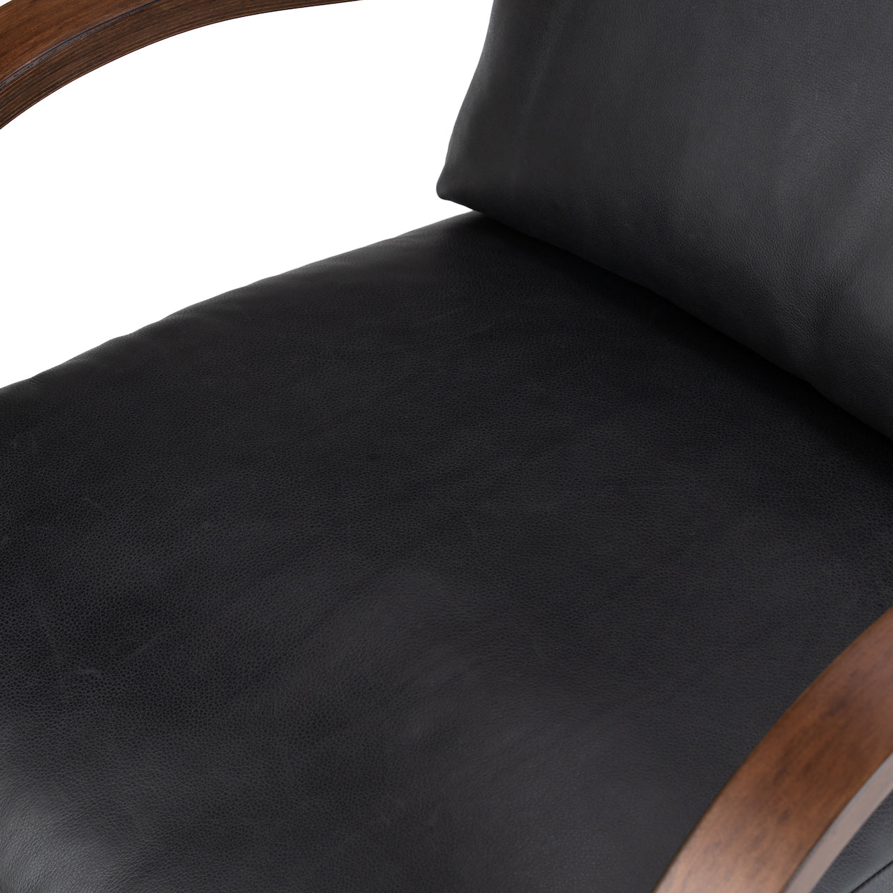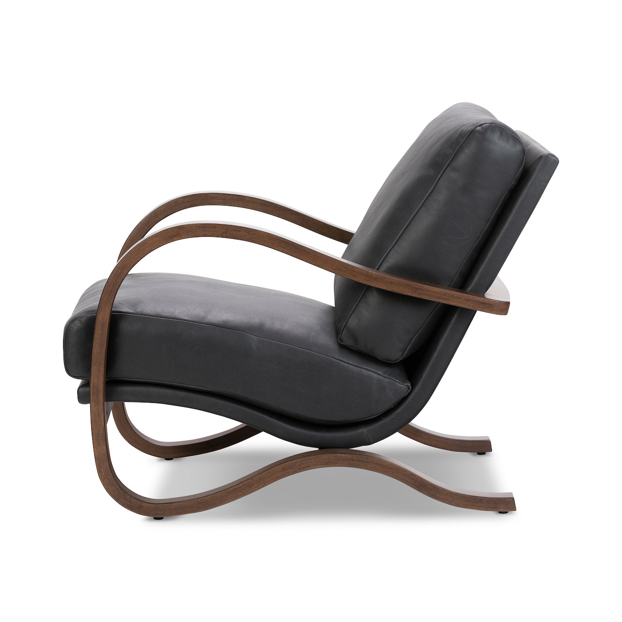 Inspired by vintage rocking chairs, the whimsical frame of the Paxon Chair in Brickhouse Black from Four Hands hugs removable plush feather foam-blend cushions on a webbed suspension style construction for true sink-in comfort. Cushions are upholstered in supple Brazilian-made leather with a rich grain structure throughout for added character.