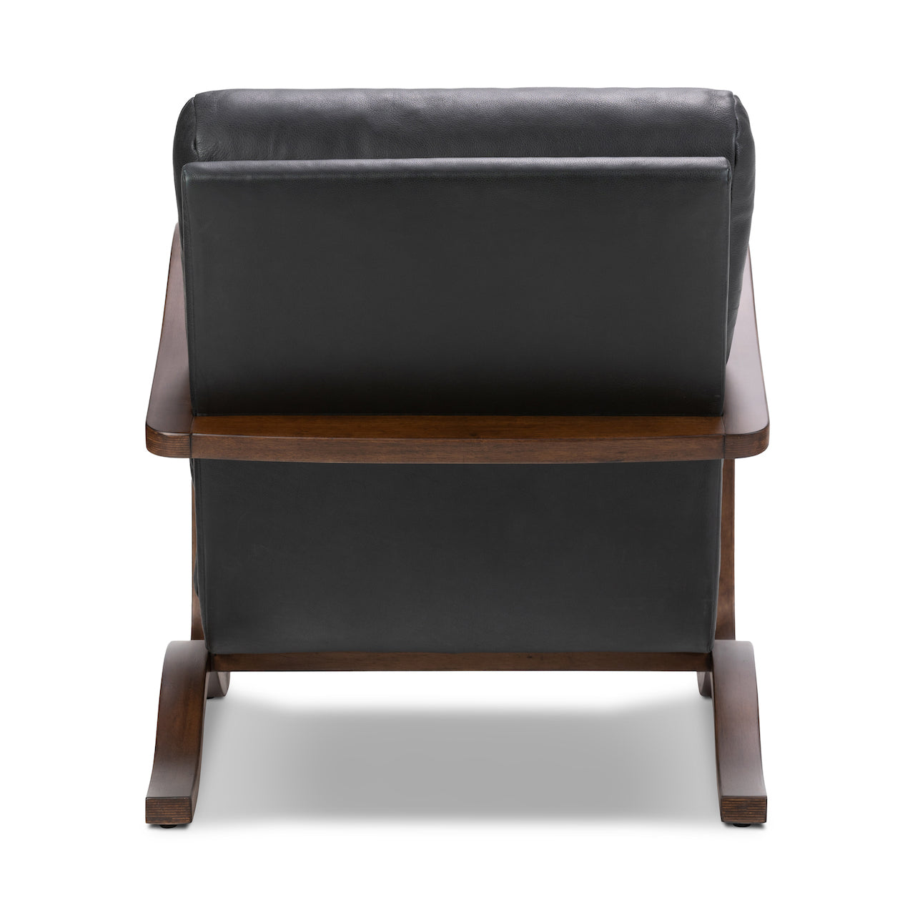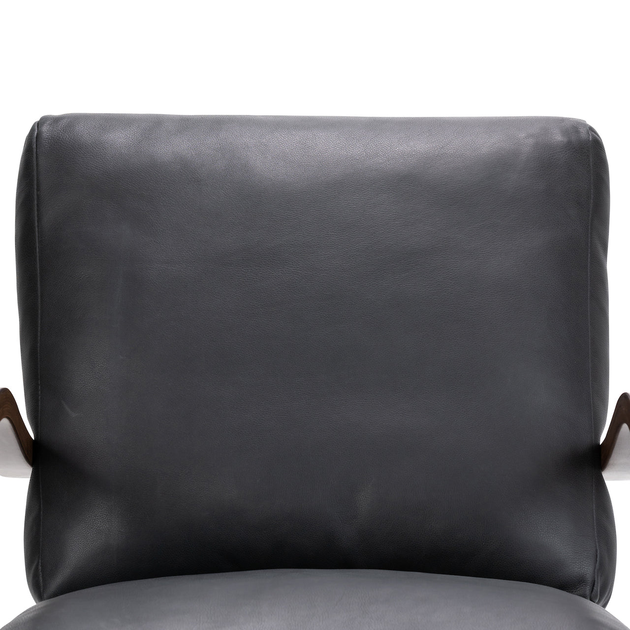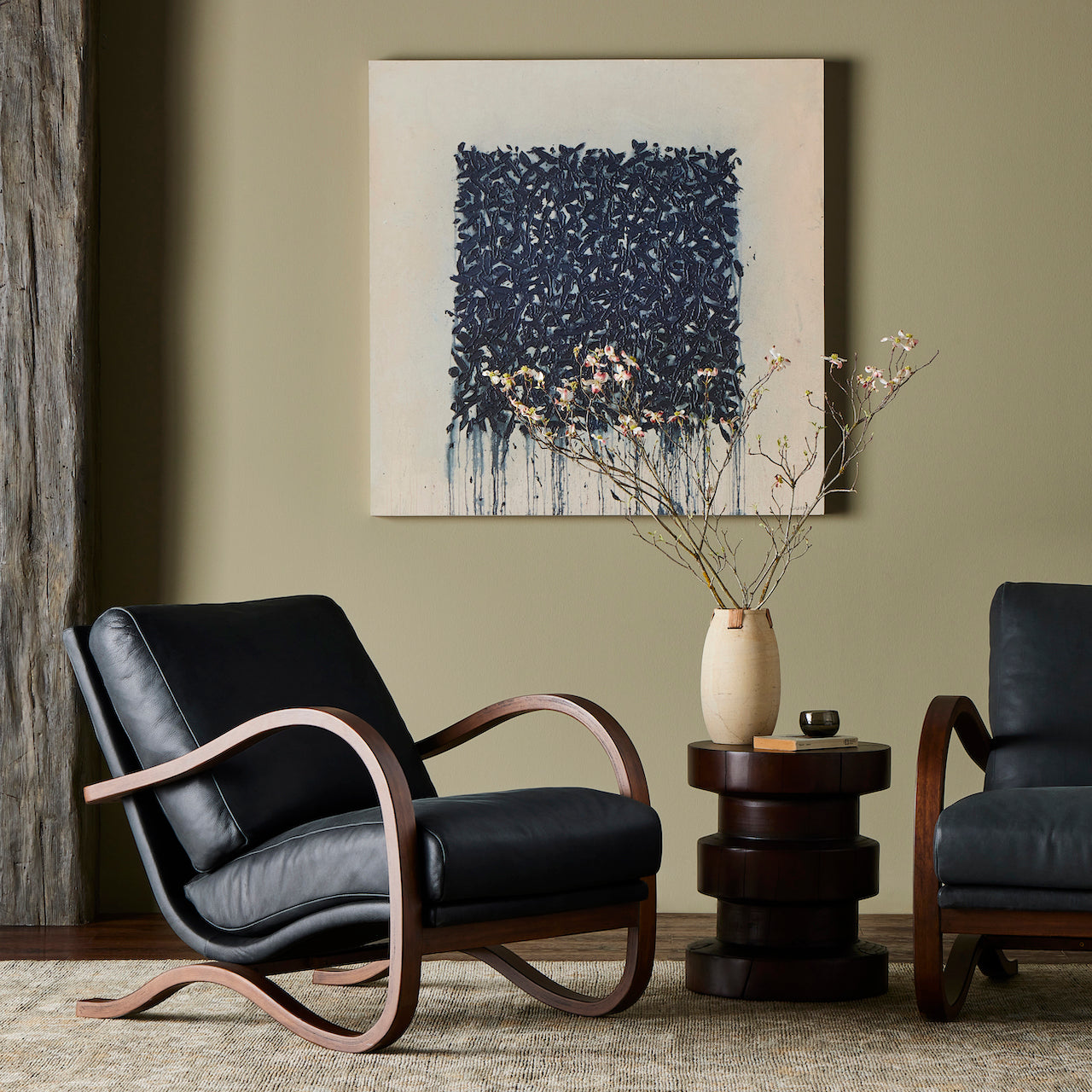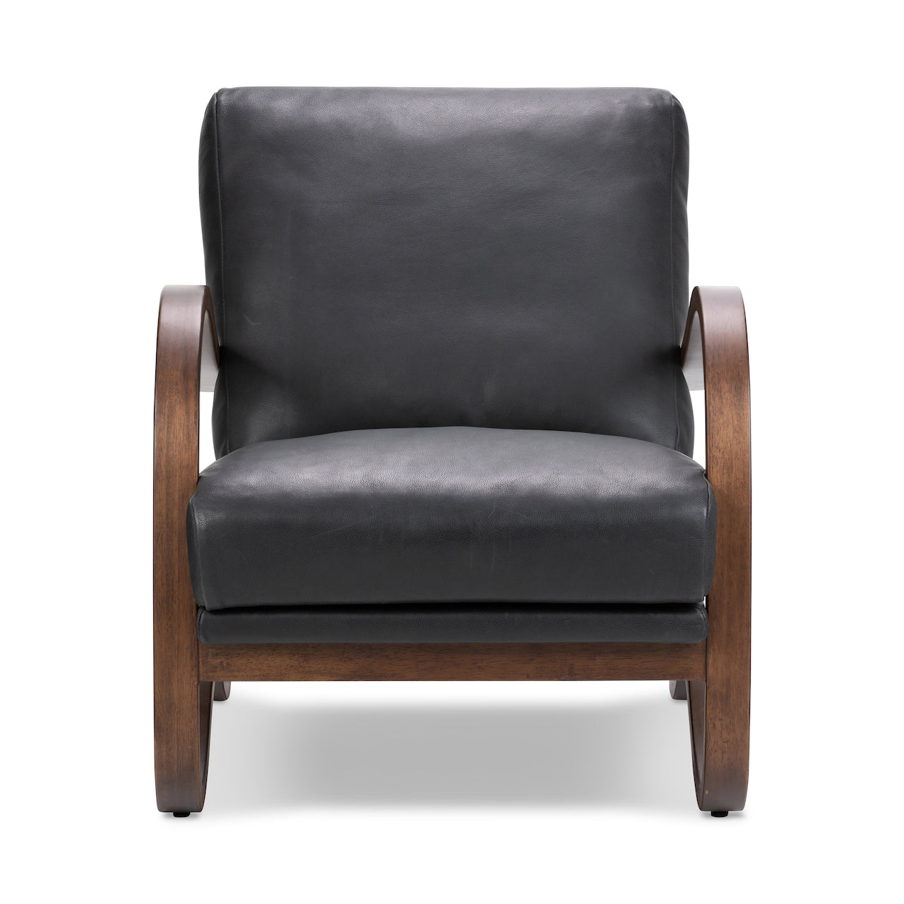 Inspired by vintage rocking chairs, the whimsical frame of the Paxon Chair in Brickhouse Black from Four Hands hugs removable plush feather foam-blend cushions on a webbed suspension style construction for true sink-in comfort. Cushions are upholstered in supple Brazilian-made leather with a rich grain structure throughout for added character.