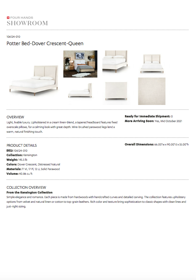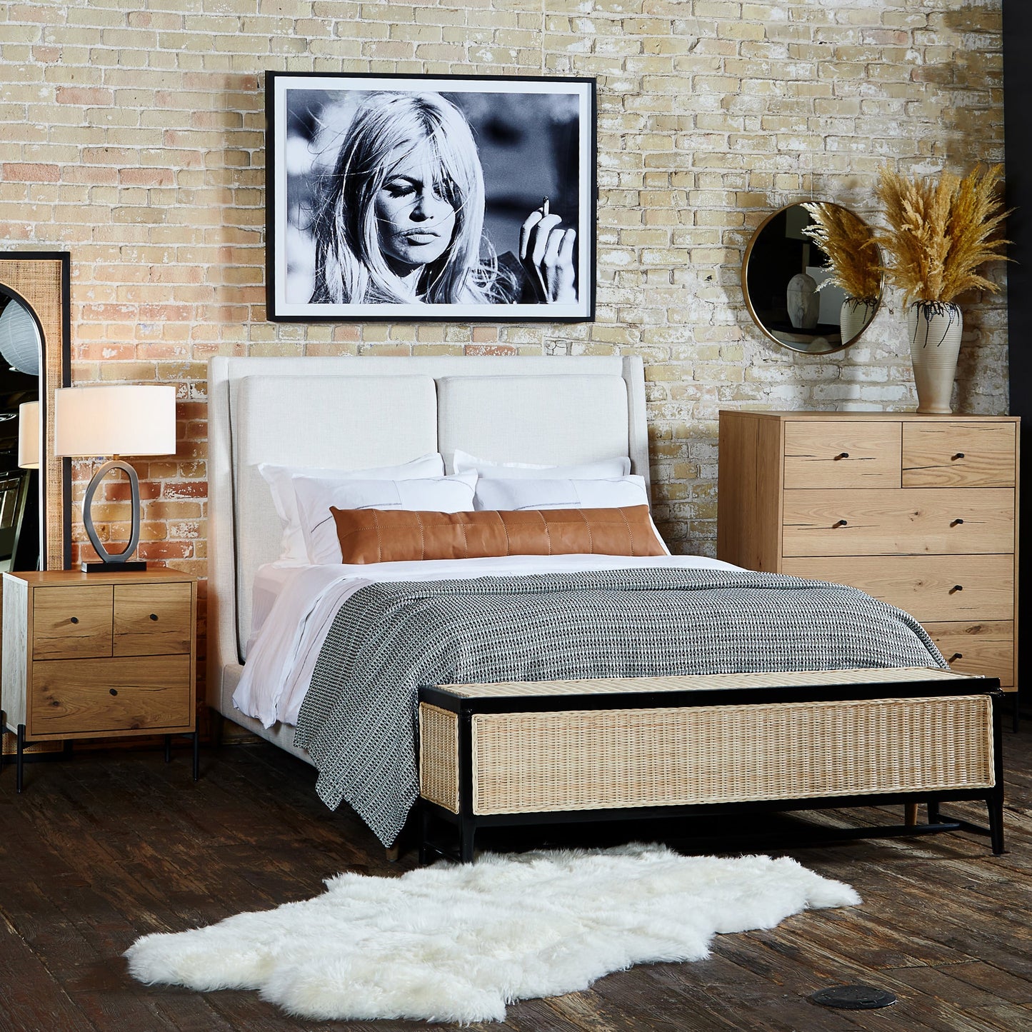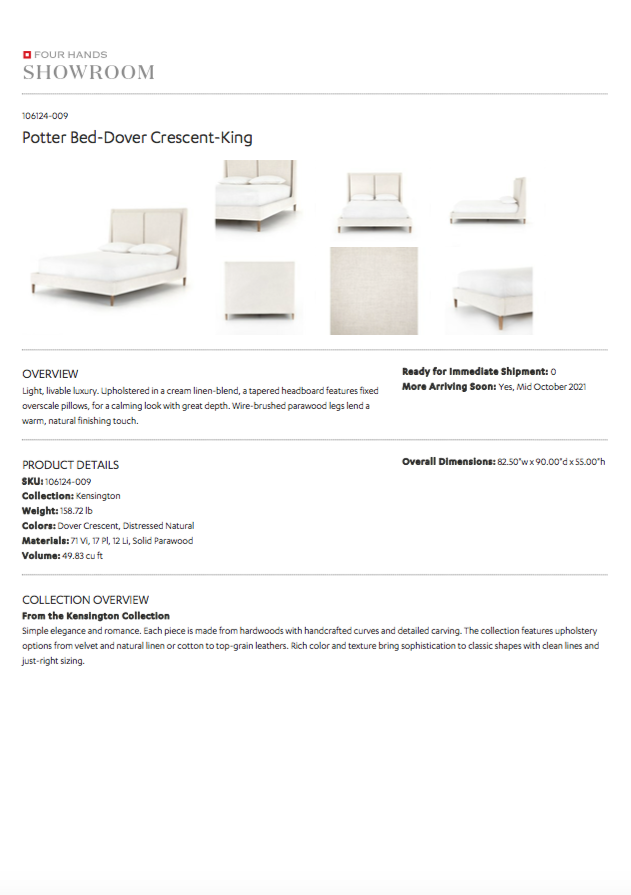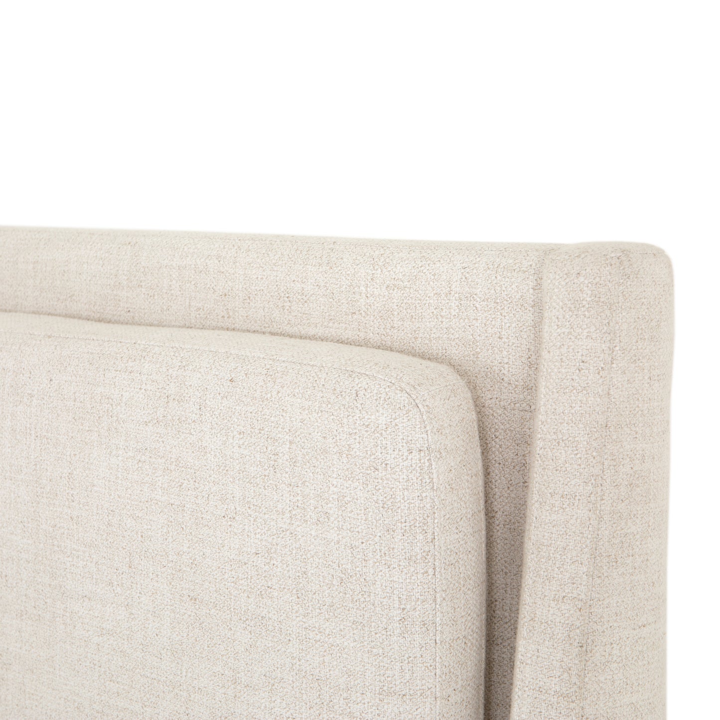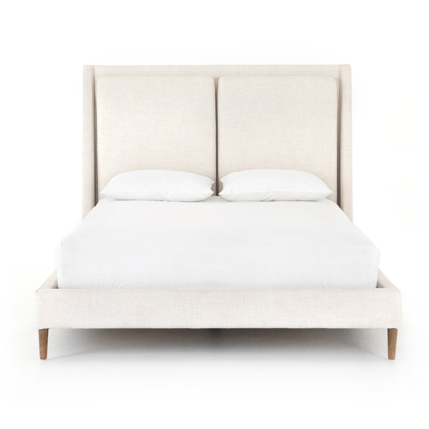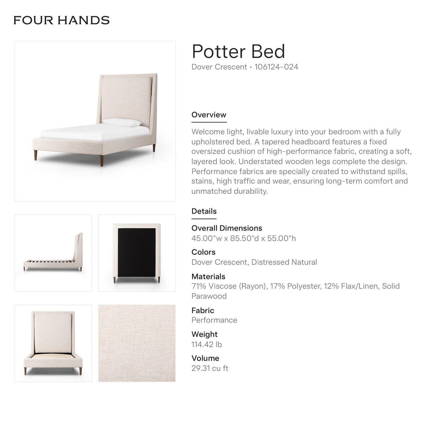 Light, livable luxury. Upholstered in a cream linen-blend, the Potter Bed in Dover Crescent from Four Hands features a tapered headboard with fixed overscale pillows, for a calming look with great depth. Wire-brushed parawood legs lend a warm, natural finishing touch.