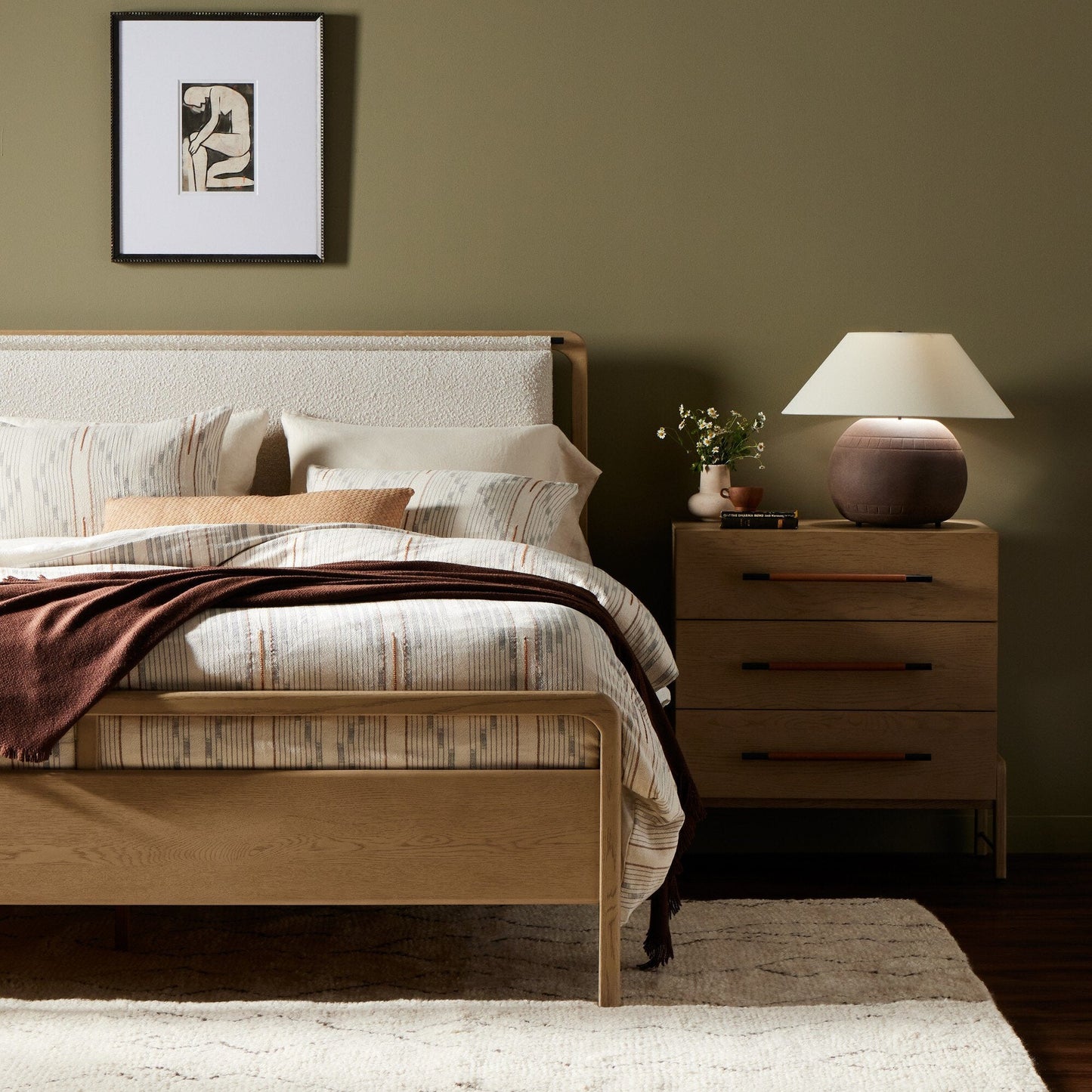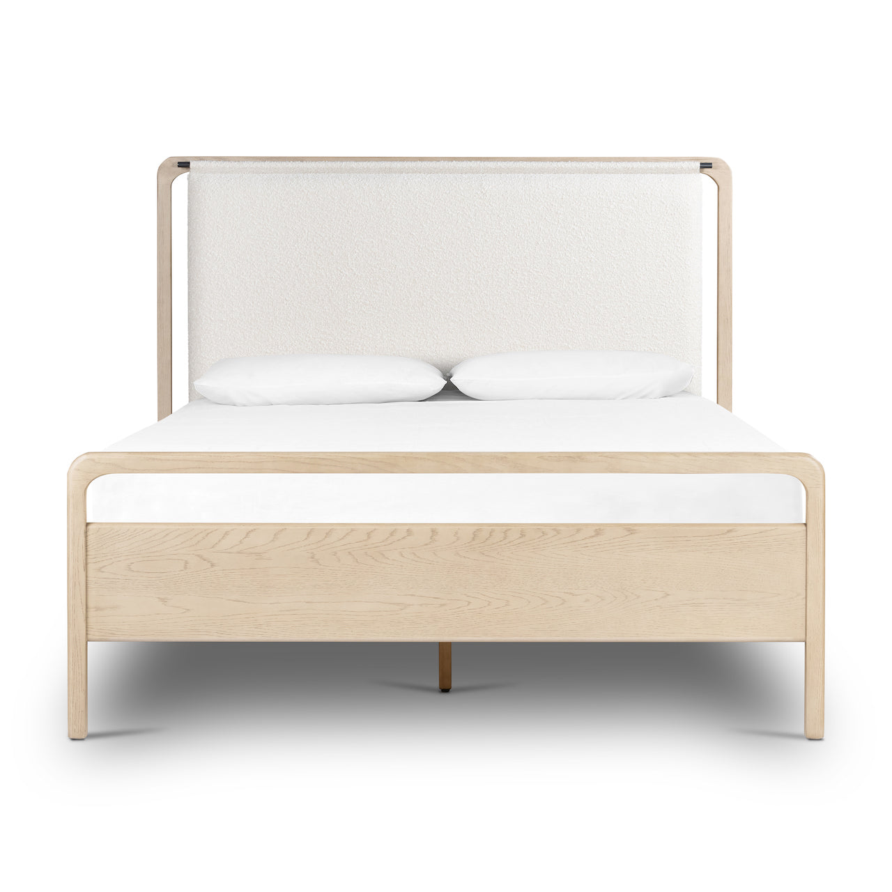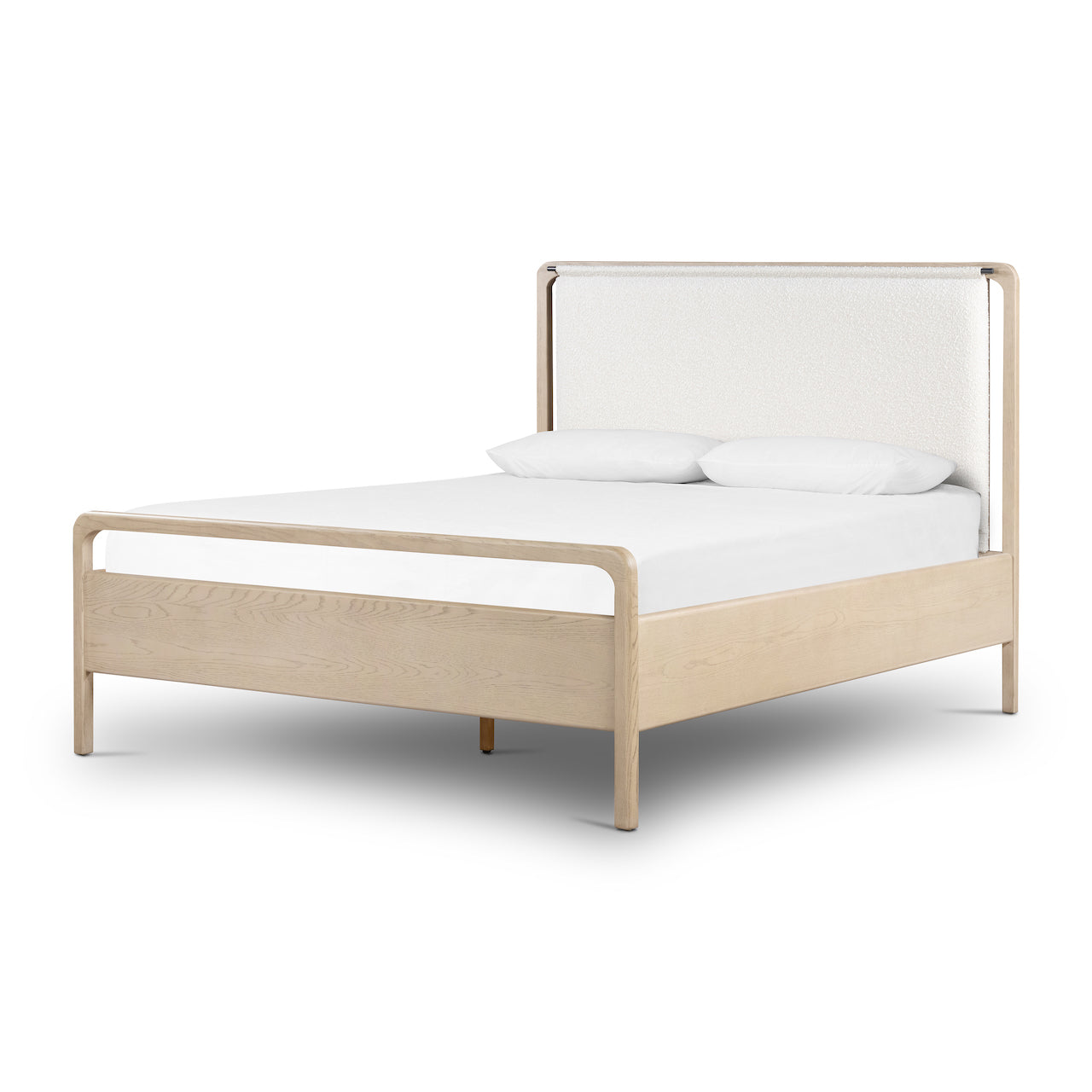 The Rosedale Bed in Yucca Oak Veneer from Four Hands is both inviting and serene. The Rosedale Bed features a yucca oak veneer frame with a knoll natural sling-style headboard, for a modern material mix and soft look. *This bed is not compatible with an adjustable mattress. *Available in King and Queen sizes.