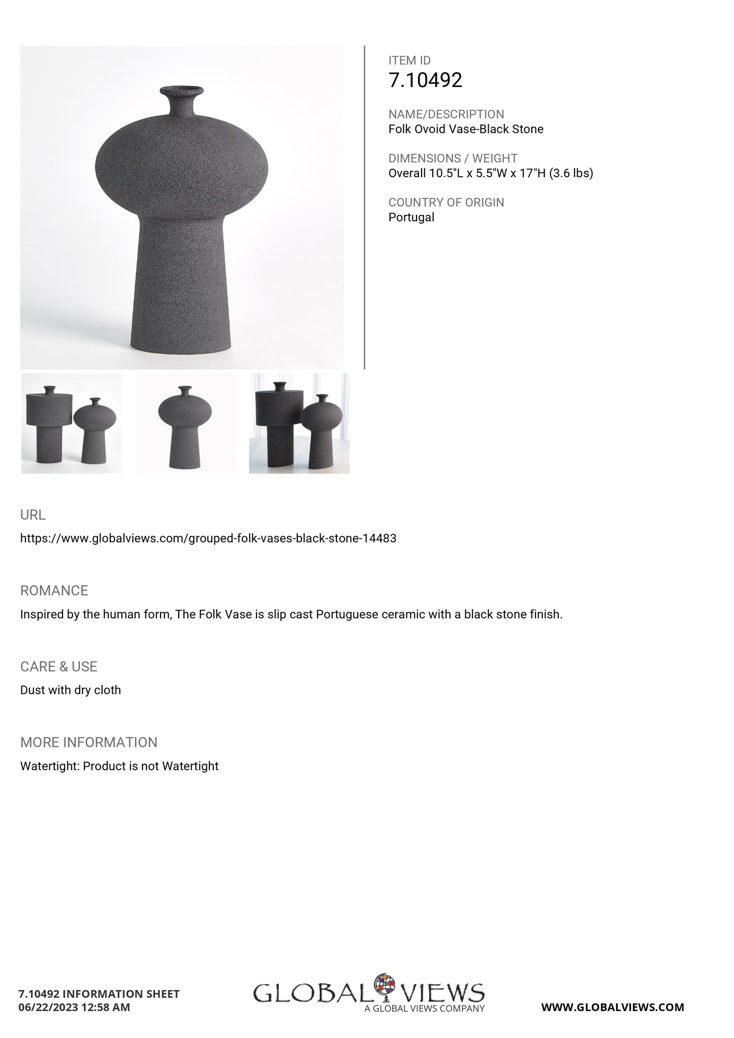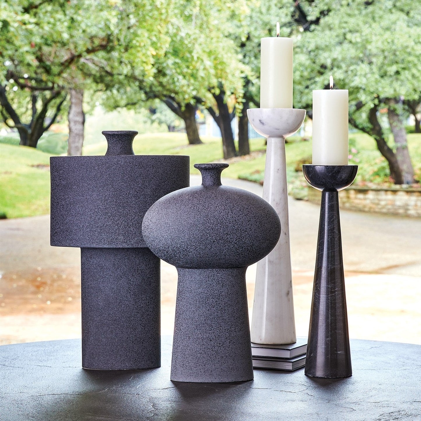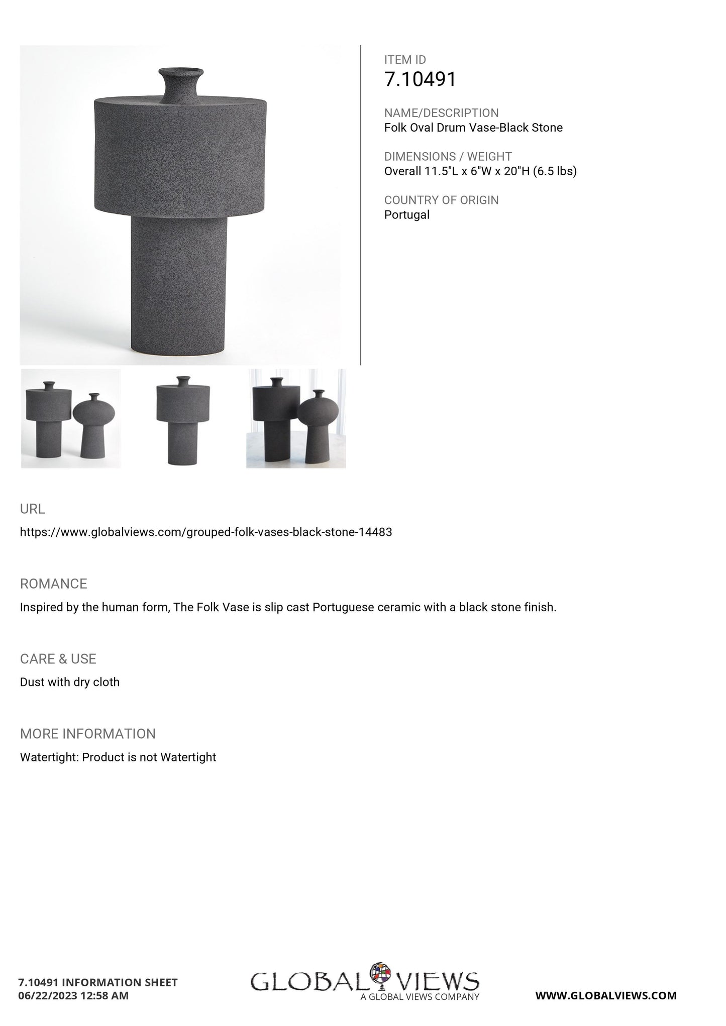 Designed with the human figure in mind, the Folk Vase Set Black Stone from Global Views is crafted from slip cast Portuguese ceramic and finished in sleek black stone. This stunning piece can stand alone as a statement or be layered in multiples to create a dramatic tablescape. Dust with dry cloth. Product is not Watertight.