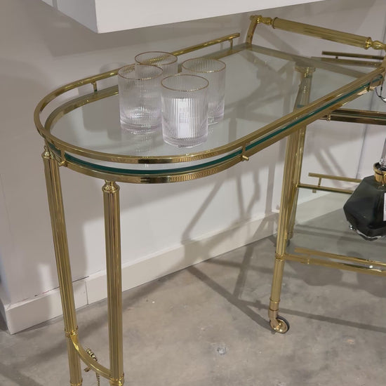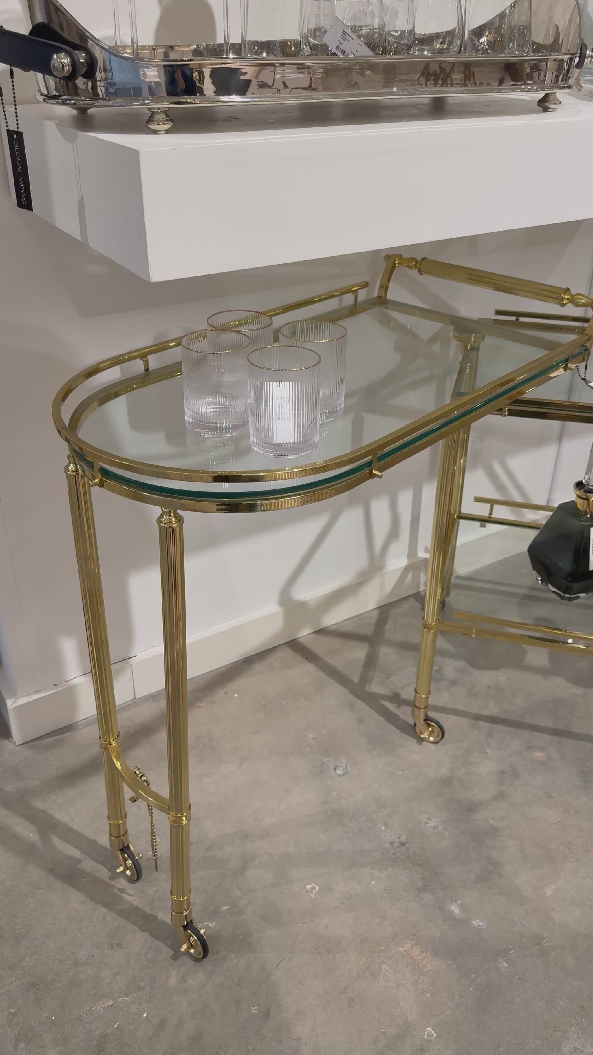 Gallery Folding Bar in Shiny Brass by Global Views features a five-legged bar cart with locking center support and 180-degree pivot capability. Smooth-rolling casters enable effortless repositioning. Decorative galleries frame dual glass shelves. Solid brass with polished finish and tempered glass surfaces.