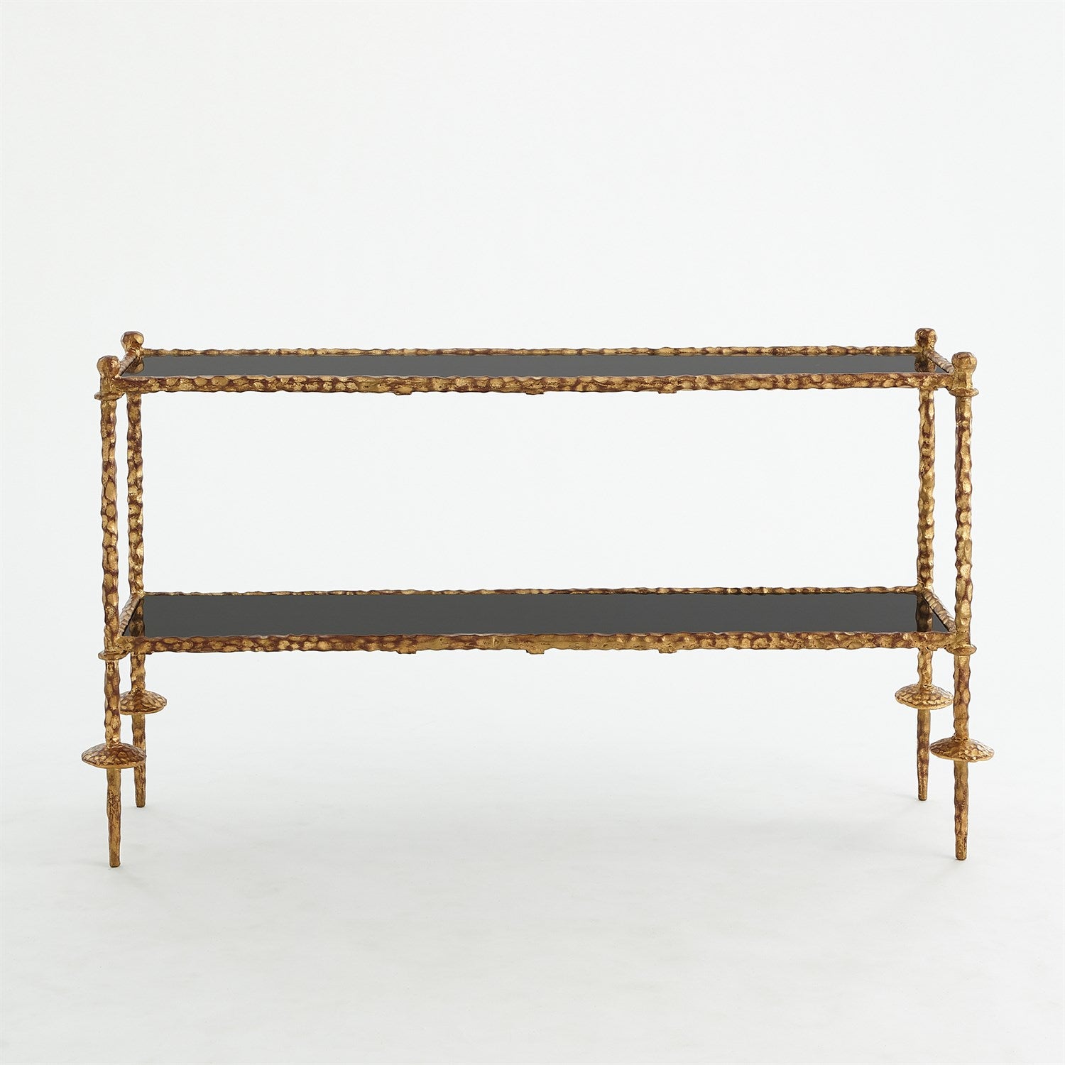The Global Views delivers the Gold Chiseled Console Black Granite, this impressively handsome wrought iron piece features a hand applied antique gold metal leaf finish and two black granite shelves. Mid-twentieth century craftsmanship is evidenced in the stunning Gold Chiseled Console from Global Views.