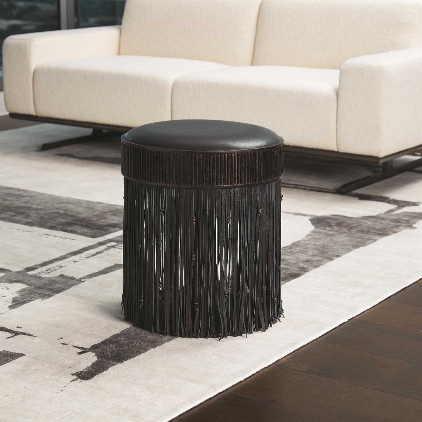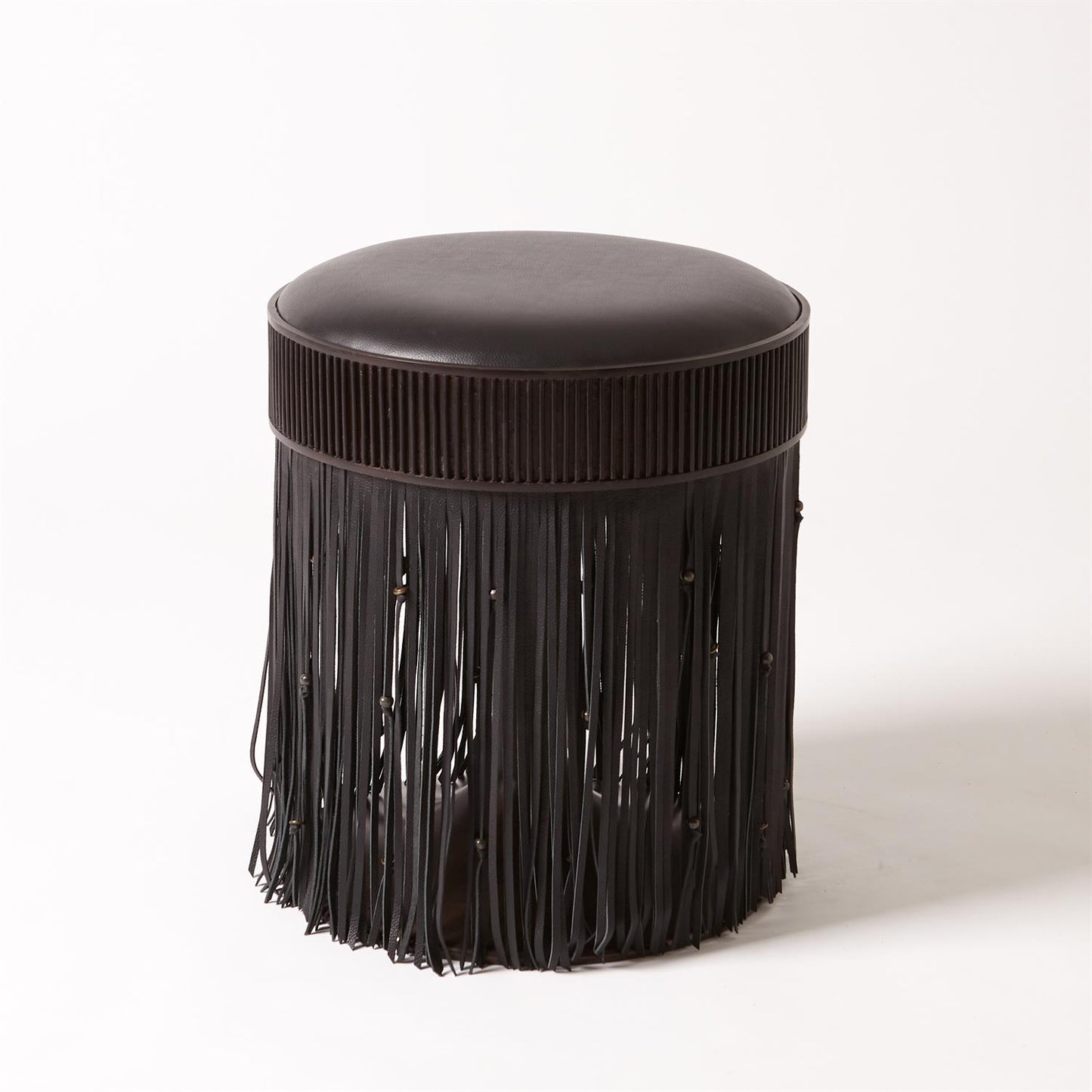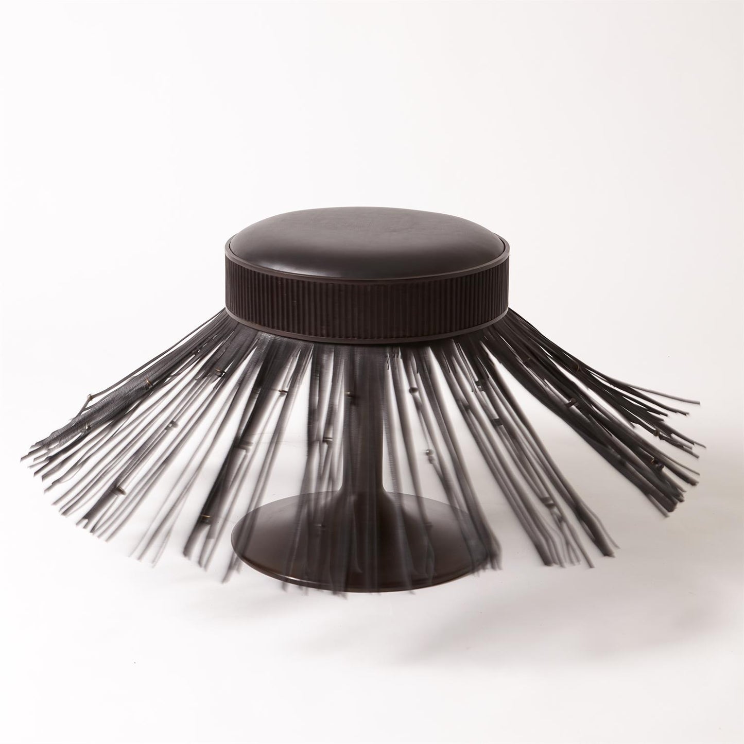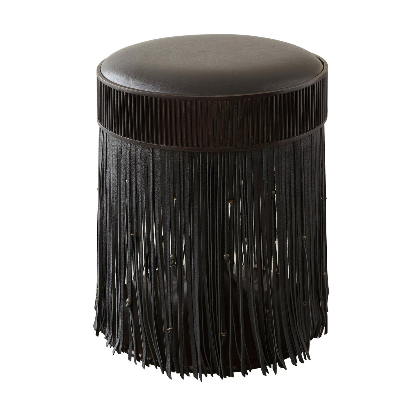 Citizen Artist's Grace Stool in Black Leather by Global Views boasts a stunning design, with knotted leather fringe and bronze discs hanging gracefully from a coin-edge frame. The padded leather seat and swivel function provide both comfort and functionality.